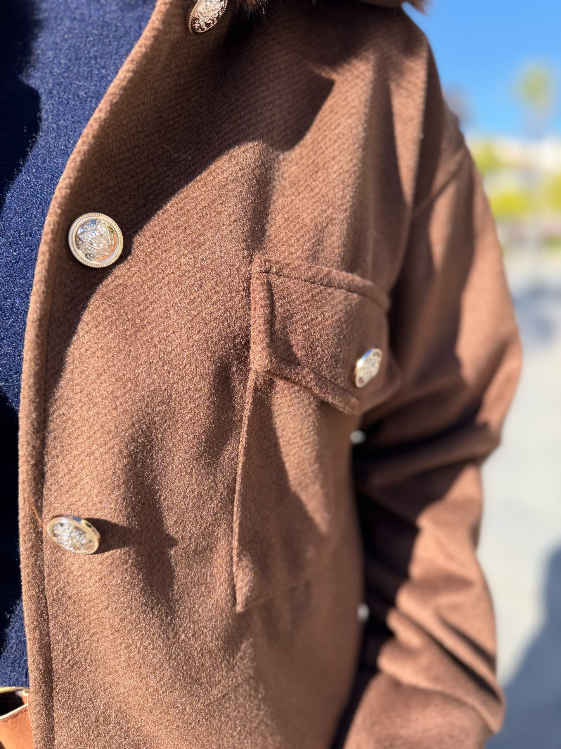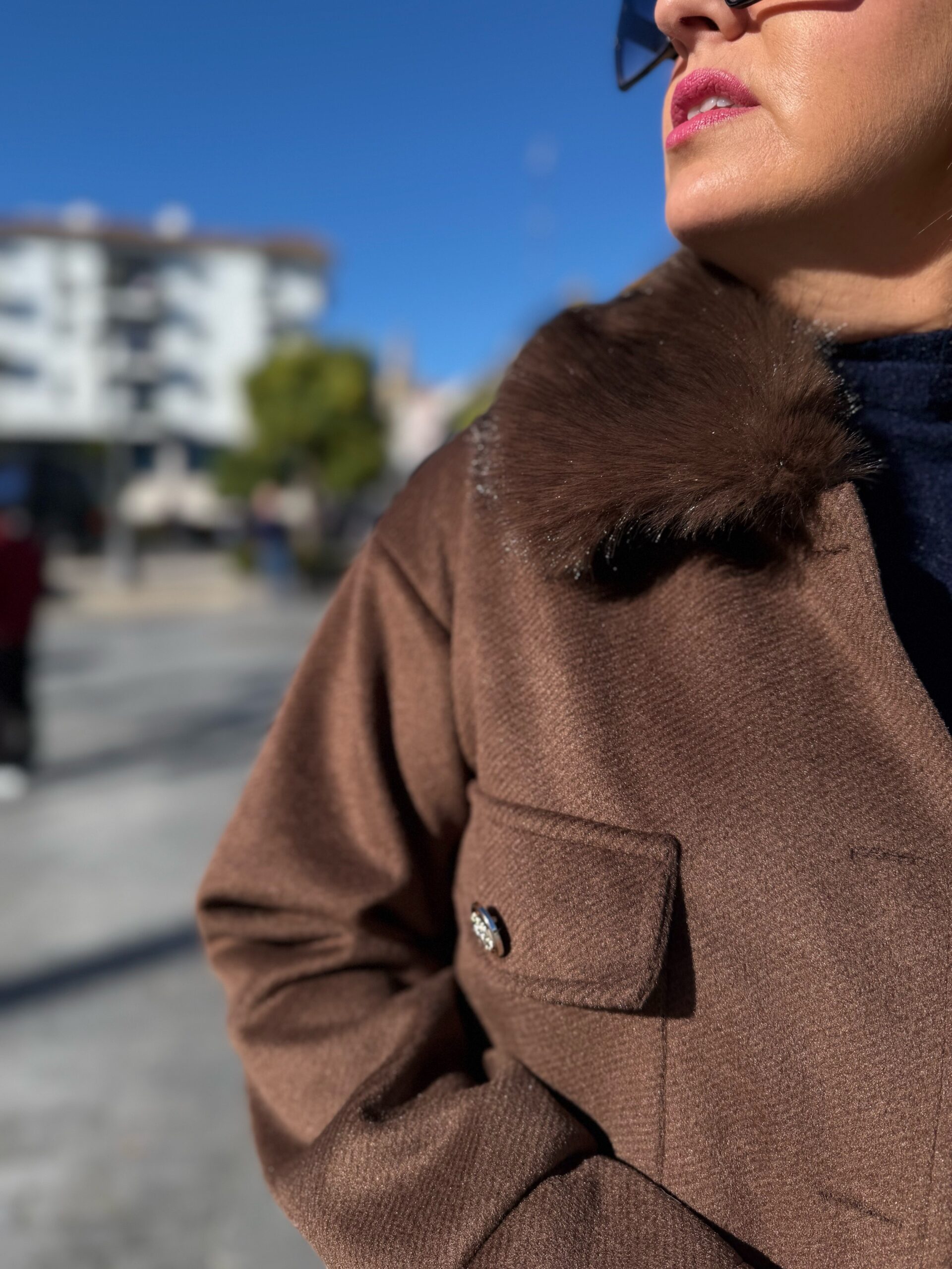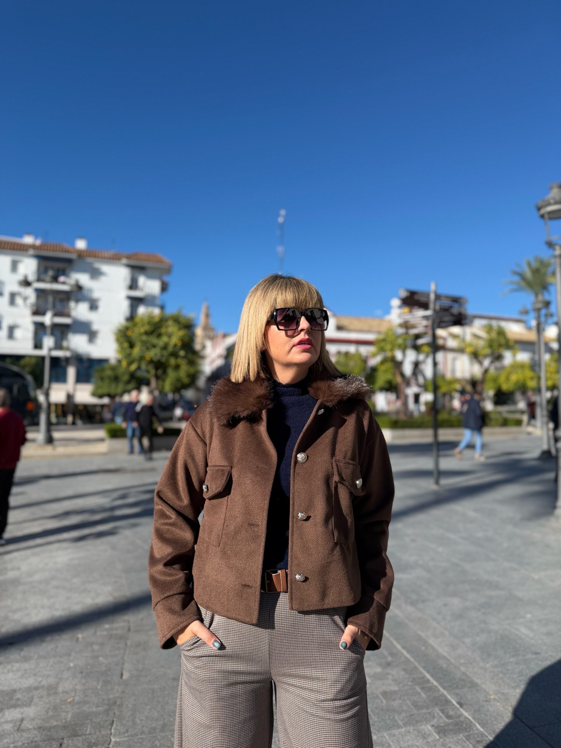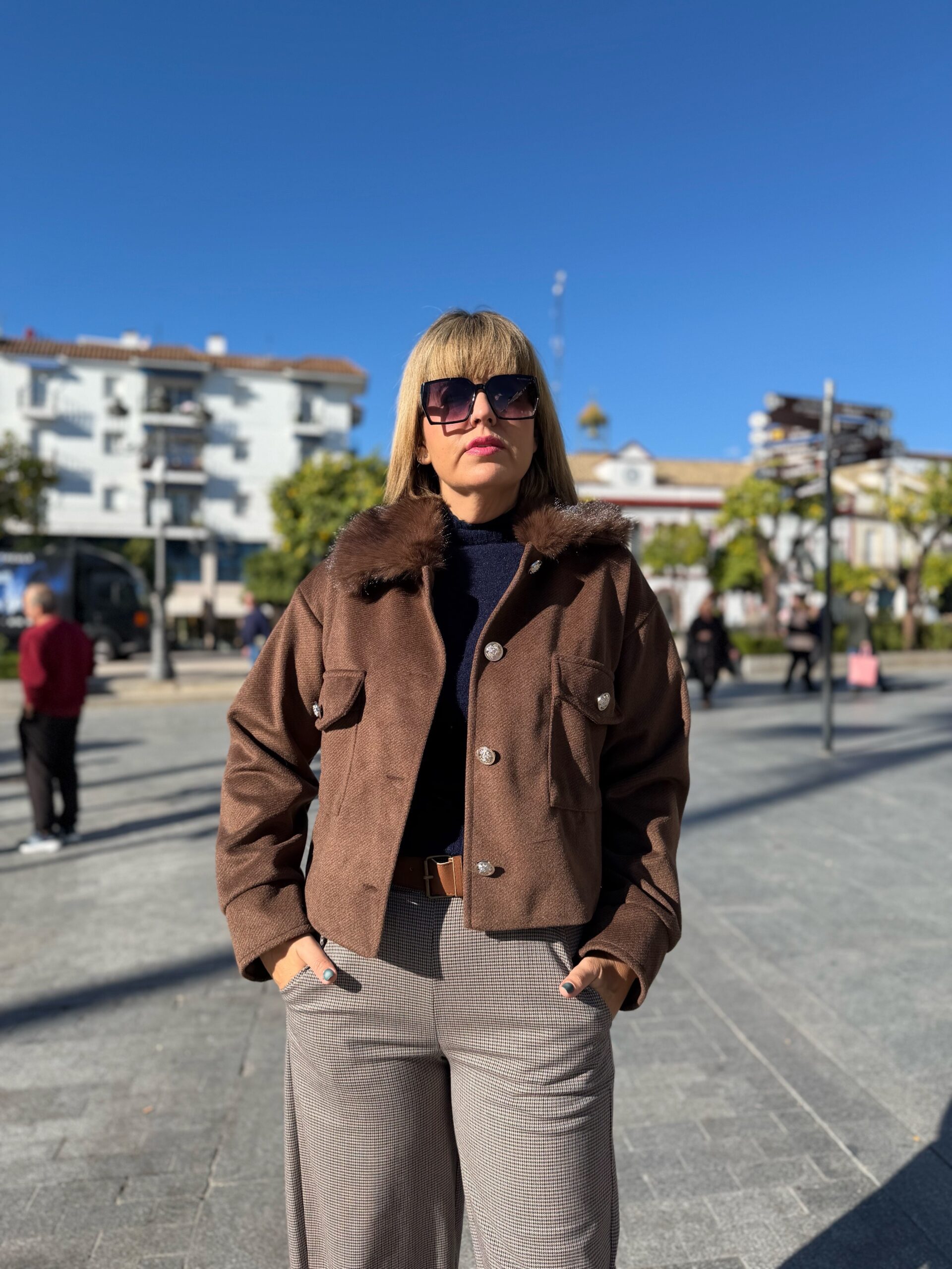 Cazadora en tejido de paño de gran calidad con cuello de pelo (no se quita) y detalle de botones dorados que le da un toque más arreglado. Es el típico abrí güito arreglado que completará tu outfit especial para estos días de fiesta que se acercan. En talla única pero adaptable a casi todas las tallas (110 ctms de contorno).