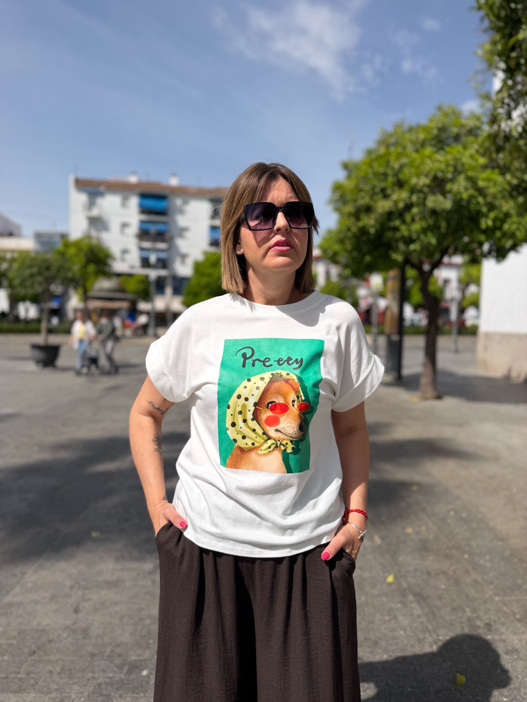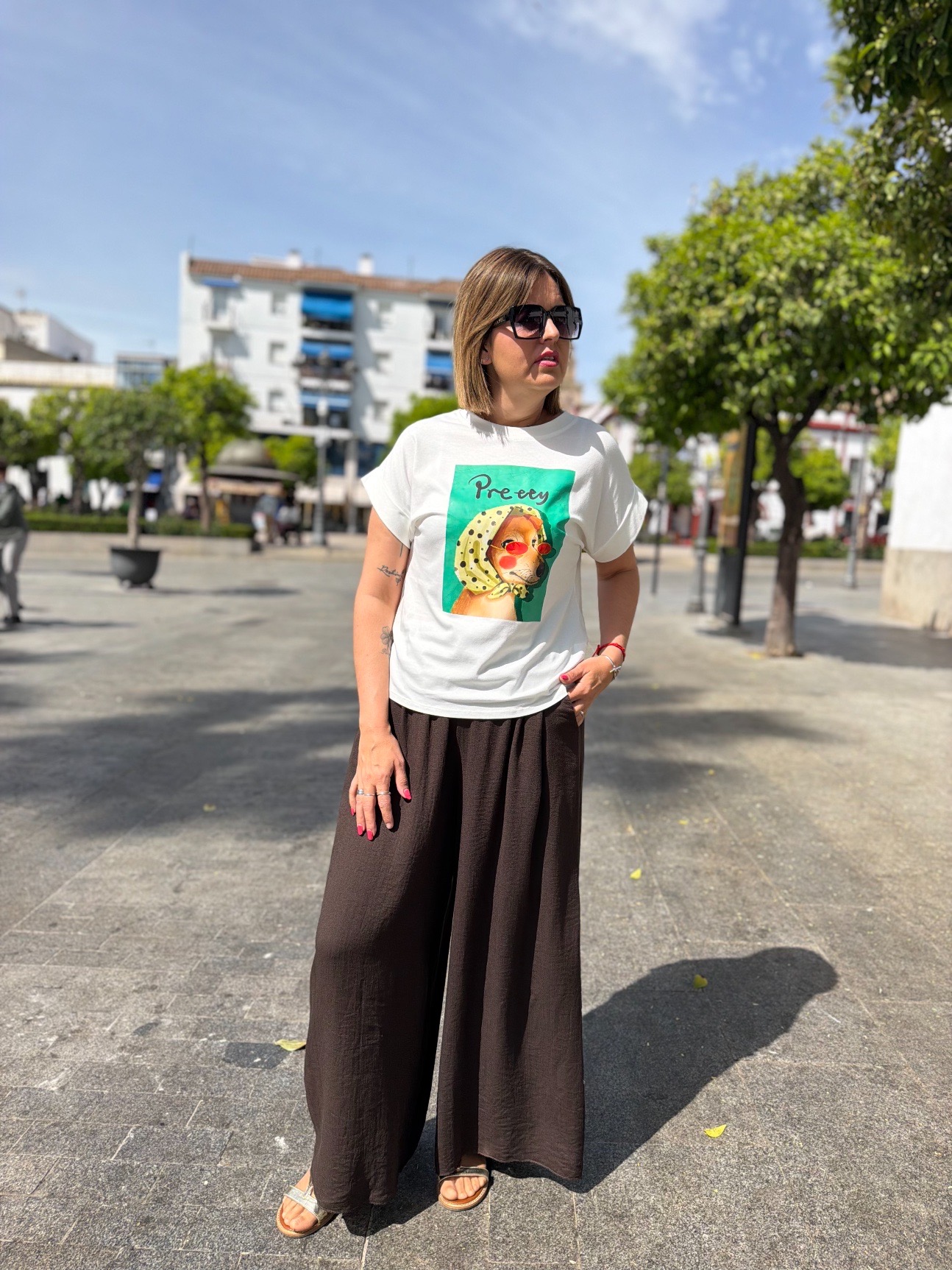 Camiseta en tejido de algodón con licra y detalle de dibujo impreso en colores muy veraniegos. En talla única pero adaptable a muchas tallas gracias a su contorno de 110 ctms.