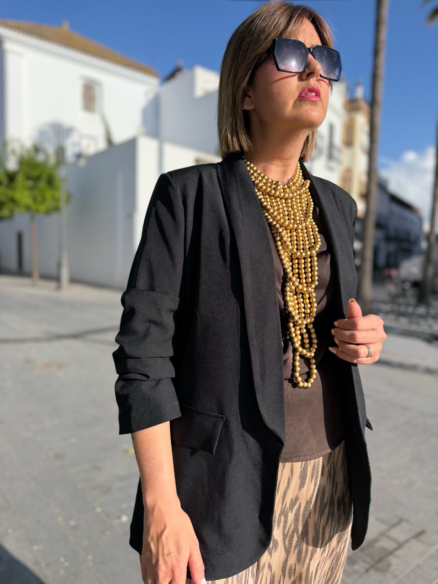 Blazer con detalle de manga fruncida ideal para el dia a dia combinándola con una camiseta y unos jeans como ha hecho nuestra compañera Sandra o Combinalo con un vestido o un pantalón de vestir para completar el outfit especial para ese día especial. En talla única pero que se adapta perfectamente a tallas desde 38na 42 (110 ctms de contorno).