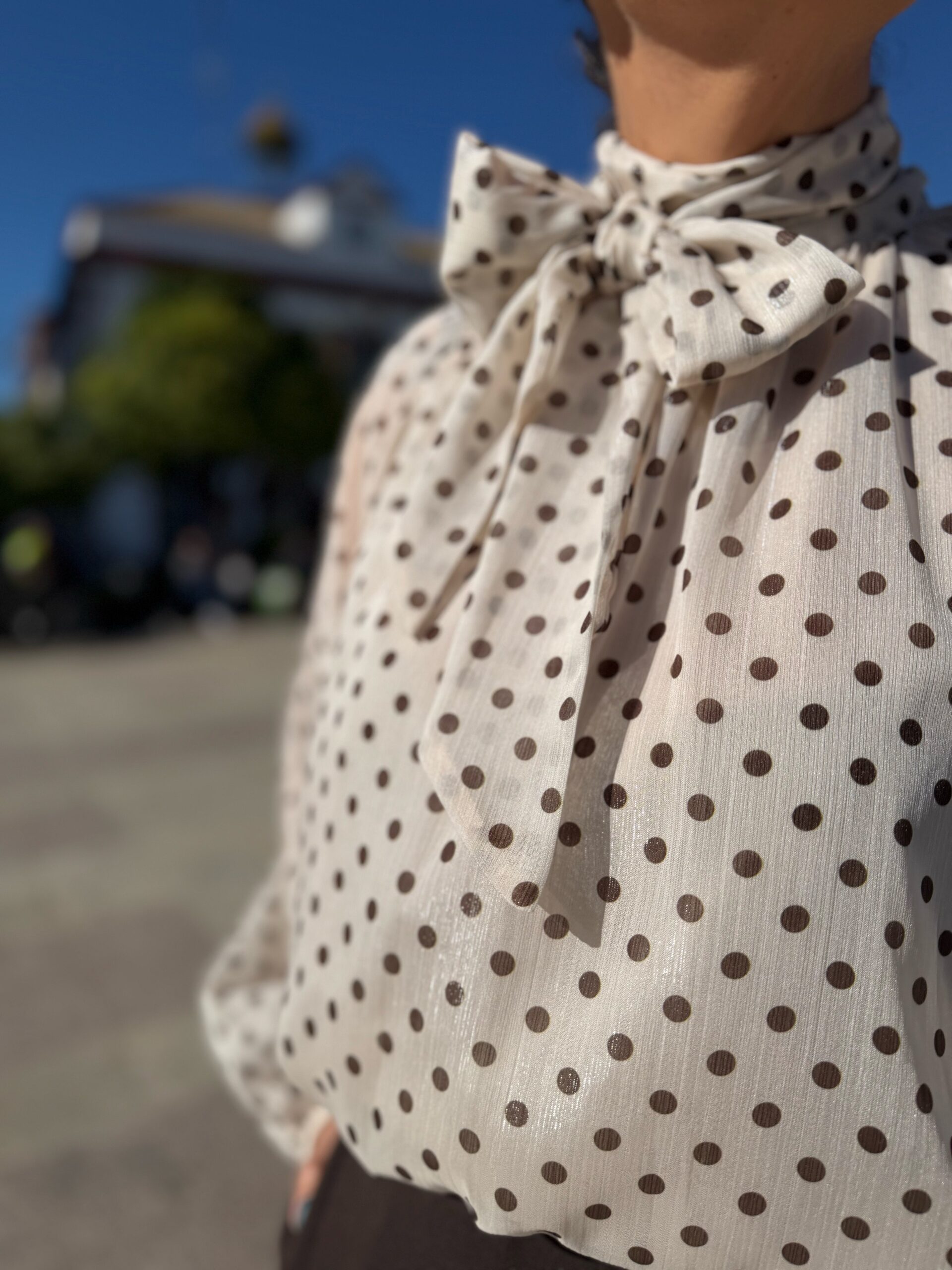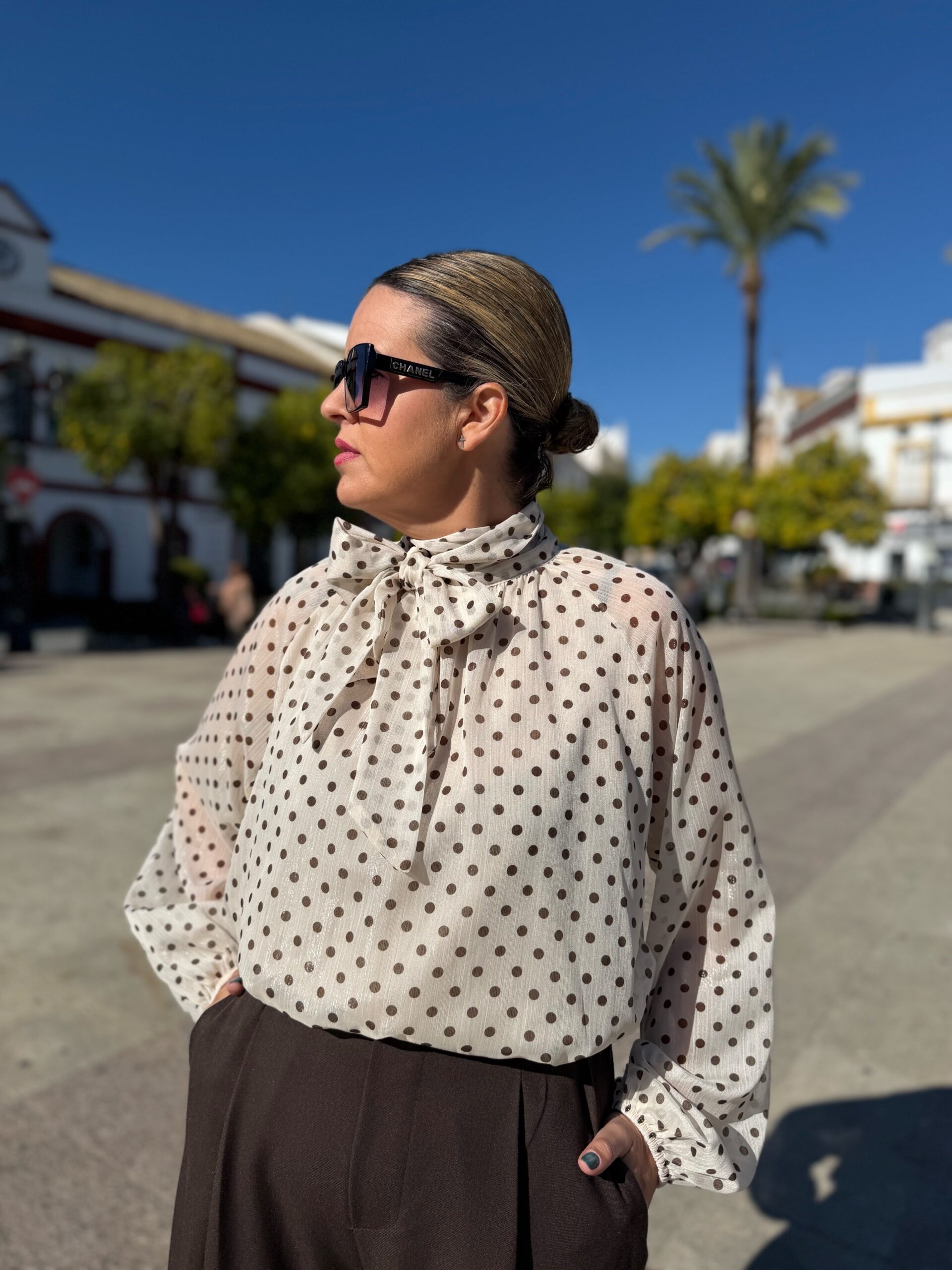 Camisa en tejido de gran calidad con pequeño brillo casi inapreciable pero que le da aun más un toque elegante. Su lazada al cuello se puede llevar tanto delante como detrás. Es perfectamente la camisa de tus navidades ya que podrás combinarla prácticamente con todo, en ese día que quieras ir espectacular y radiante. Triunfa con nuestra camisa de lunares cuello lazo vayas donde vayas. Almuerzo, cena, salida con amigas, incluso en tu trabajo. Esta camisa tiene estilo propio y no debe faltar en tu armario. En talla única pero que se adapta a tallas desde 38 a 44 (120 ctms de contorno).