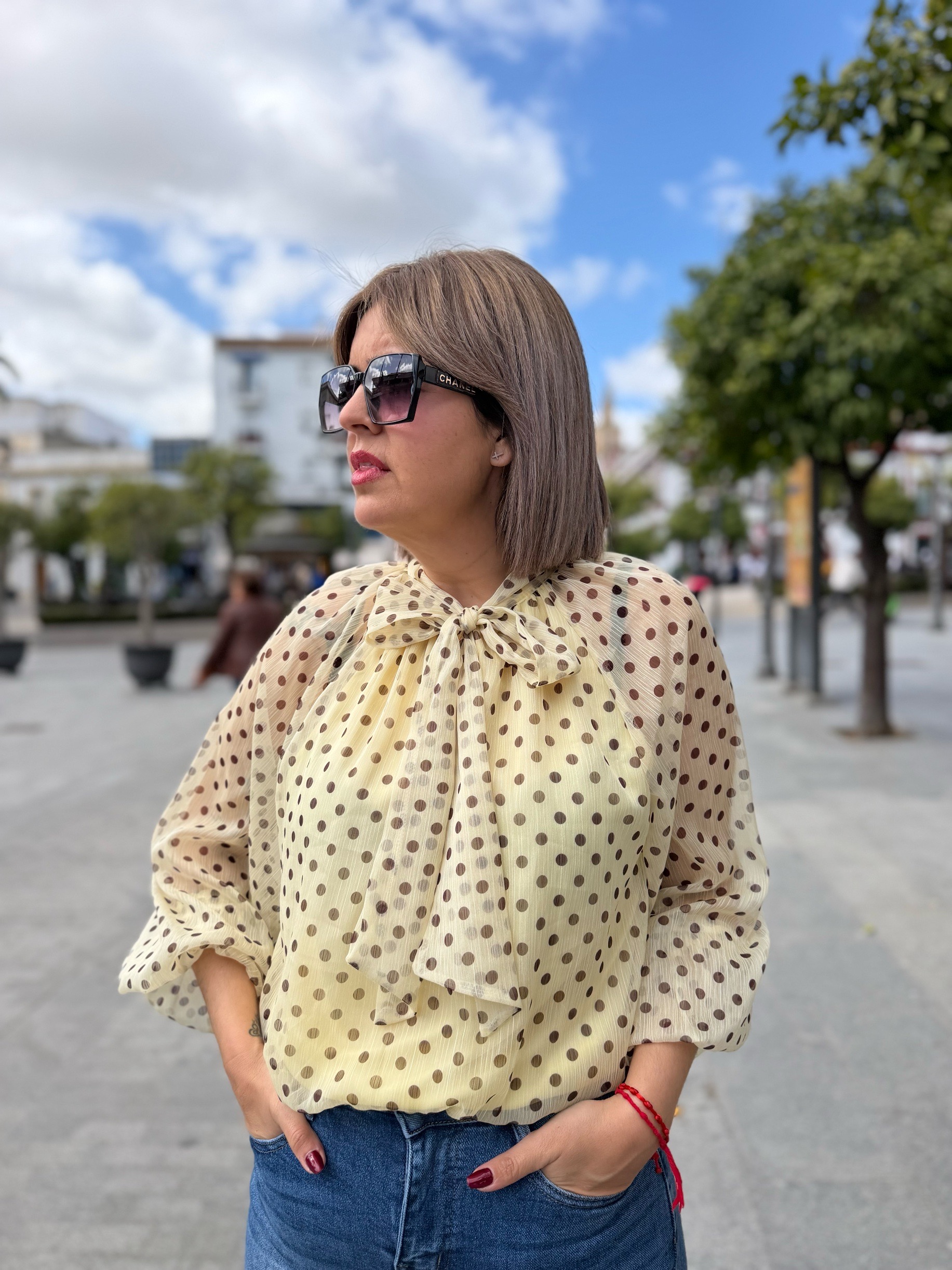 Camisa muy elegante con estampado de lunares y detalle de lazo al cuello que tan de moda están. Que podrás llevar tanto combinada con un pantalón más de vestir para cualquier ocasión, como con unos jeans como ha hecha Sandra montándose un outfit más para el dia a dia pero sin dejar atrás el estilo. En talla única (120 ctms de contorno).