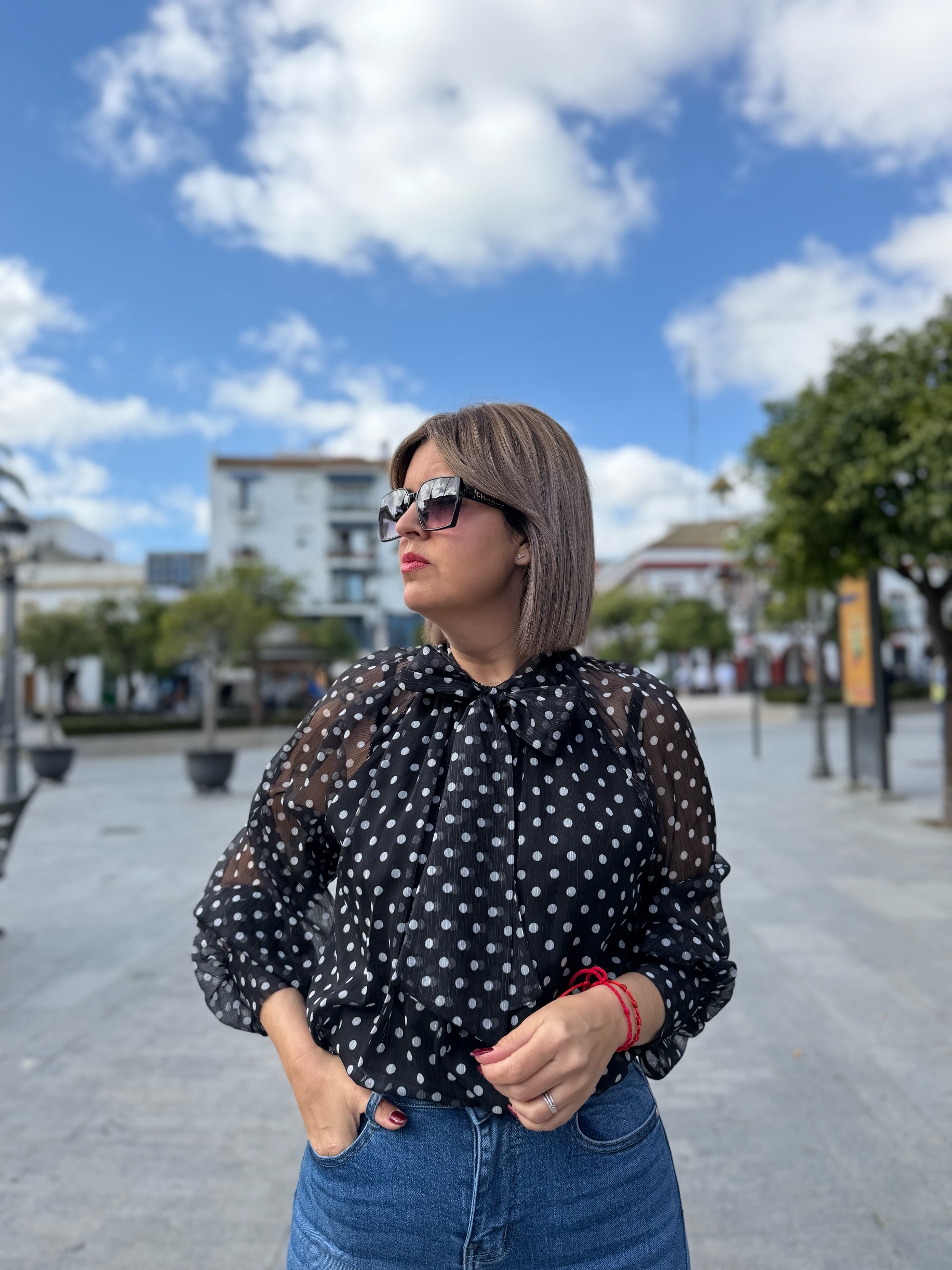 Camisa muy elegante con estampado de lunares y detalle de lazo al cuello que tan de moda están. Que podrás llevar tanto combinada con un pantalón más de vestir para cualquier ocasión, como con unos jeans como ha hecha Sandra montándose un outfit más para el dia a dia pero sin dejar atrás el estilo. En talla única (120 ctms de contorno).