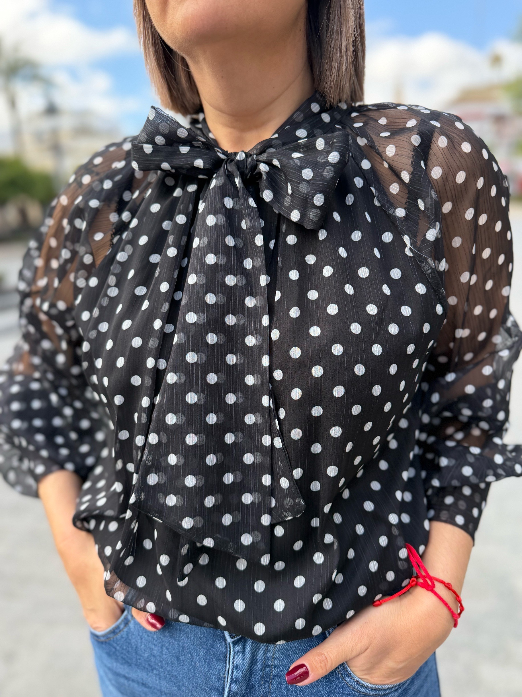 Camisa lunares cuello lazo negra.