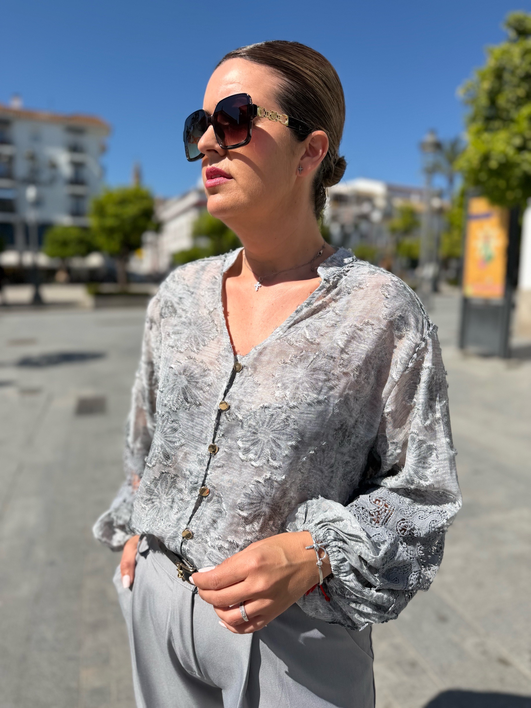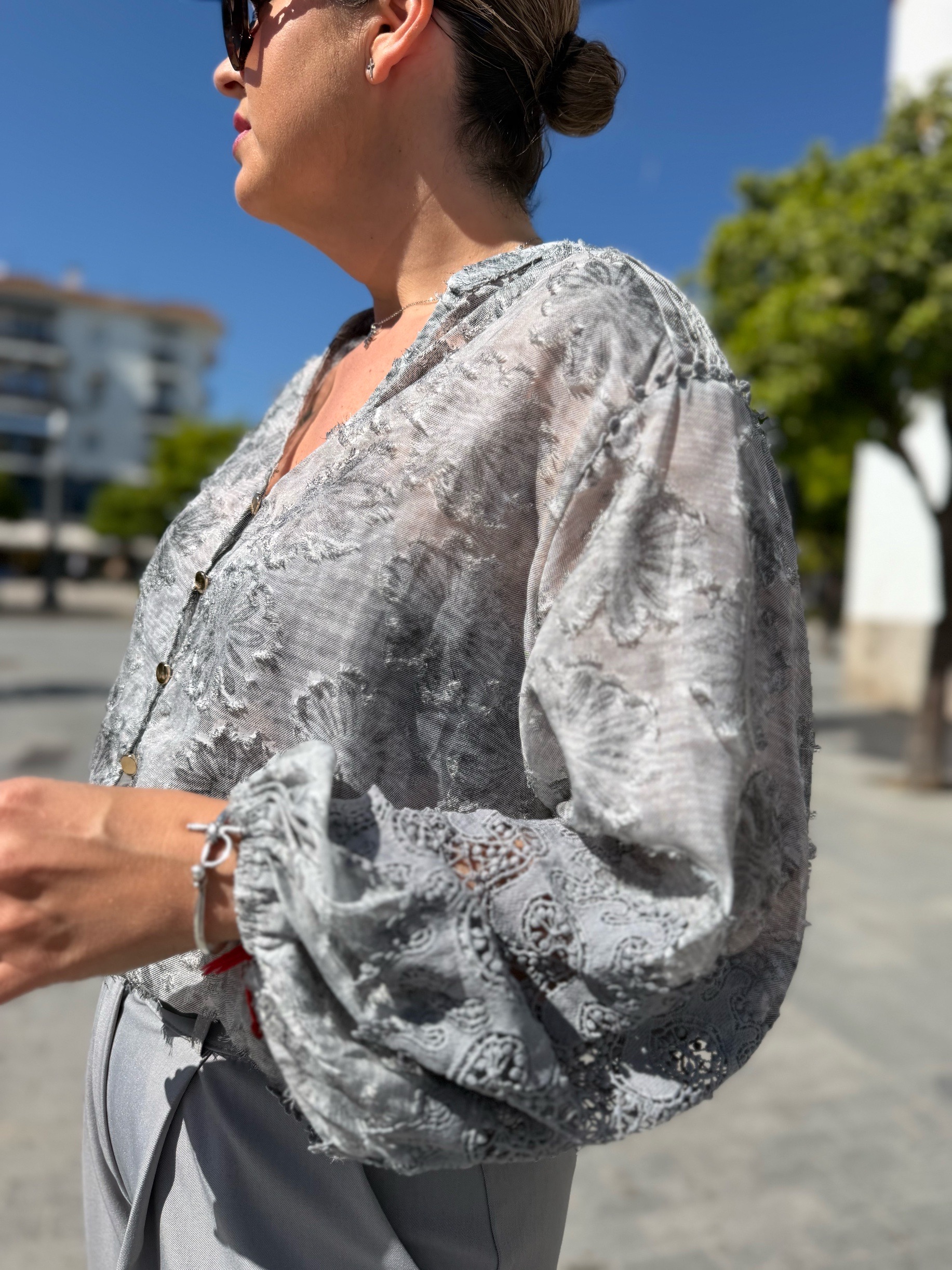 Destacan sus mangas ligeramente abullonadas con detalle de encaje en los puños, que añaden un toque especial y muy estiloso. El escote con botonadura frontal aporta versatilidad, permitiendo llevarla más cerrada para un look elegante o ligeramente abierta para un estilo más relajado.