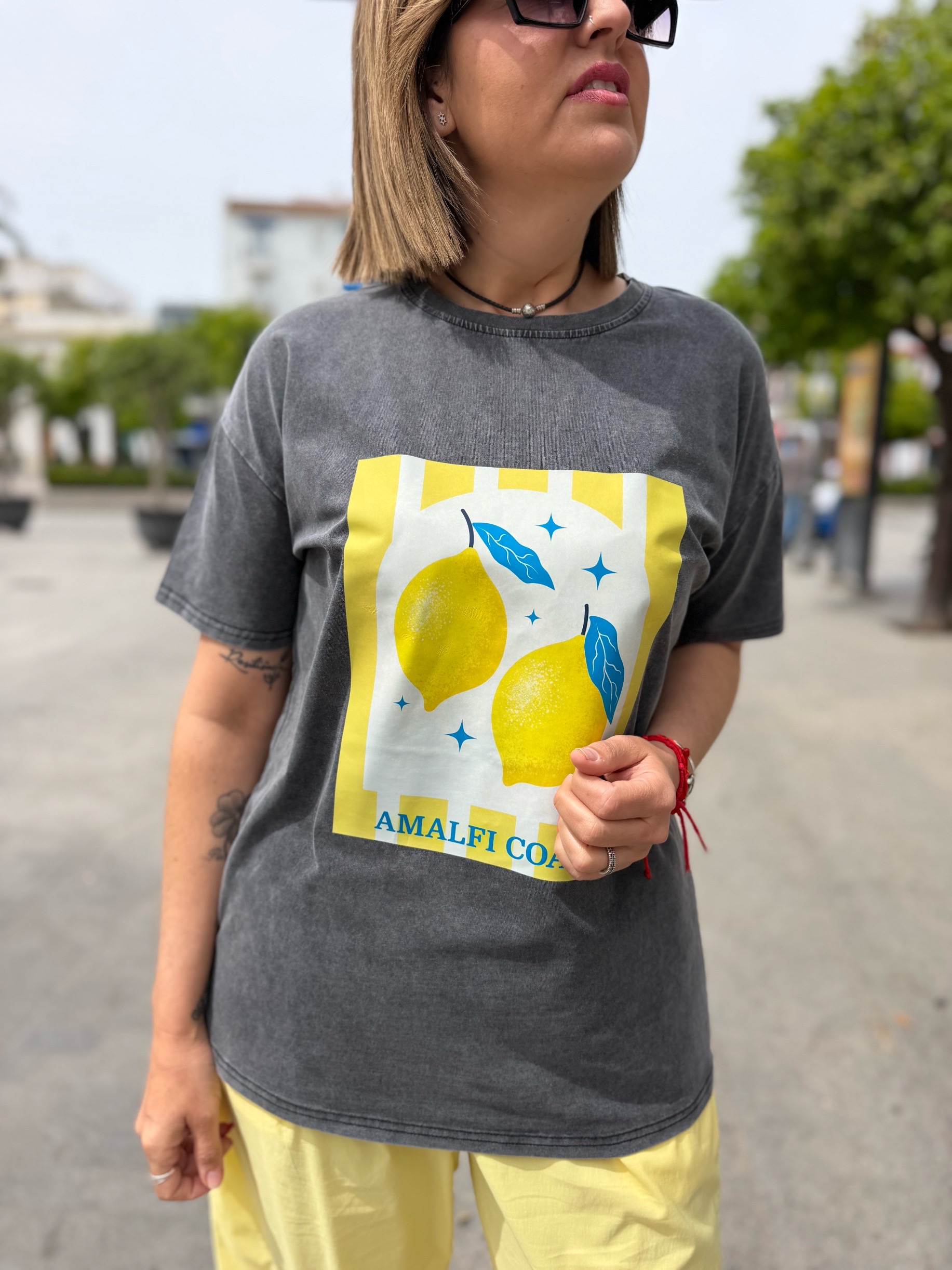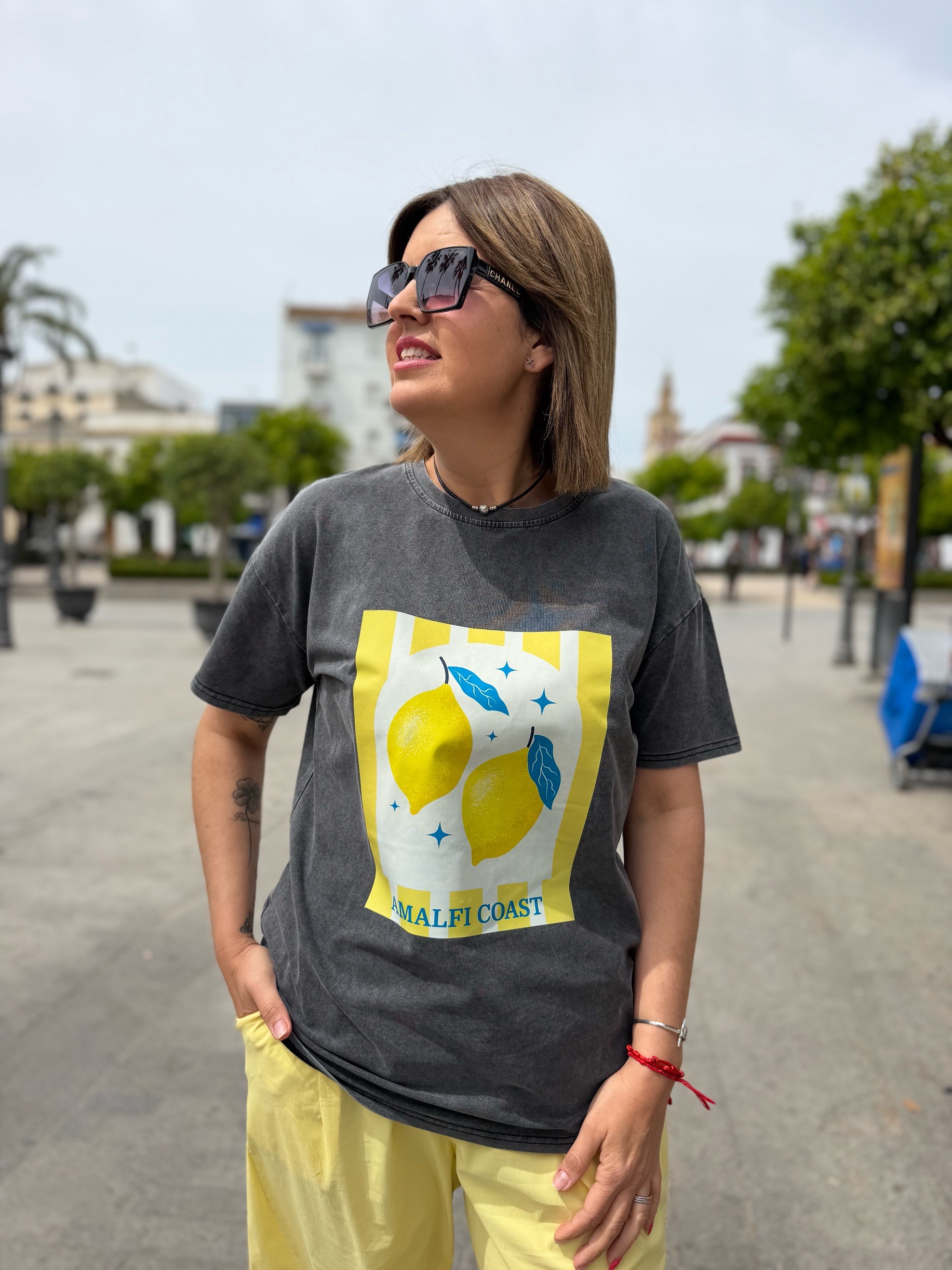 Camiseta en tejido de algodón con licra y detalle de dibujo impreso en colores muy veraniegos. En talla única pero adaptable a muchas tallas gracias a su contorno de 110 ctms.