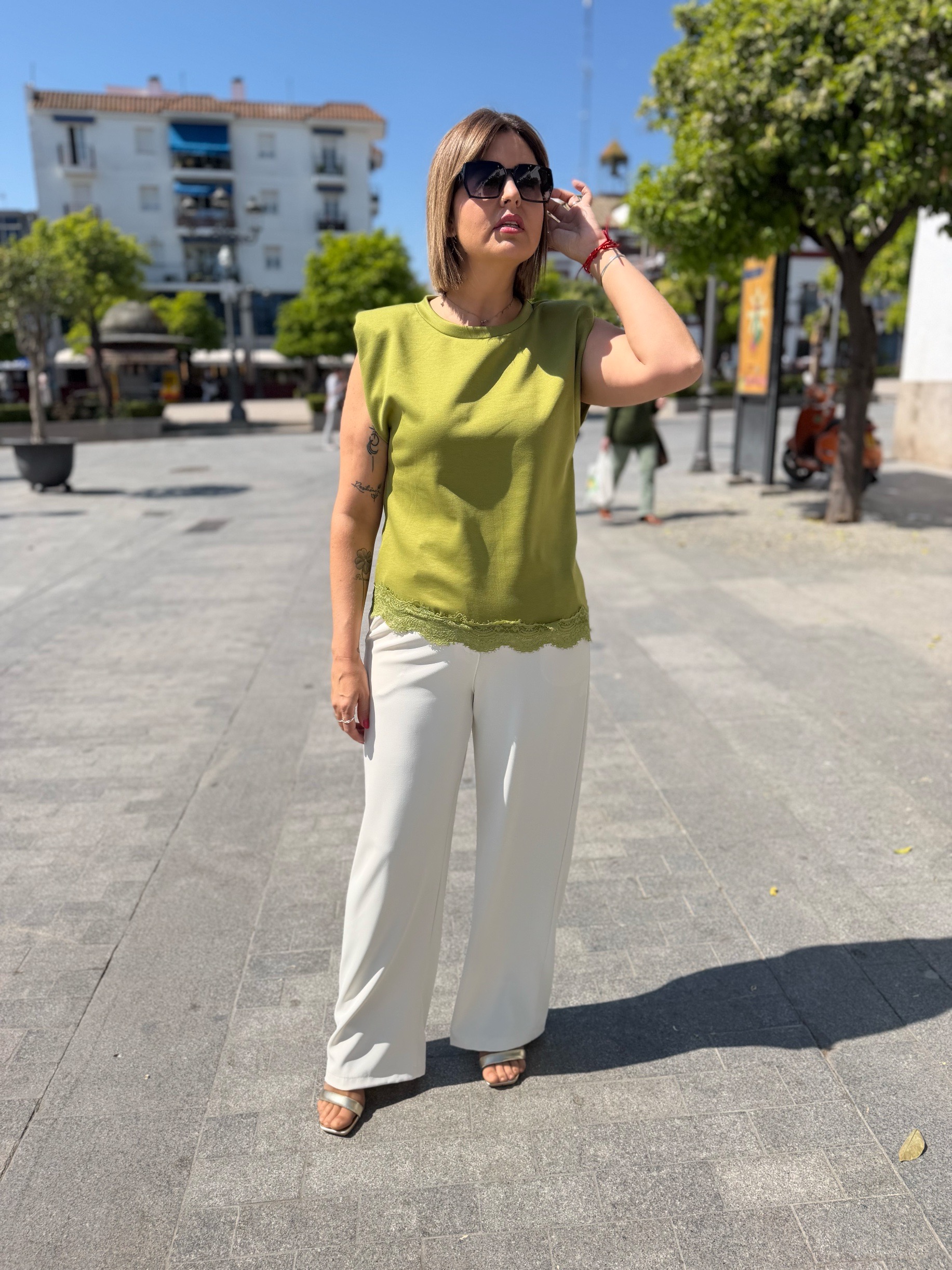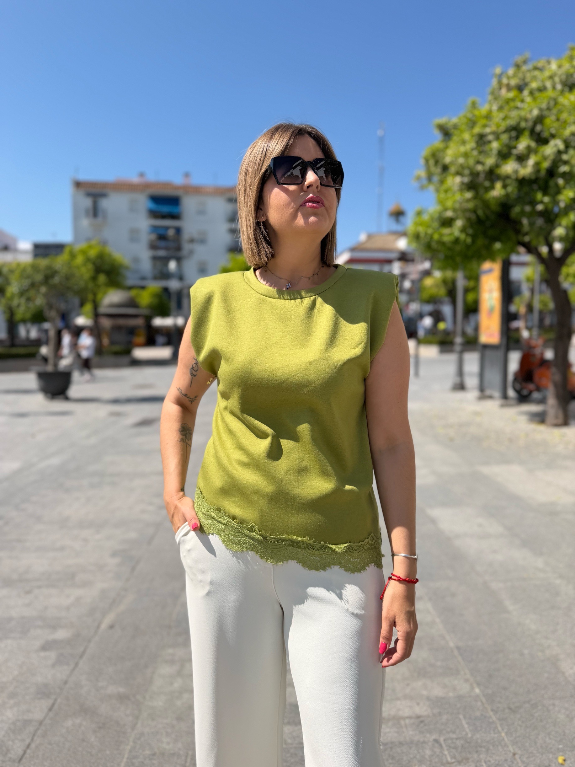 Camiseta en tejido de algodón con licra con detalle de hombrera y pequeño encaje en parte baja, que le da un toque muy original a la vez que la hace más de vestir. En talla única con un contorno de 100 ctms de contorno, es la camiseta ideal,para llevarla prácticamente para todo.