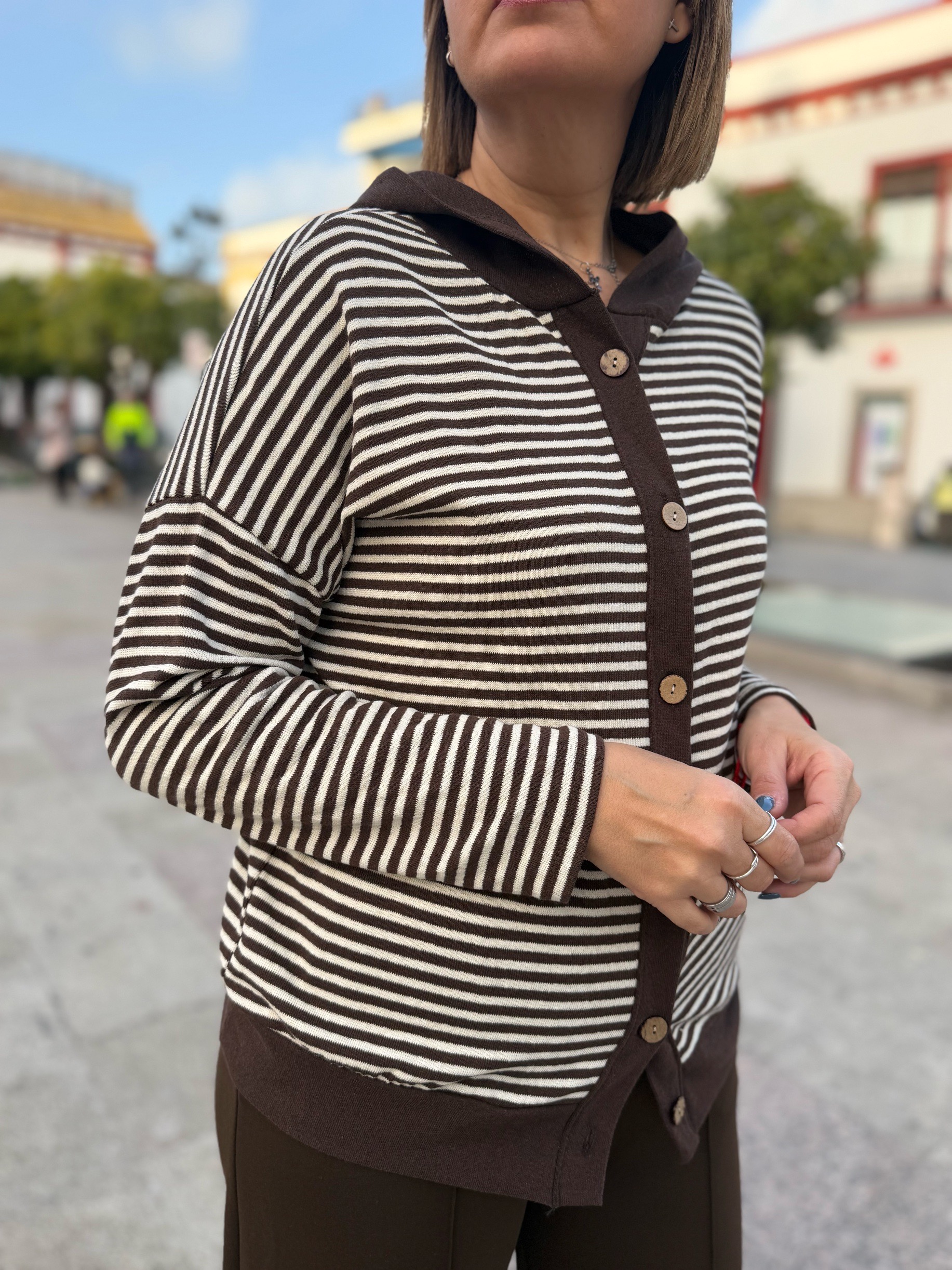 Cardigan de hilo con capucha, lo que le da un corte tipo sudadera muy original. Ideal para combinar con nuestro pantalón soft glow o unos jeans. Móntate un outfits súper original con nuestro Cardigan sudadera a rayas. En talla única pero que se adapta a muchísimas tallas (120 ctms de contorno).