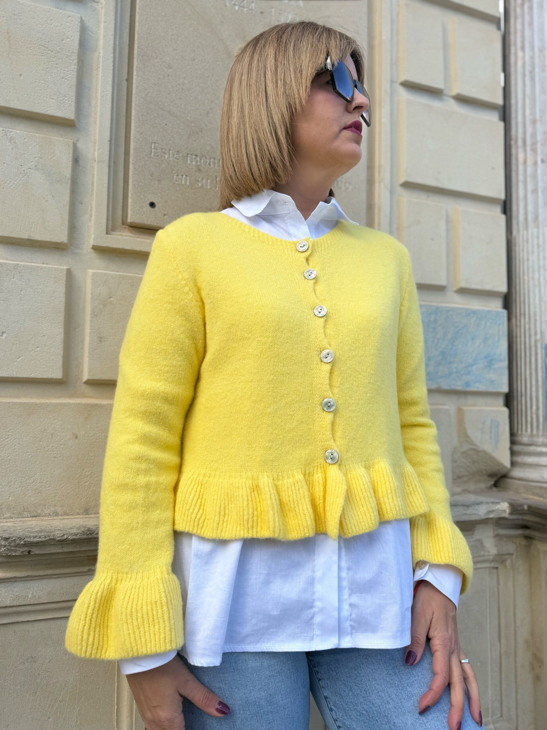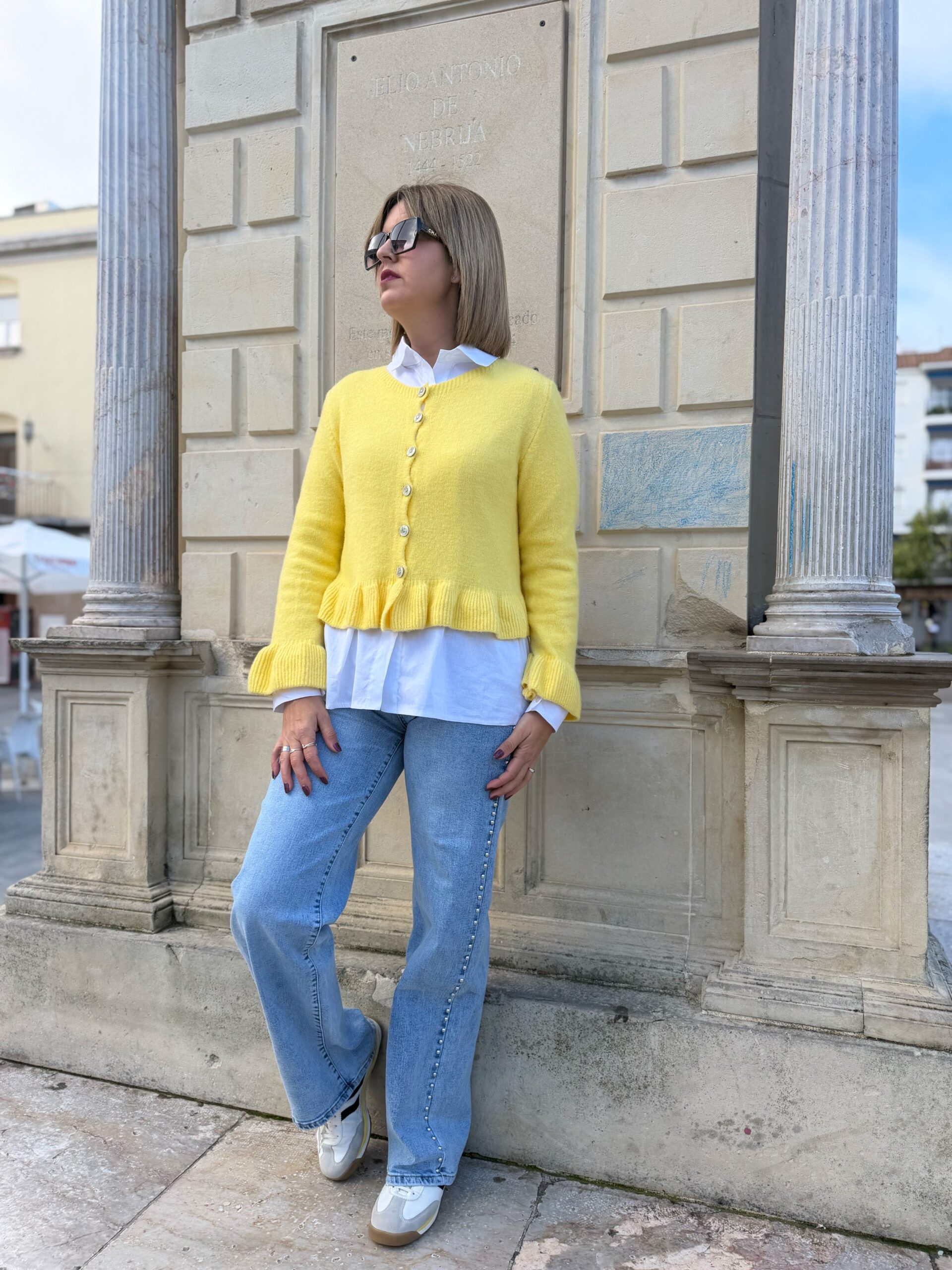 Jersey tipo cardigan (abotonado hasta abajo) en tejido de lana suave y confortable con detalle de volantes en puños y parte baja. Muy original y estiloso e ideal para llevarlo en cualquier ocasión, tanto para el dia a dia como para una ocasión un poco más especial. En talla única adaptable a tallas desde 36 a 40 (100 ctms de contorno).