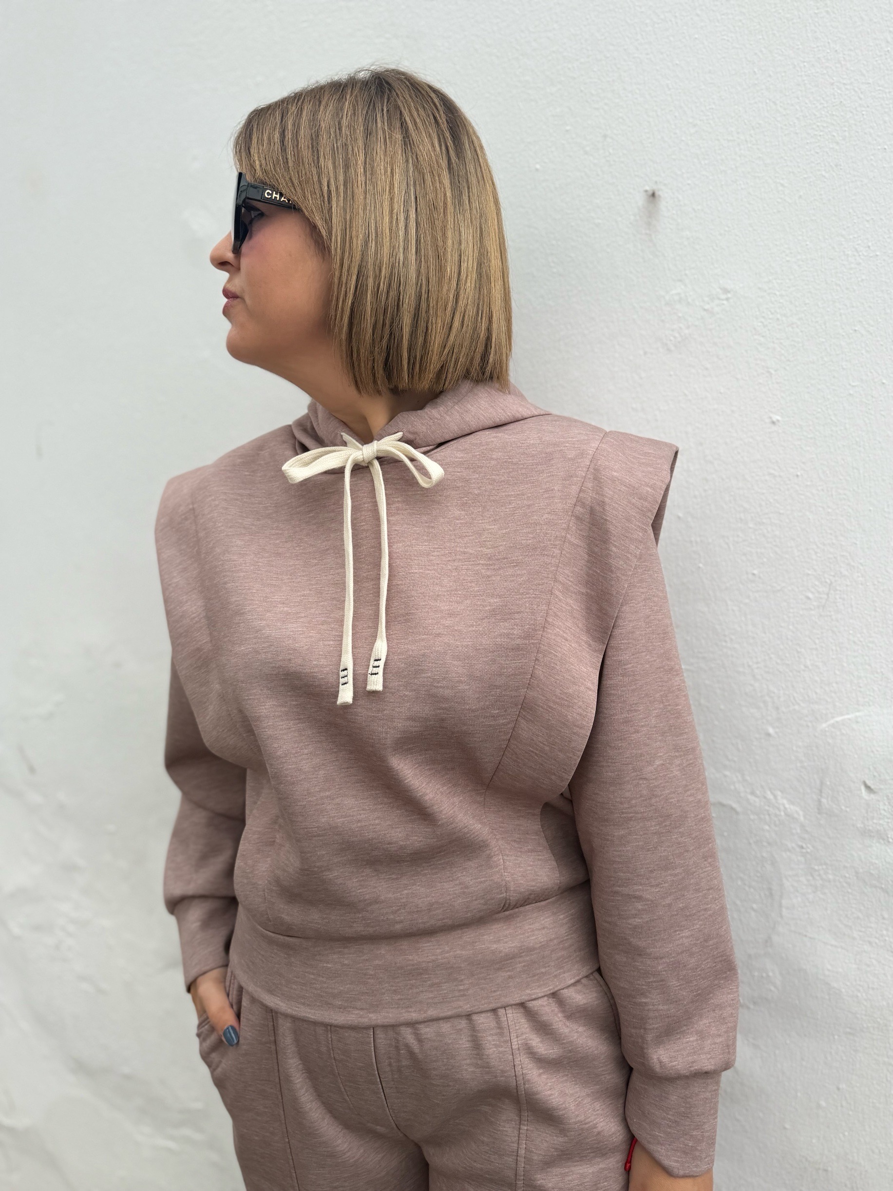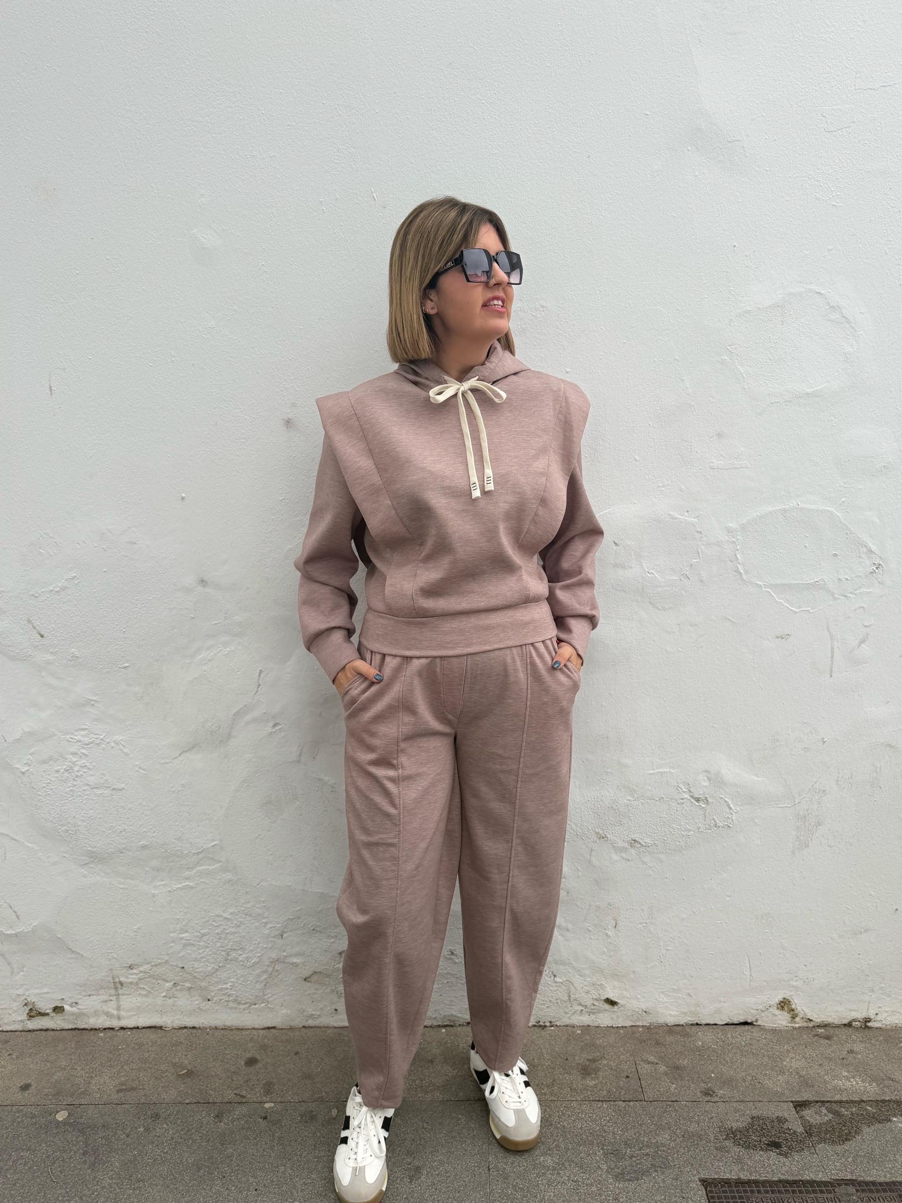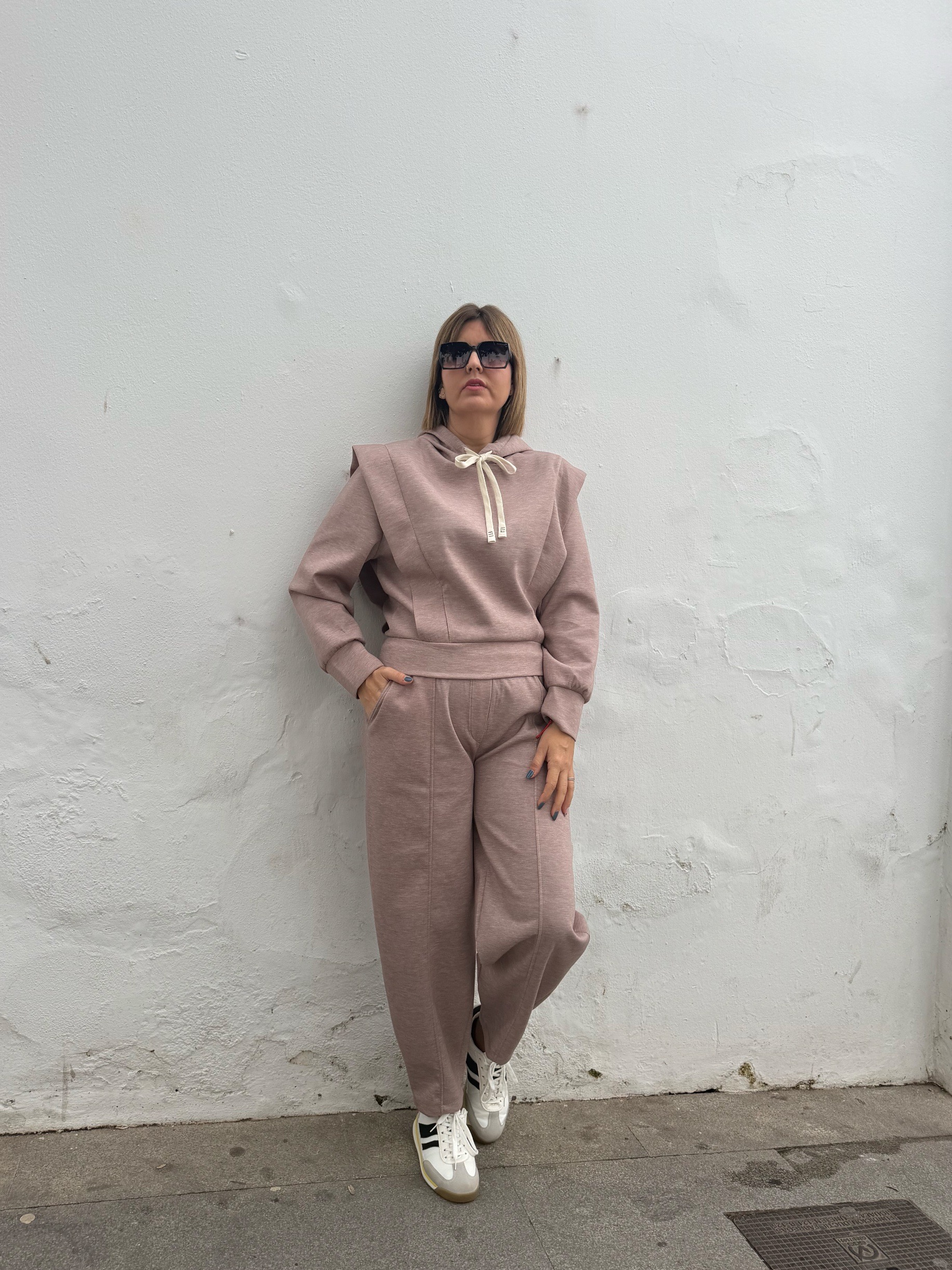 La sudadera presenta un diseño actual con hombreras sutiles y capucha, elevando el look casual a otro nivel, mientras que el pantalón de corte relajado estiliza la silueta gracias a su caída perfecta y cintura cómoda.