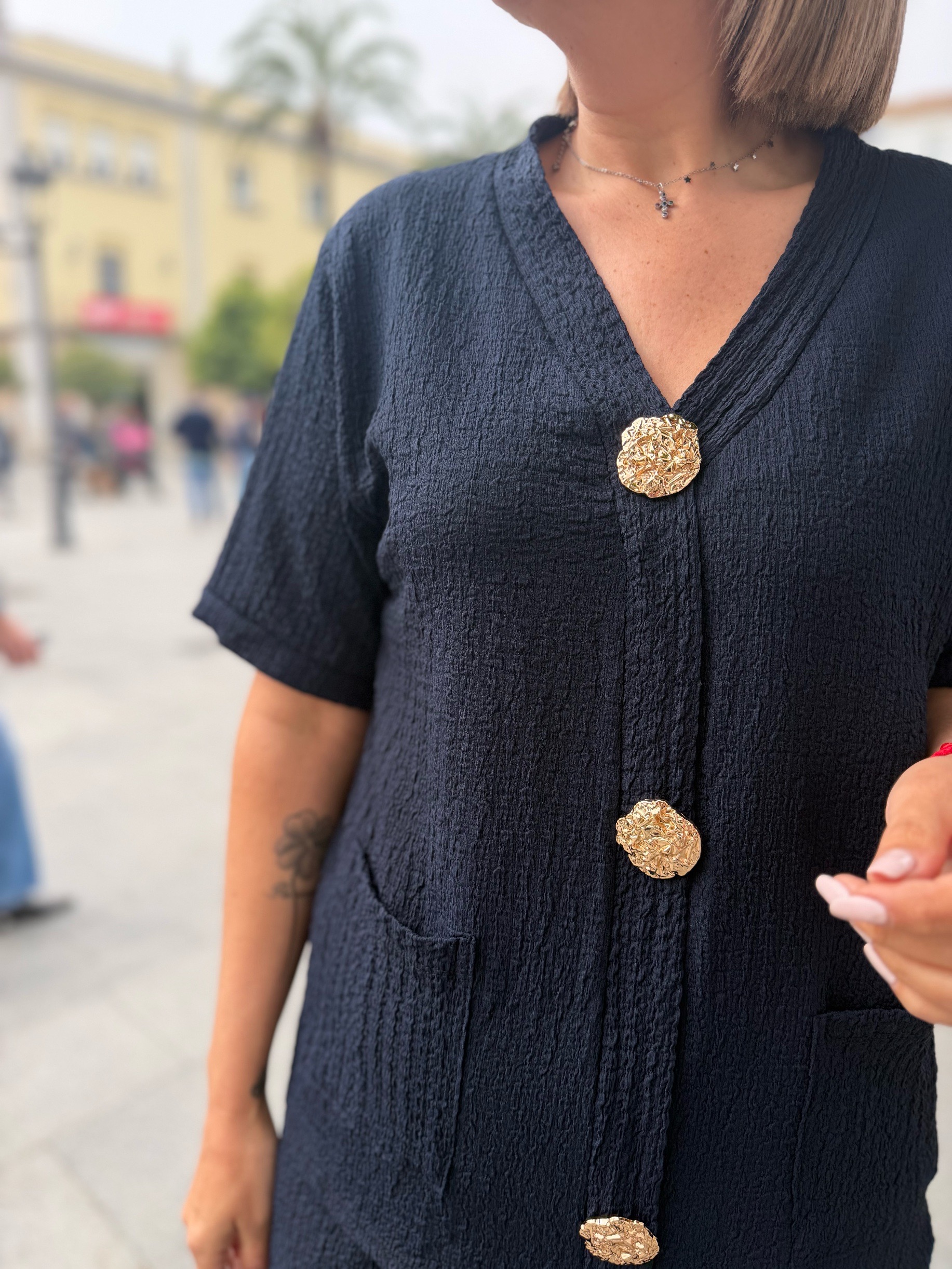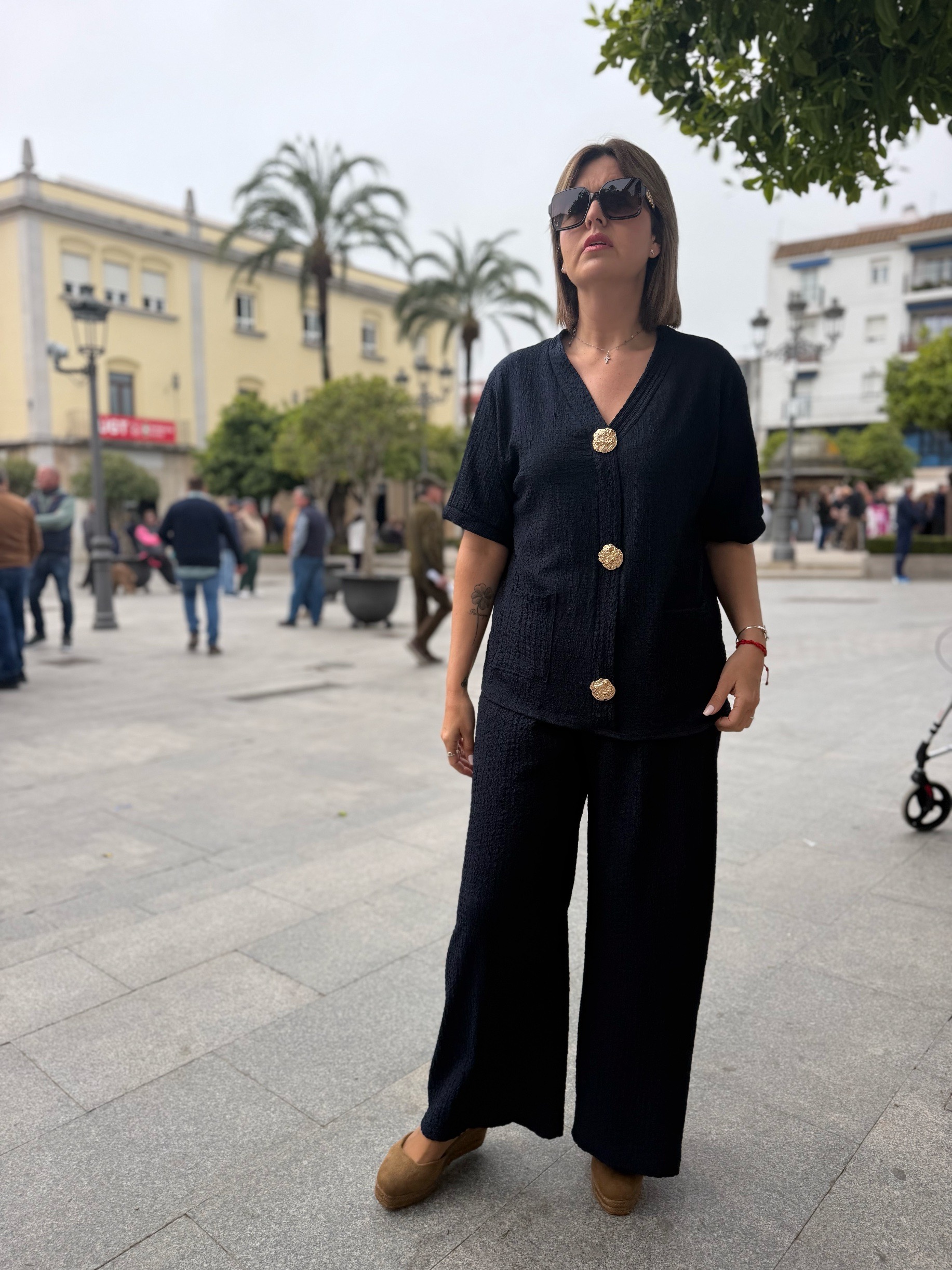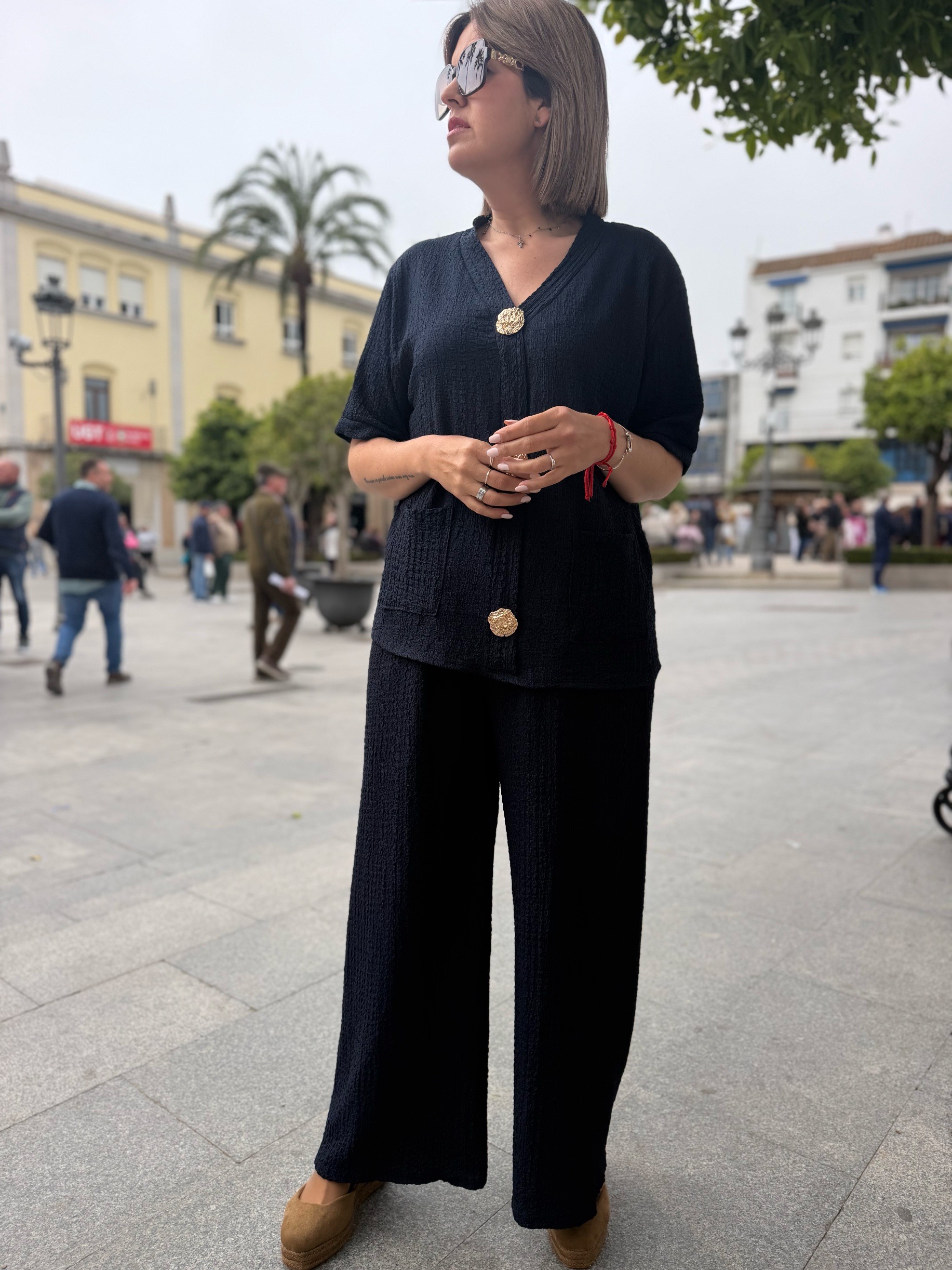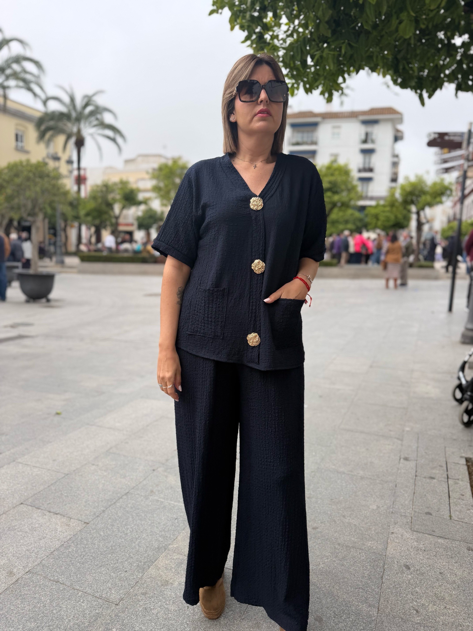 En esta versión, la parte superior destaca por su bonito diseño con tres botones dorados decorativos en la parte frontal, que aportan un toque elegante y diferente. También incorpora bolsillos delanteros, que lo hacen aún más práctico y cómodo. El pantalón de corte amplio estiliza la silueta y aporta movimiento, creando un conjunto moderno y muy favorecedor.