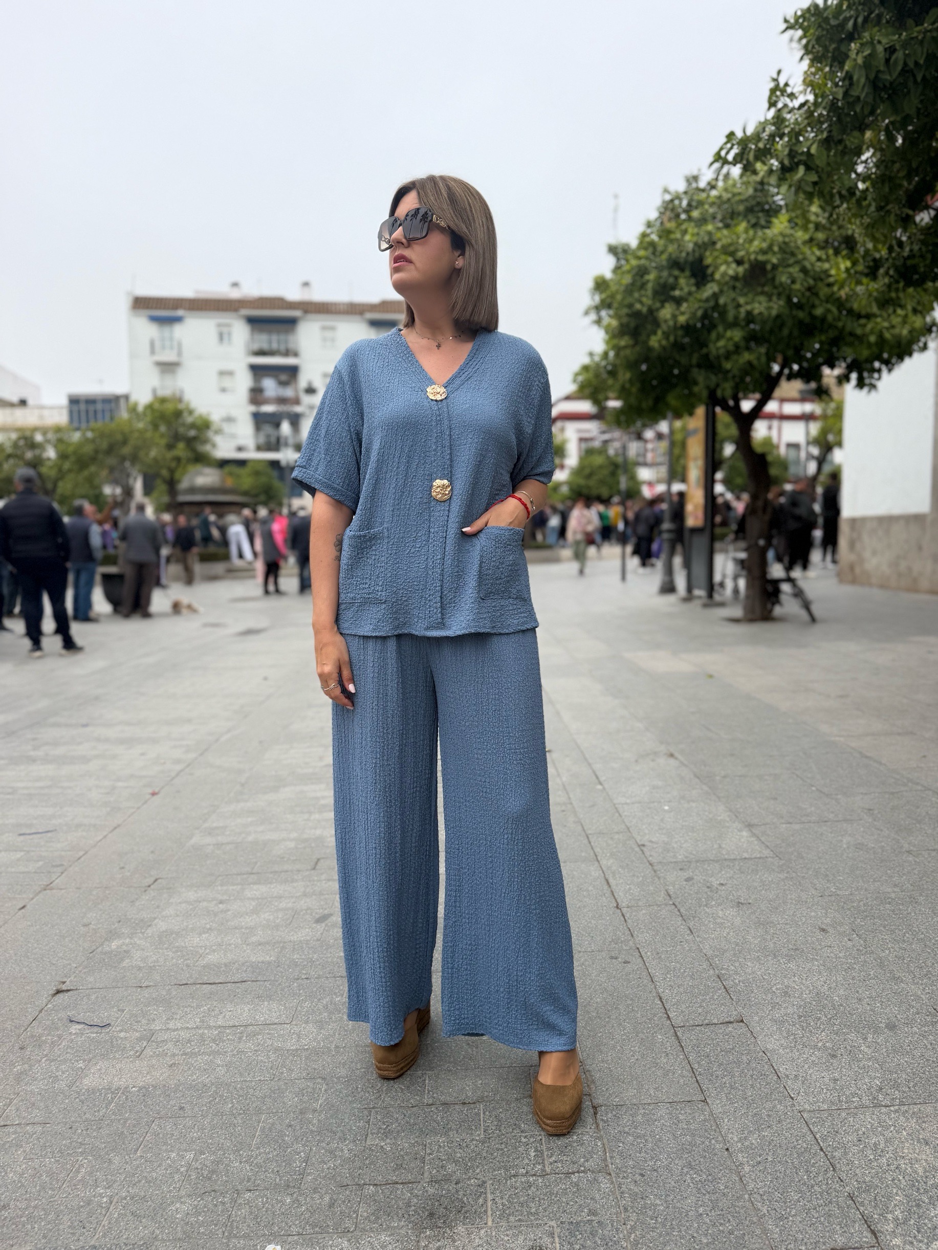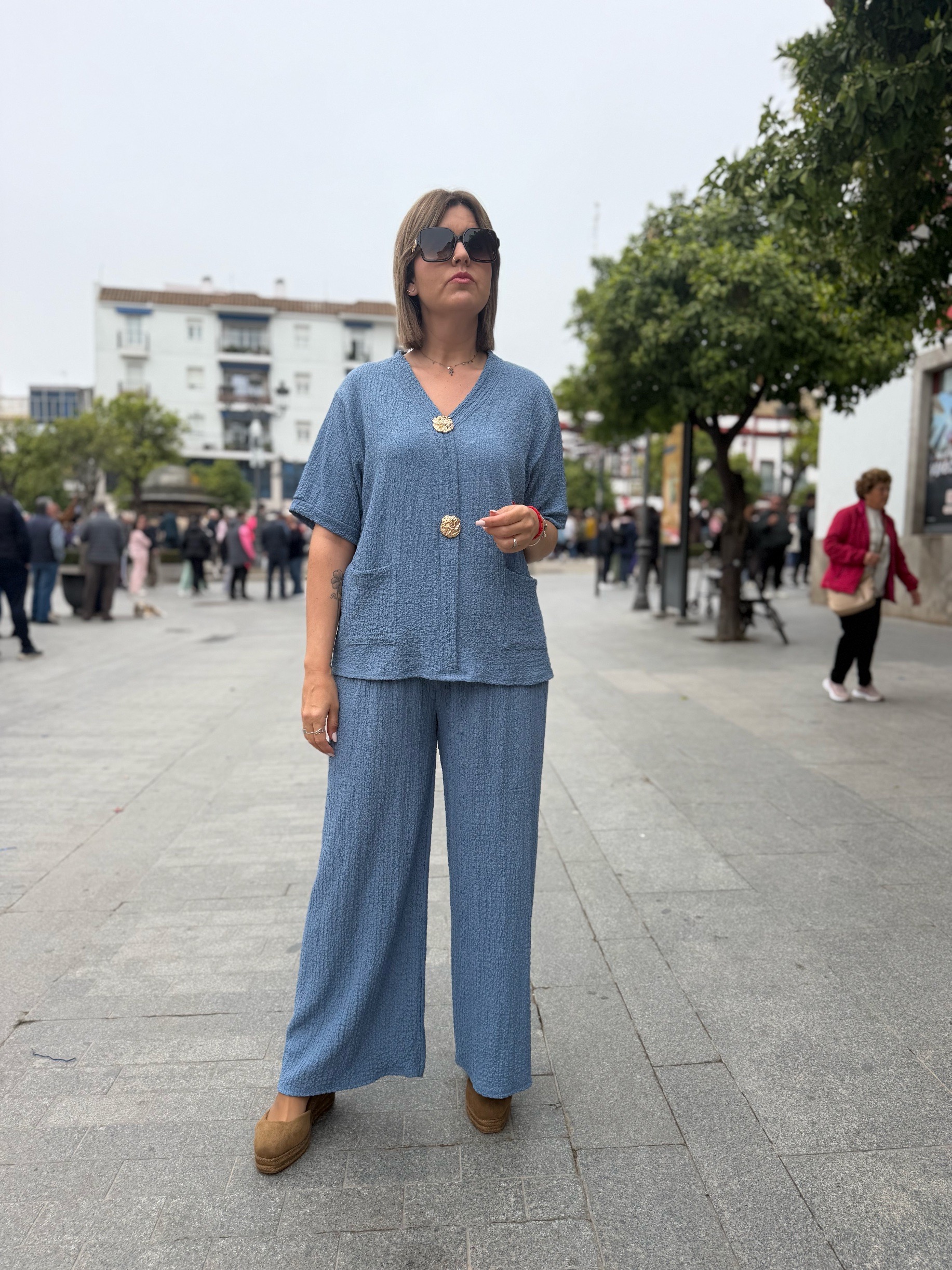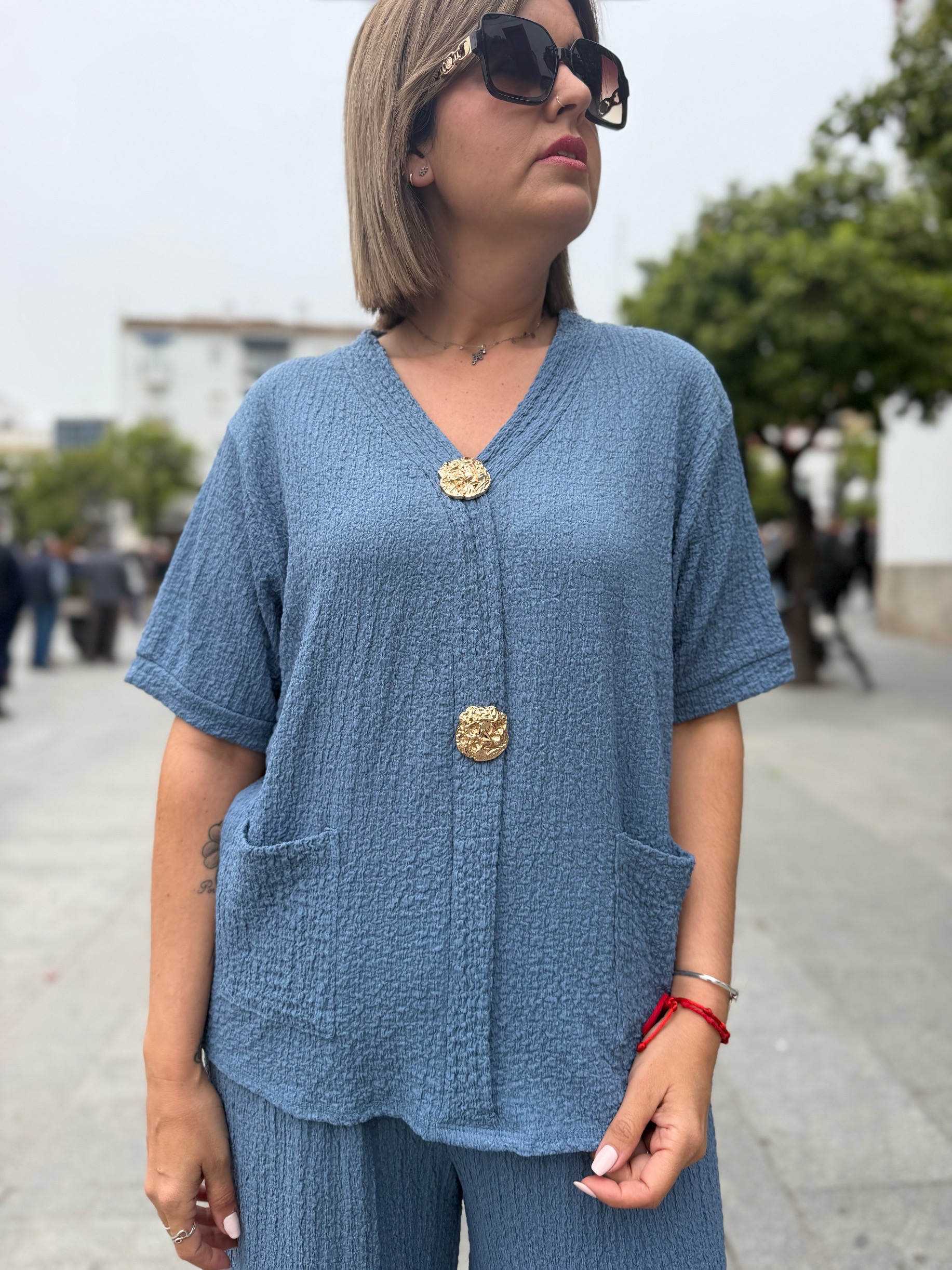 En esta versión, la parte superior destaca por su bonito diseño con tres botones dorados decorativos en la parte frontal, que aportan un toque elegante y diferente. También incorpora bolsillos delanteros, que lo hacen aún más práctico y cómodo. El pantalón de corte amplio estiliza la silueta y aporta movimiento, creando un conjunto moderno y muy favorecedor.
