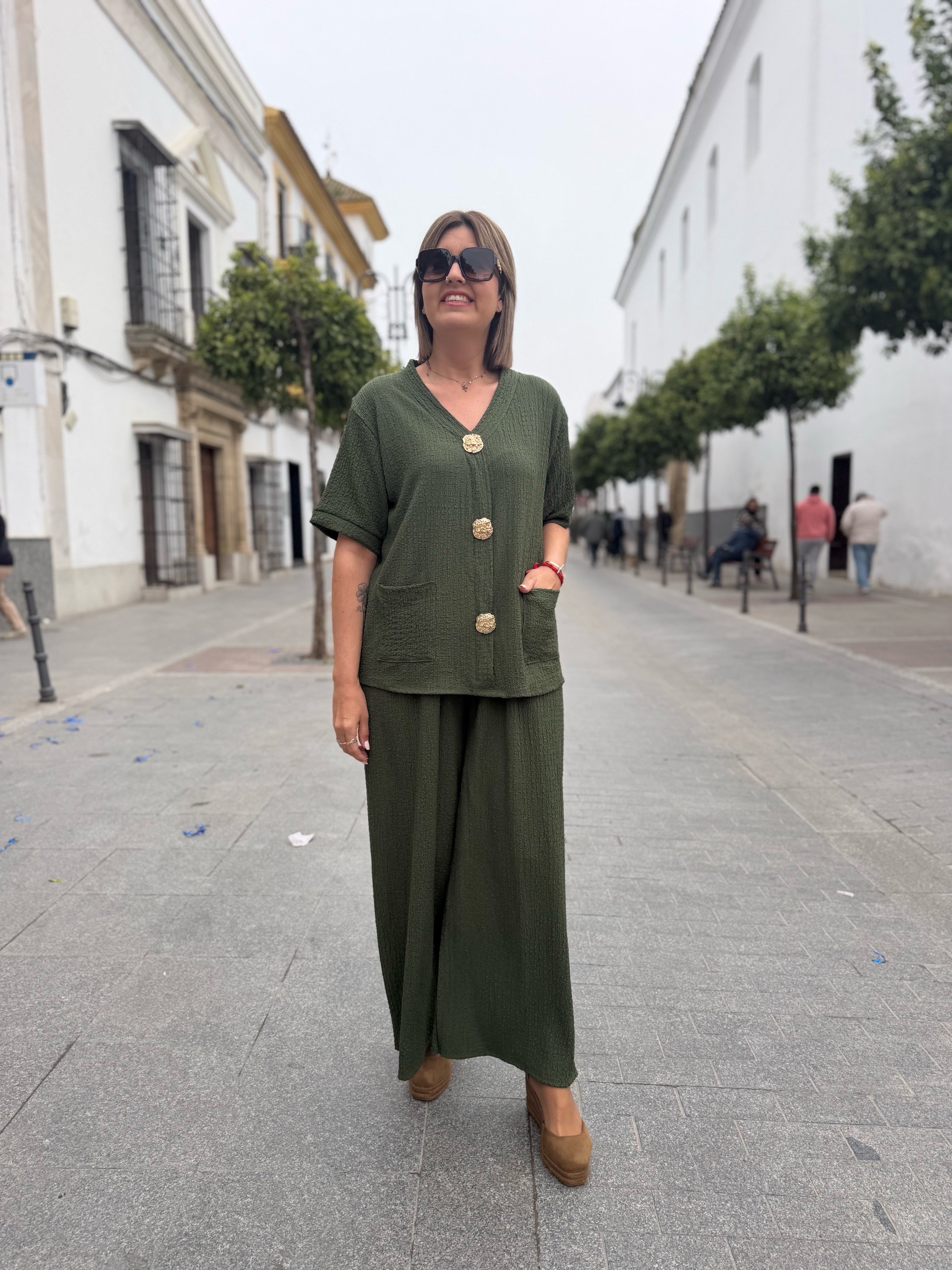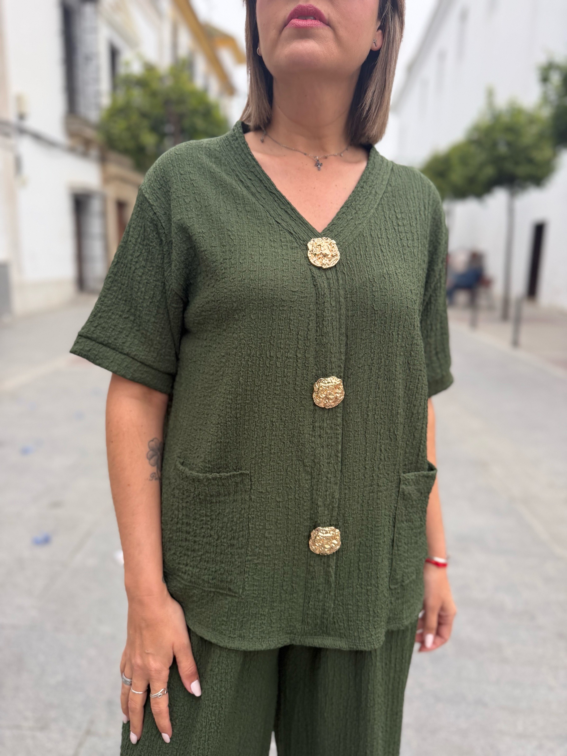 En esta versión, la parte superior destaca por su bonito diseño con tres botones dorados decorativos en la parte frontal, que aportan un toque elegante y diferente. También incorpora bolsillos delanteros, que lo hacen aún más práctico y cómodo. El pantalón de corte amplio estiliza la silueta y aporta movimiento, creando un conjunto moderno y muy favorecedor.