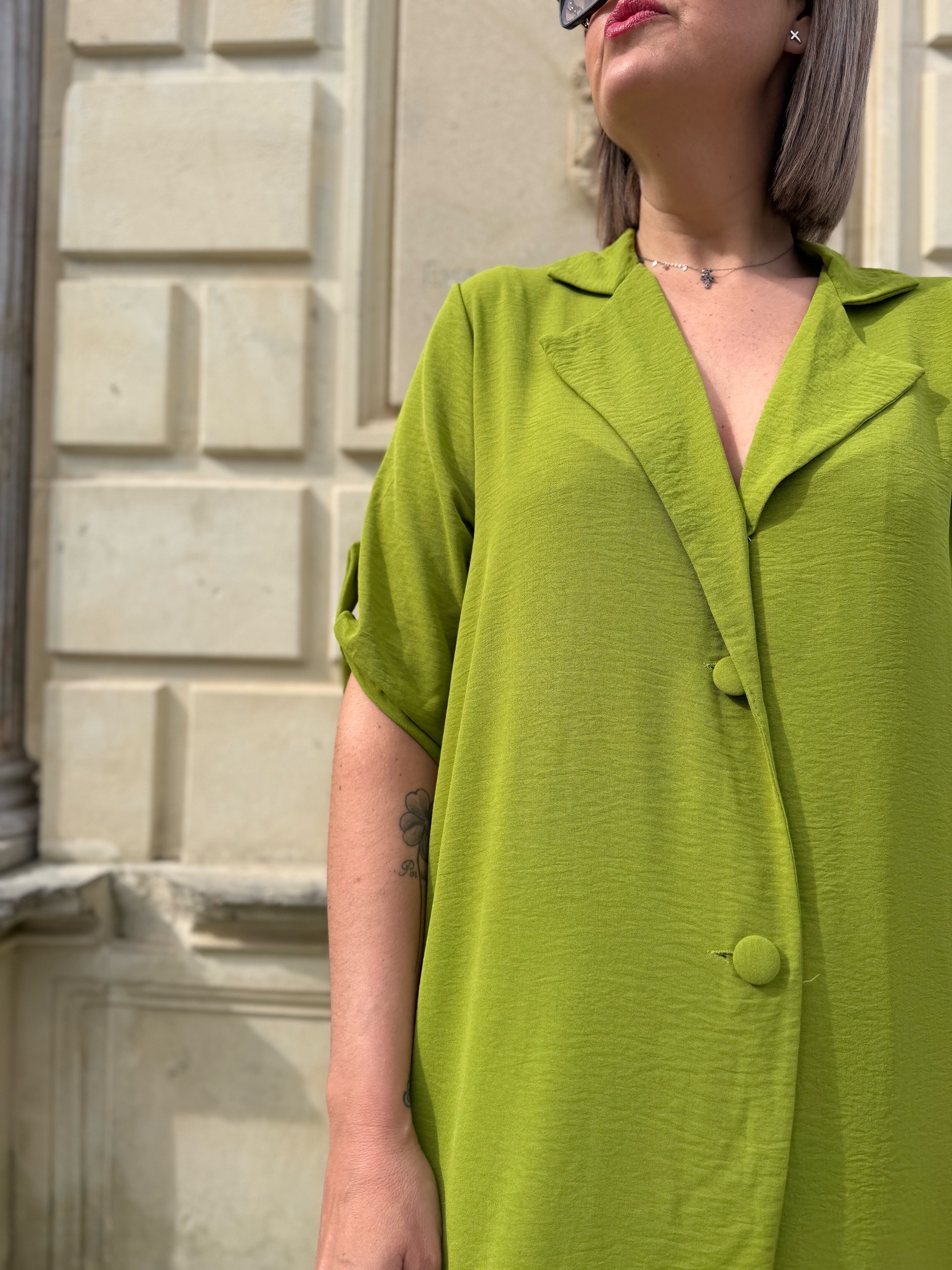 Su parte superior tipo guardapolvo, con solapa y botones, estiliza visualmente la figura y ofrece múltiples formas de llevarlo: cerrado como protagonista o abierto con un top debajo para un look más desenfadado y versátil.