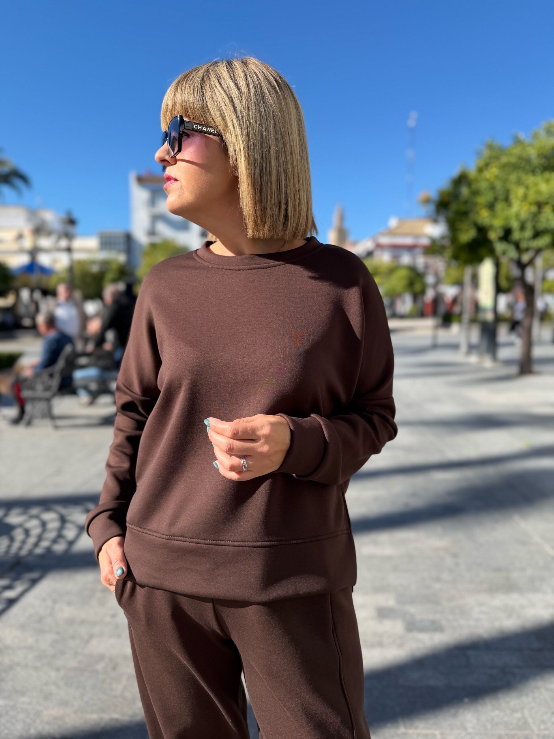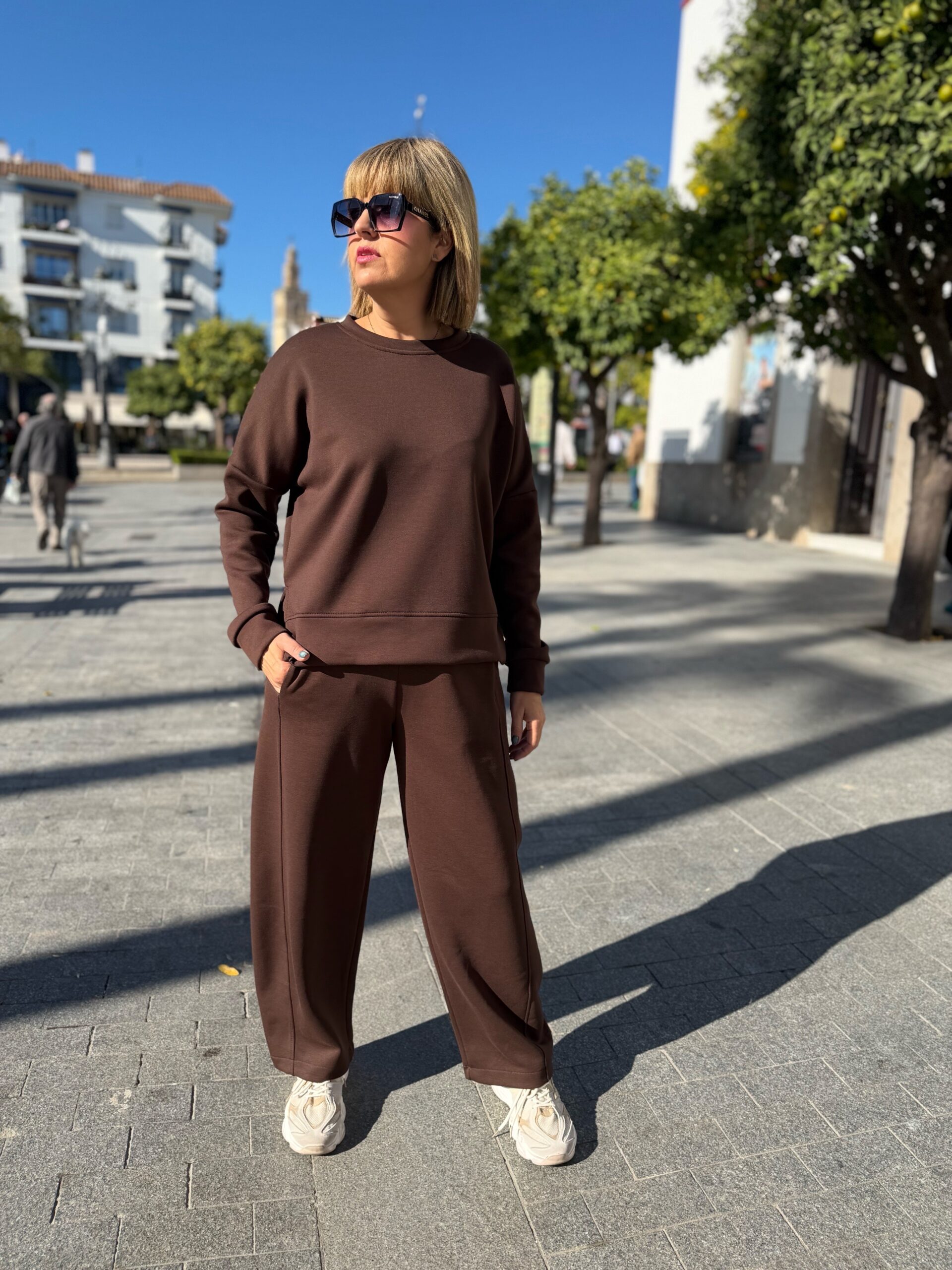 El conjunto incluye sudadera de corte relajado y pantalón ancho fluido con goma en la cintura, para un look comfy pero con rollazo.
