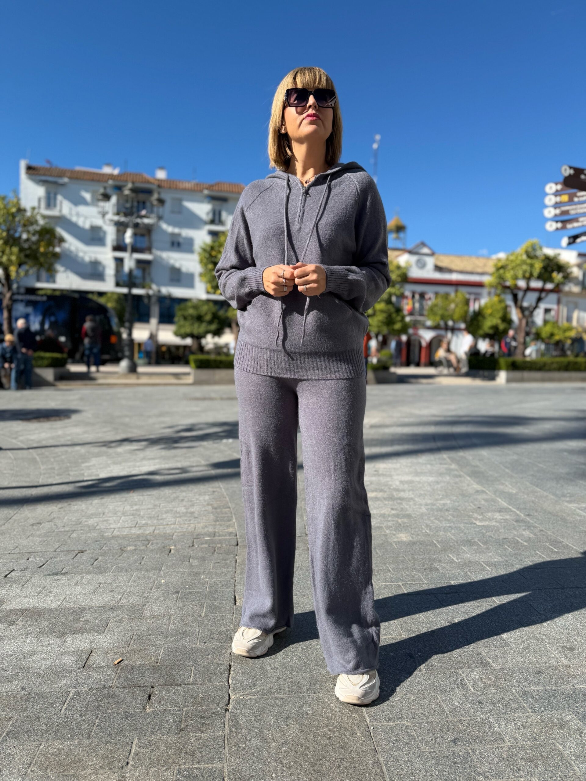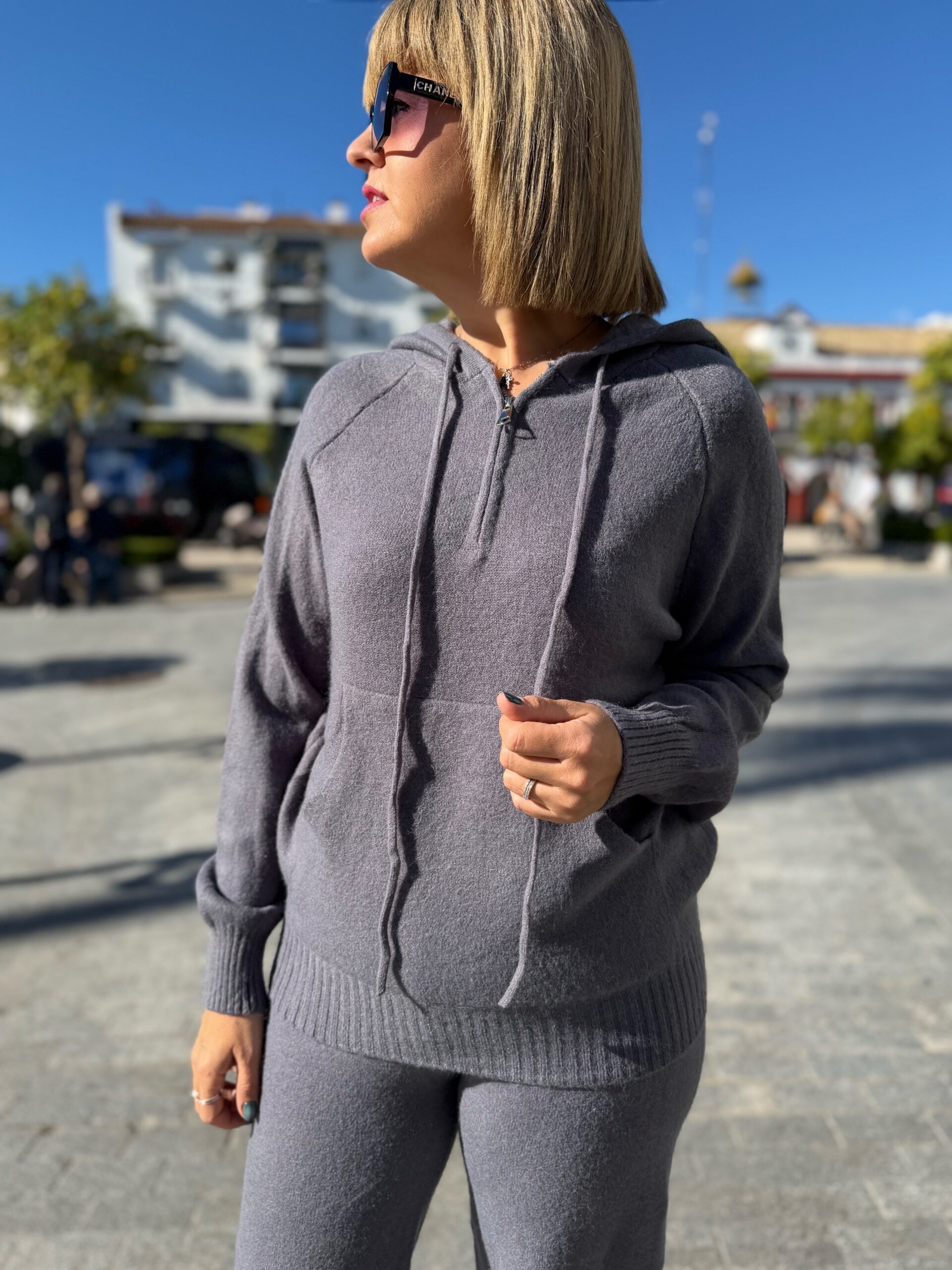 Conjunto de jersey de punto con forma de sudadera ya que trae capucha y bolsillos y pantalón a juego de cinturilla elástica y cordones ajustable, ambas partes en un tejido de punto con licra muy, muy confortable y abrigado que aun siendo talla única pero se adapta a tallas desde 38 a 44.