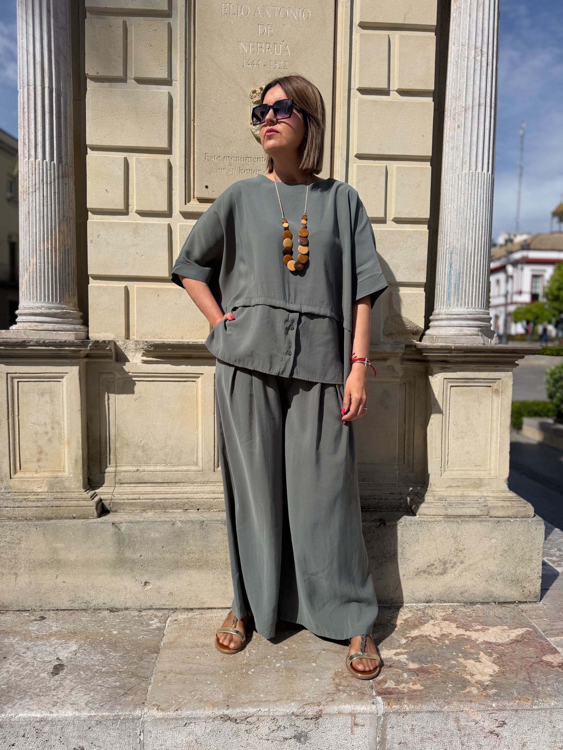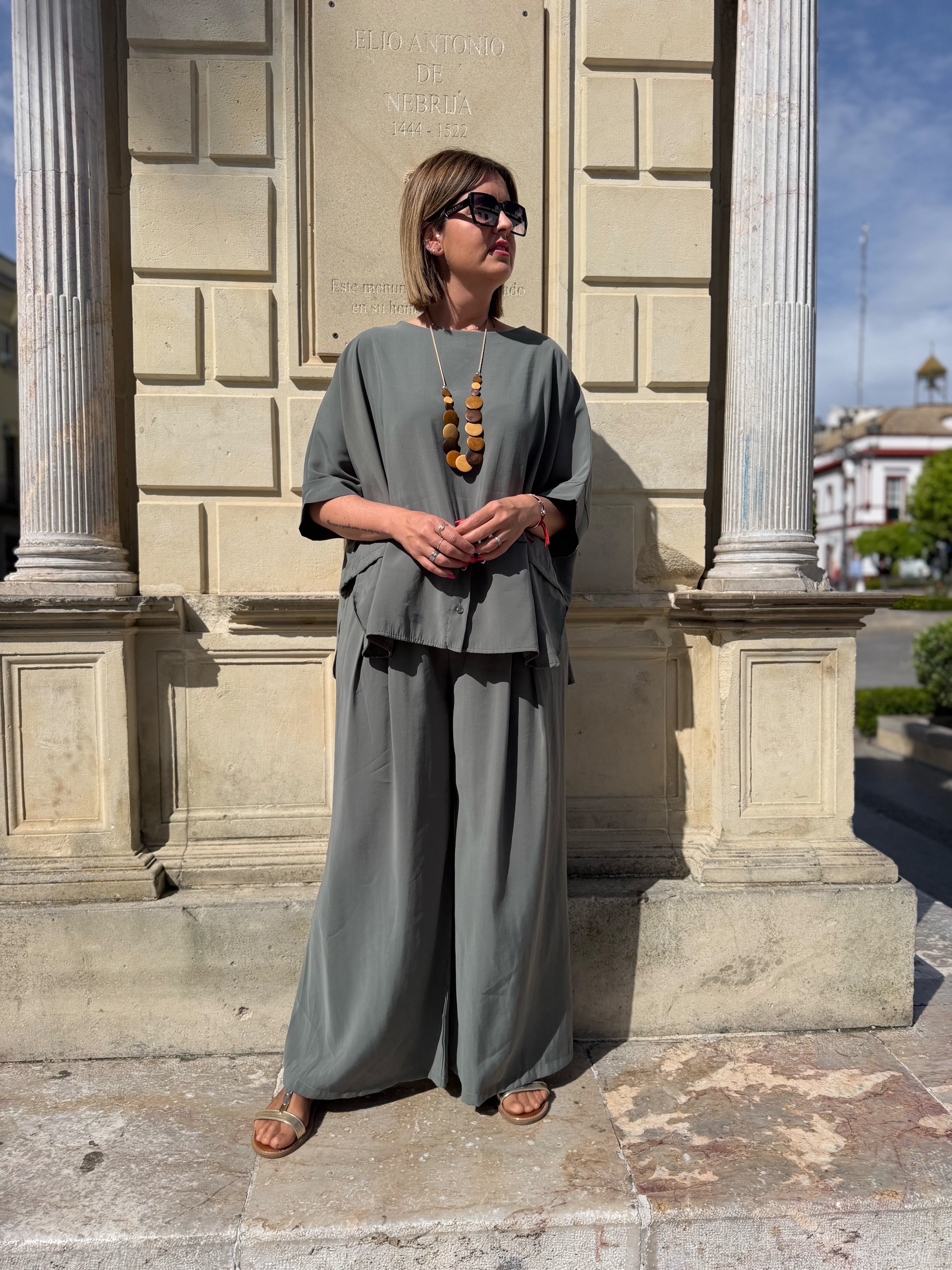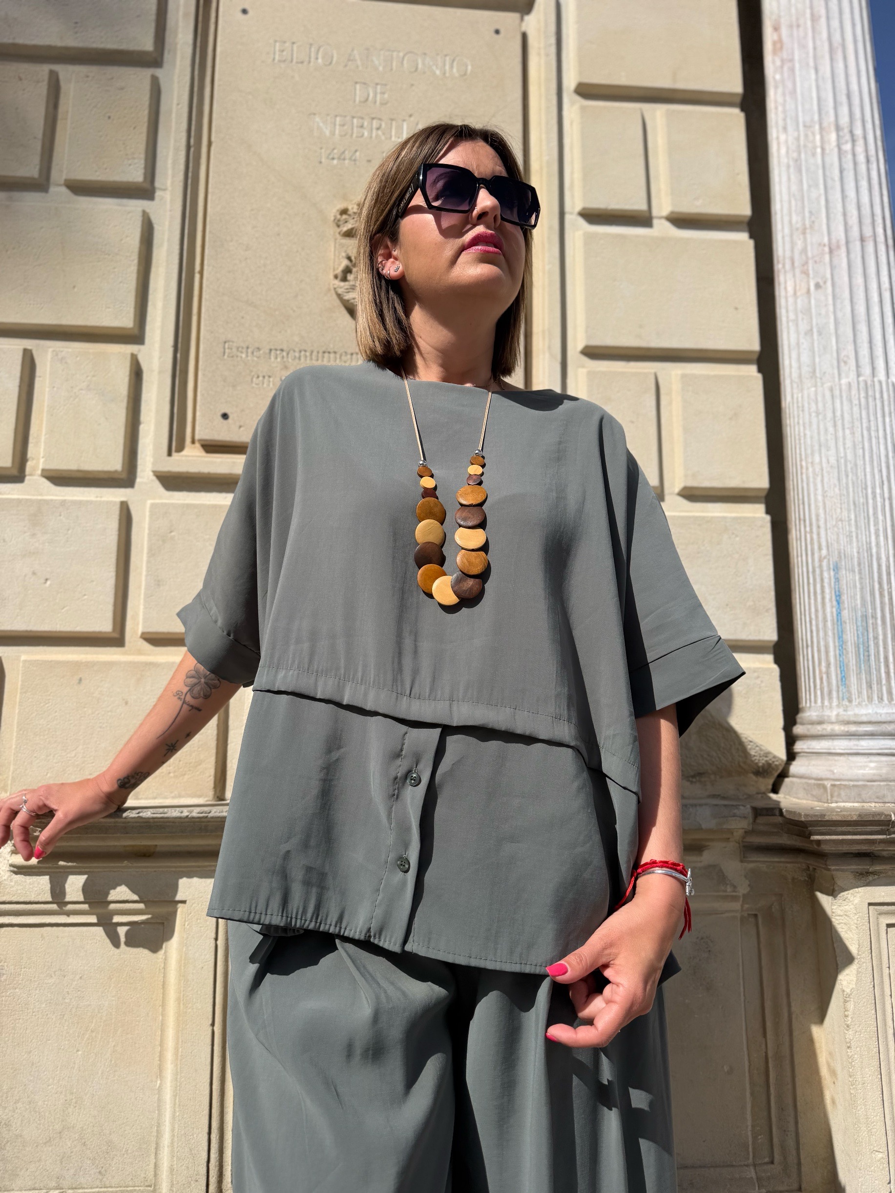 Su tejido de gran calidad aporta frescura y comodidad durante todo el día, mientras que su diseño oversize crea un efecto relajado pero sofisticado que favorece a todo tipo de siluetas. La parte superior amplia, combinada con el pantalón de pierna ancha, consigue un look armonioso, moderno y con muchísimo estilo.