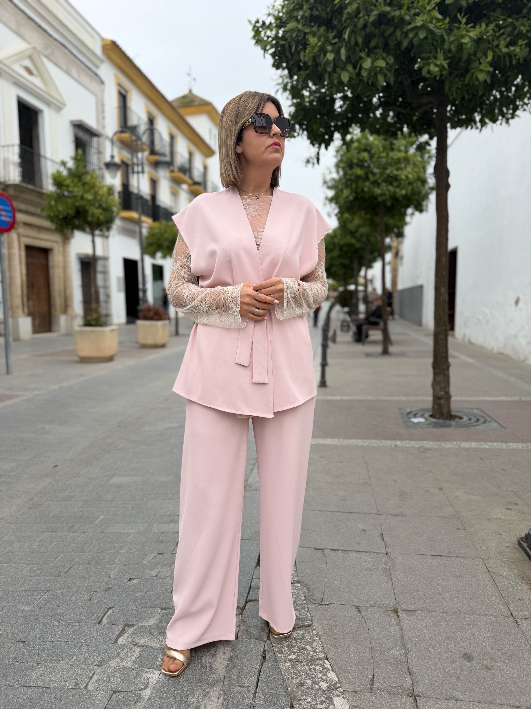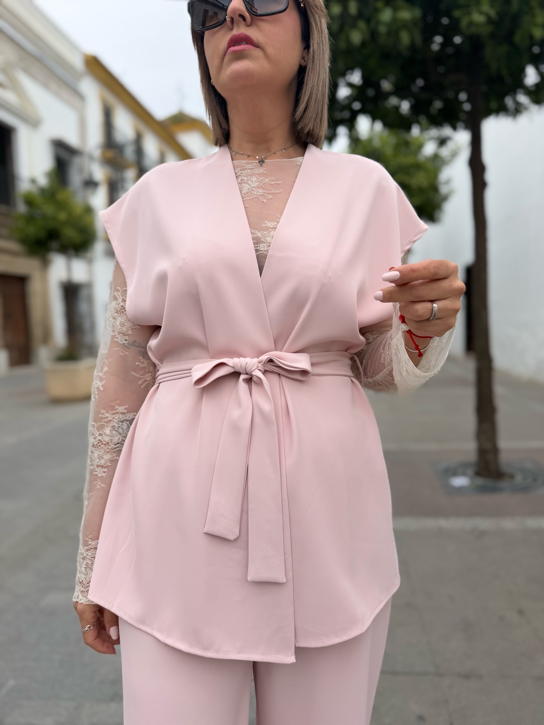 Conjunto de chaleco sin mangas de cierre con lazo anudado en el mismo tejido y pantalones a juego. Ambos en talla única pero adaptables a tallas desde 38 a 42. Sin duda es un conjuntazo con el que podrás destacar por estilo en cualquiera de tus eventos. Puedes combinarle un top de encaje como ha hecho Sandra, un lencero o simplemente llevarlos solo.