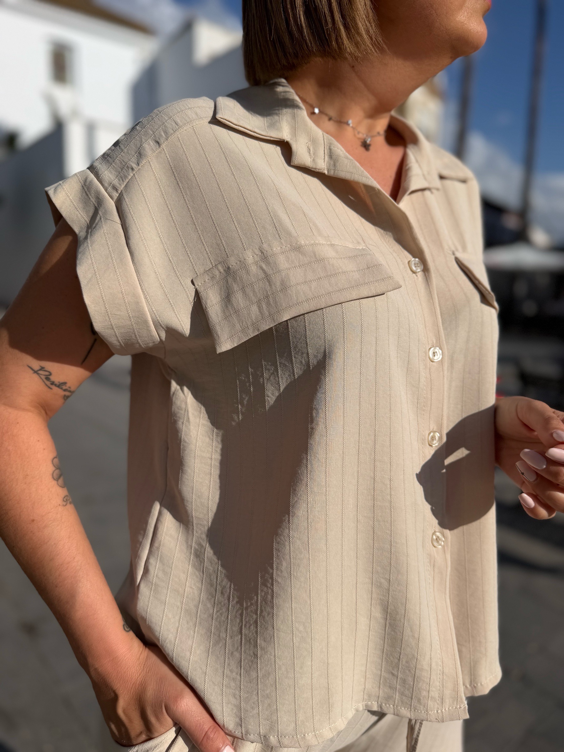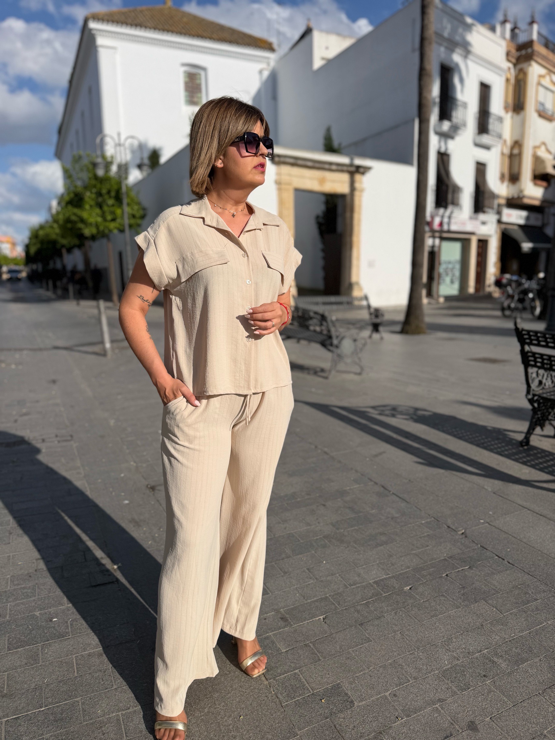 La camisa, con caída fluida y contorno de 110 cm, estiliza sin marcar y aporta movimiento. El pantalón, con cinturilla elástica y bolsillos, es pura comodidad y se adapta genial al cuerpo, haciéndote sentir cómoda pero súper arreglada.