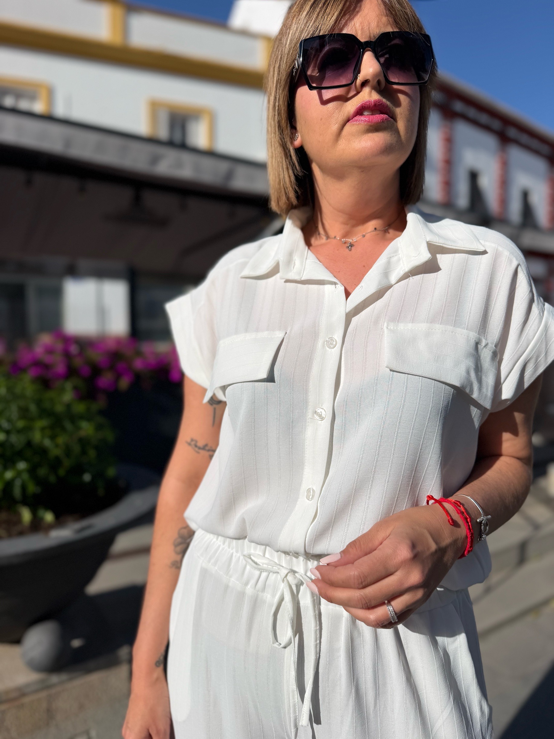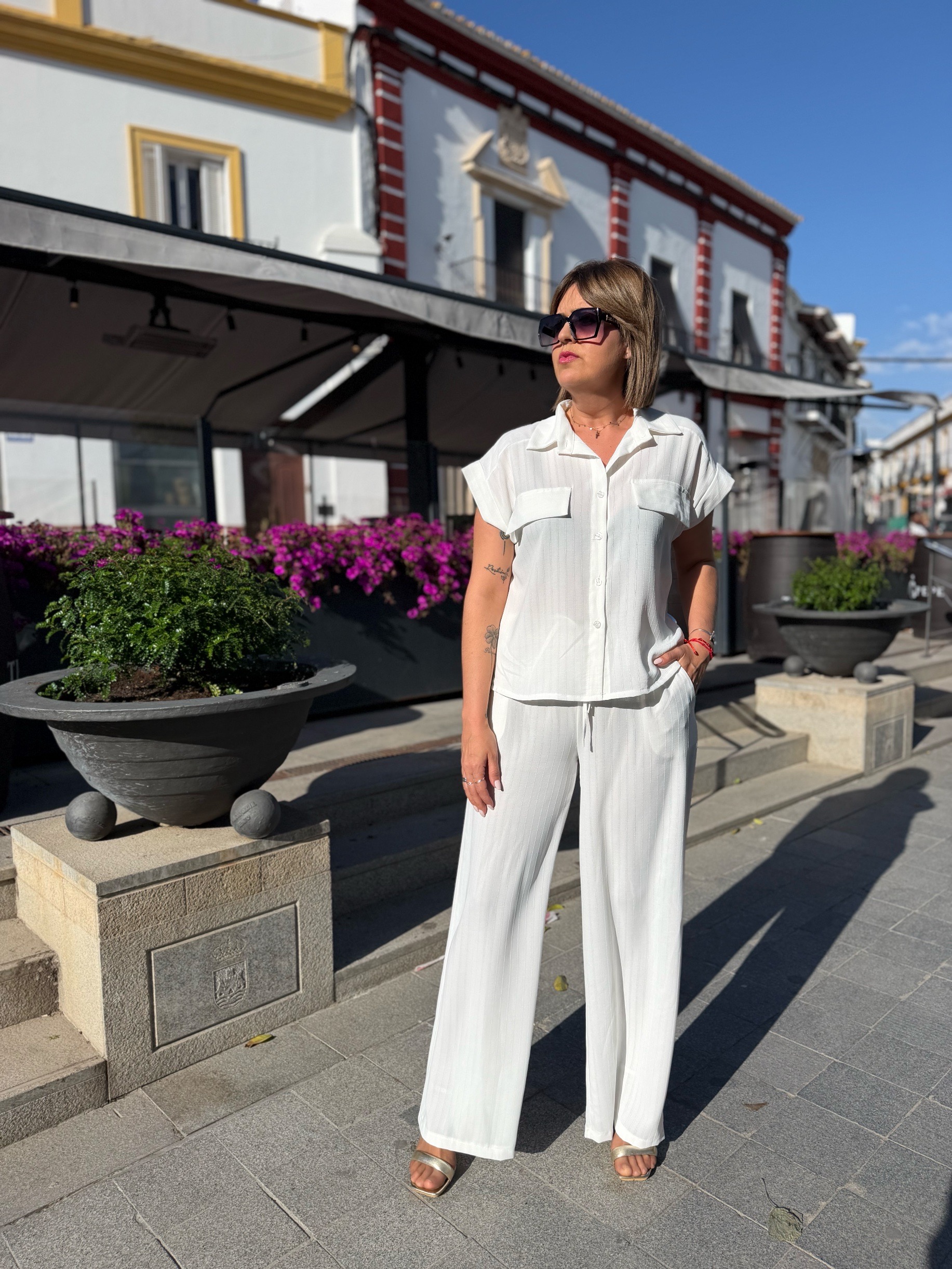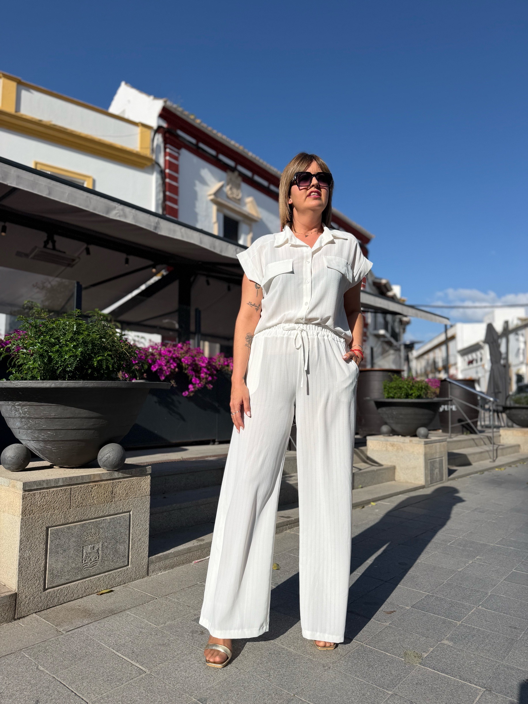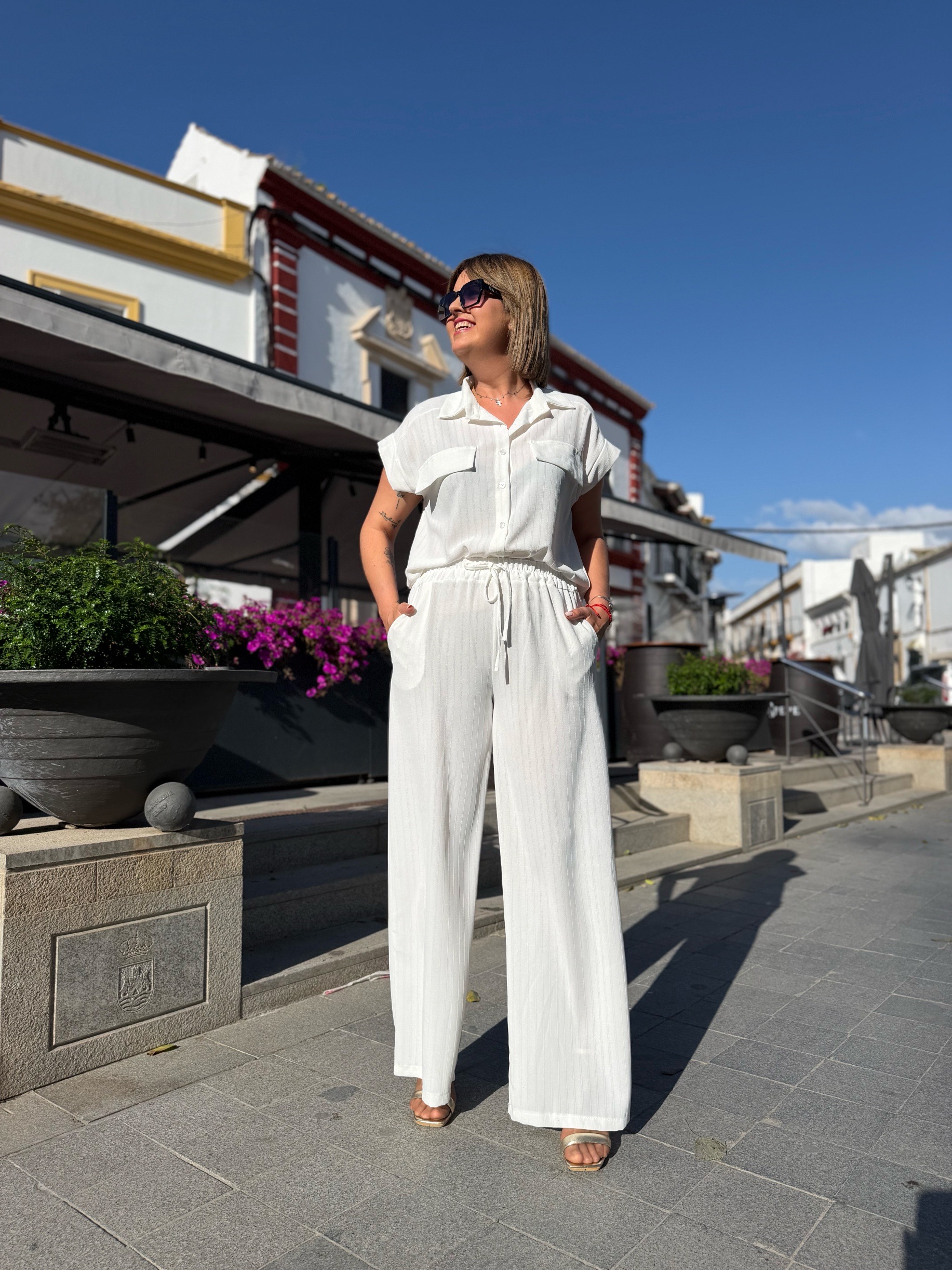 La camisa, con caída fluida y contorno de 110 cm, estiliza sin marcar y aporta movimiento. El pantalón, con cinturilla elástica y bolsillos, es pura comodidad y se adapta genial al cuerpo, haciéndote sentir cómoda pero súper arreglada.