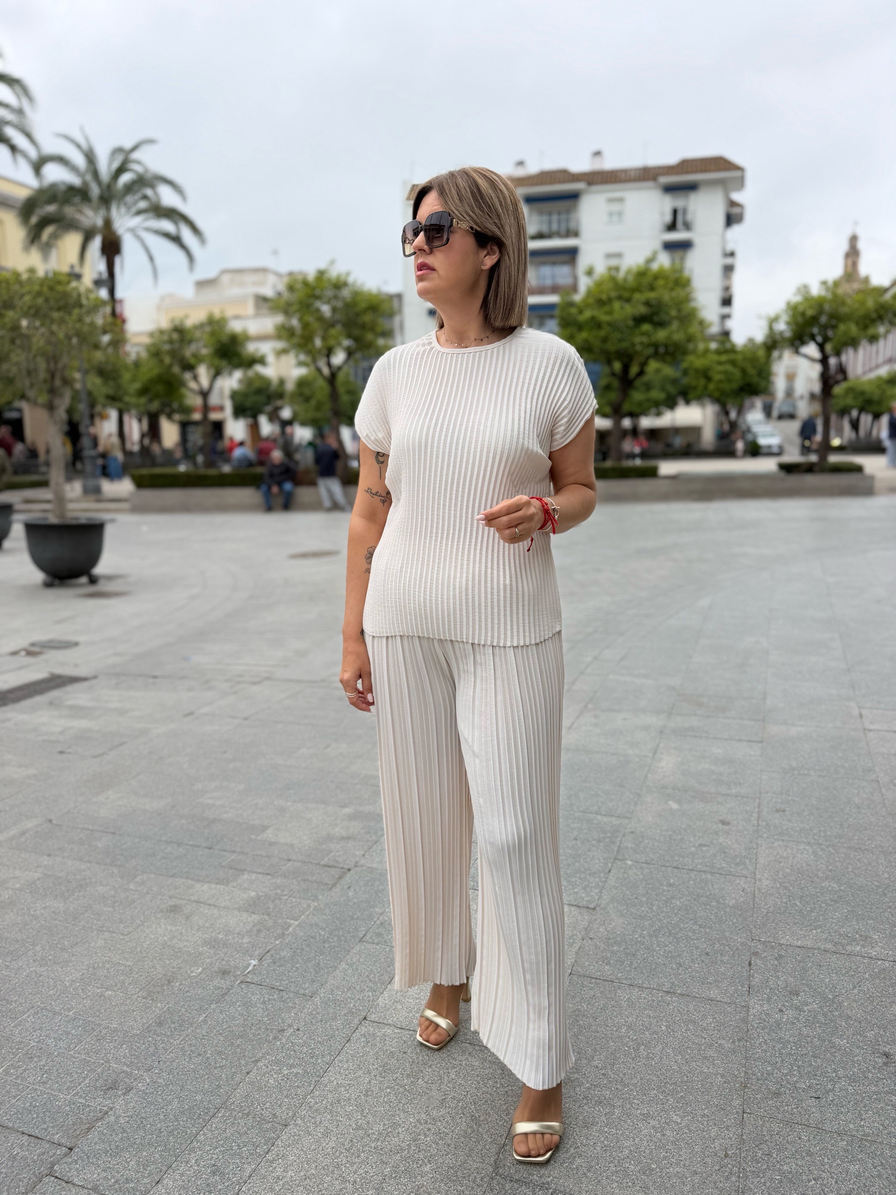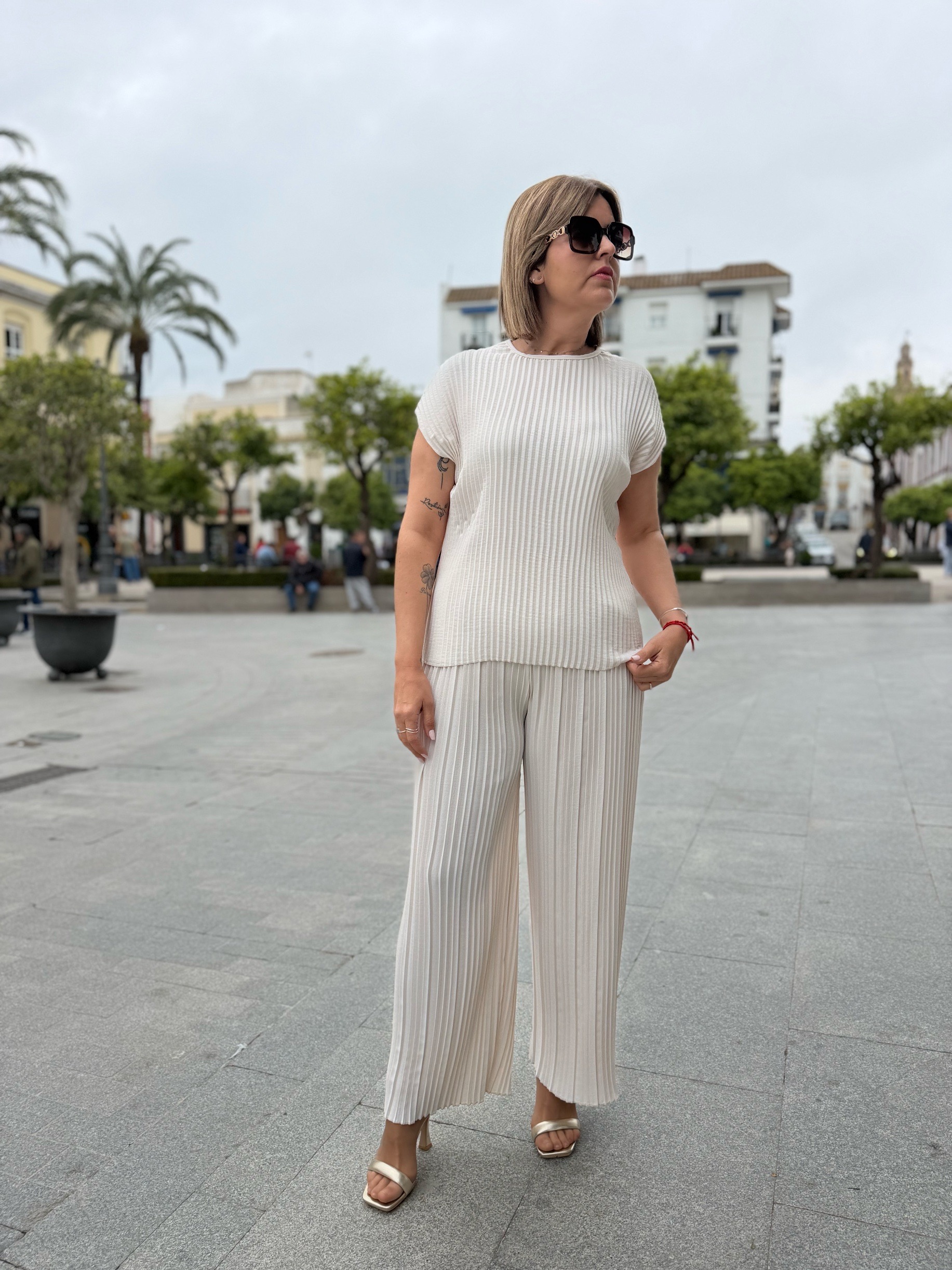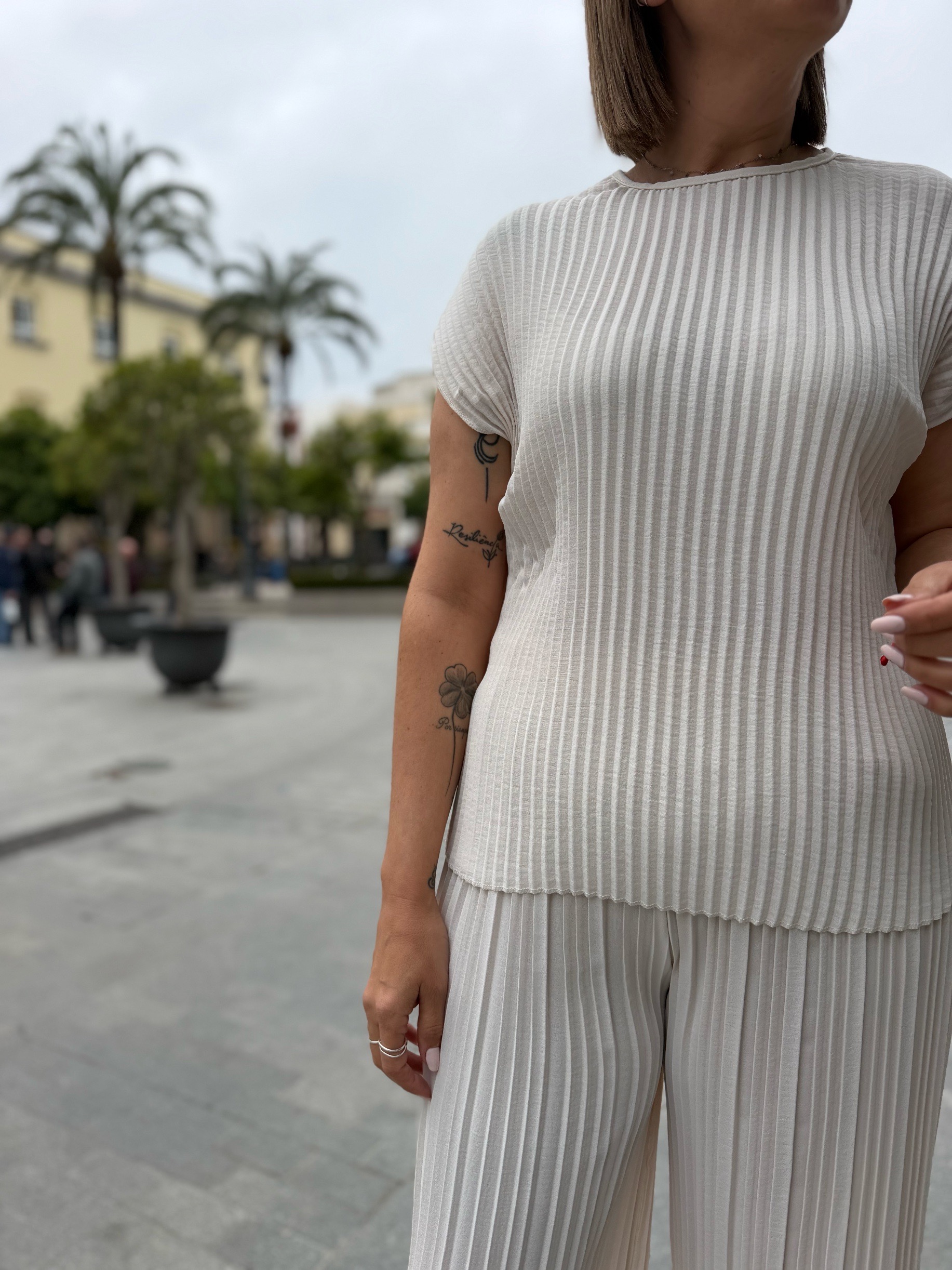Conjunto plisado beige.
