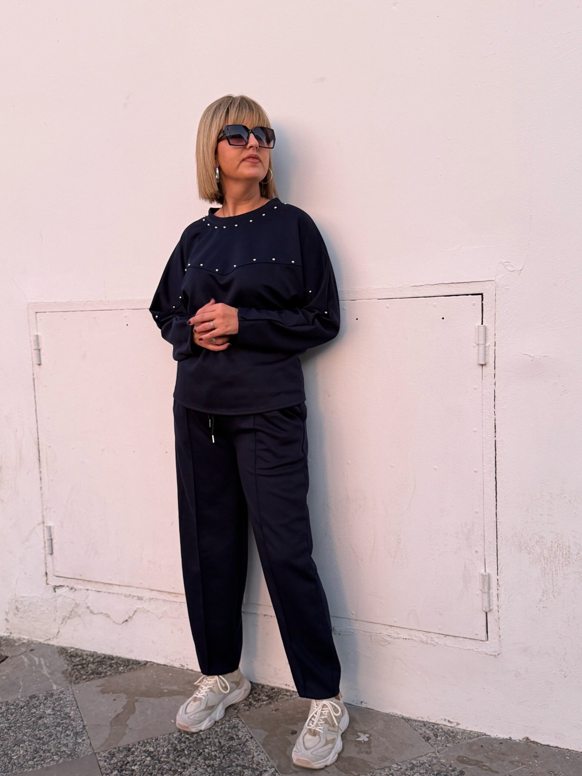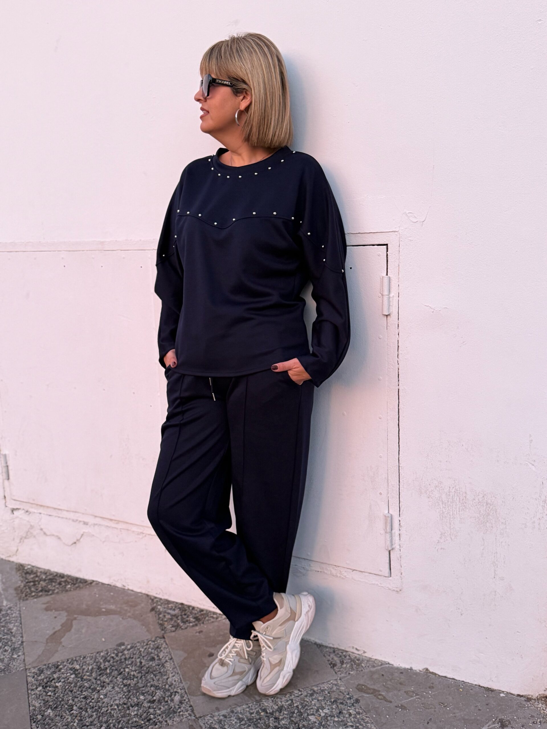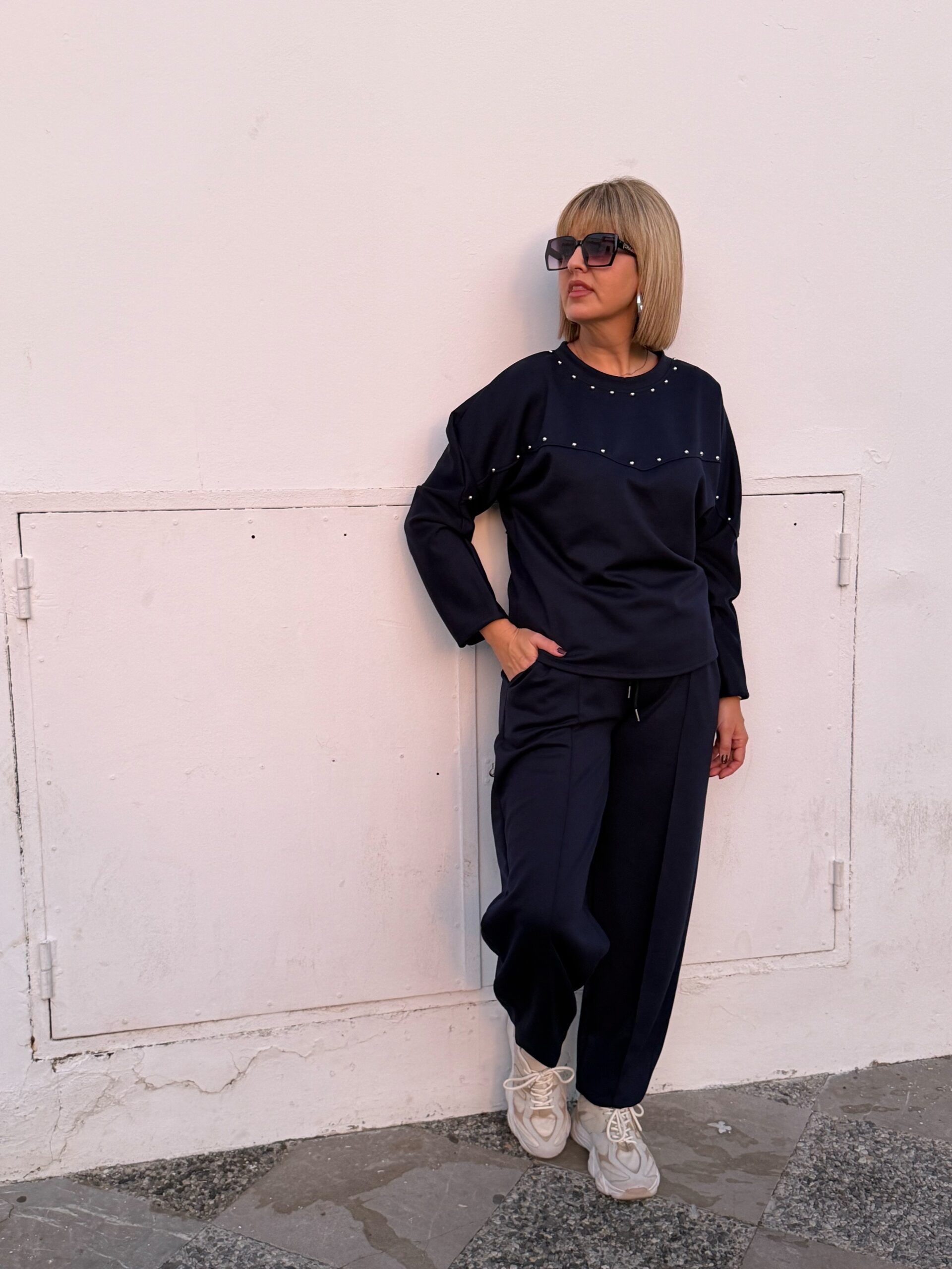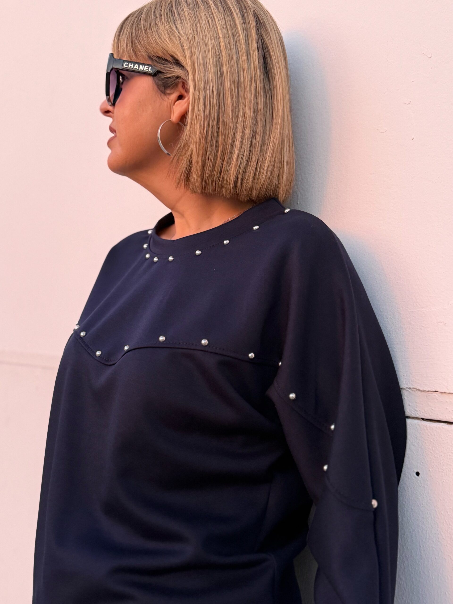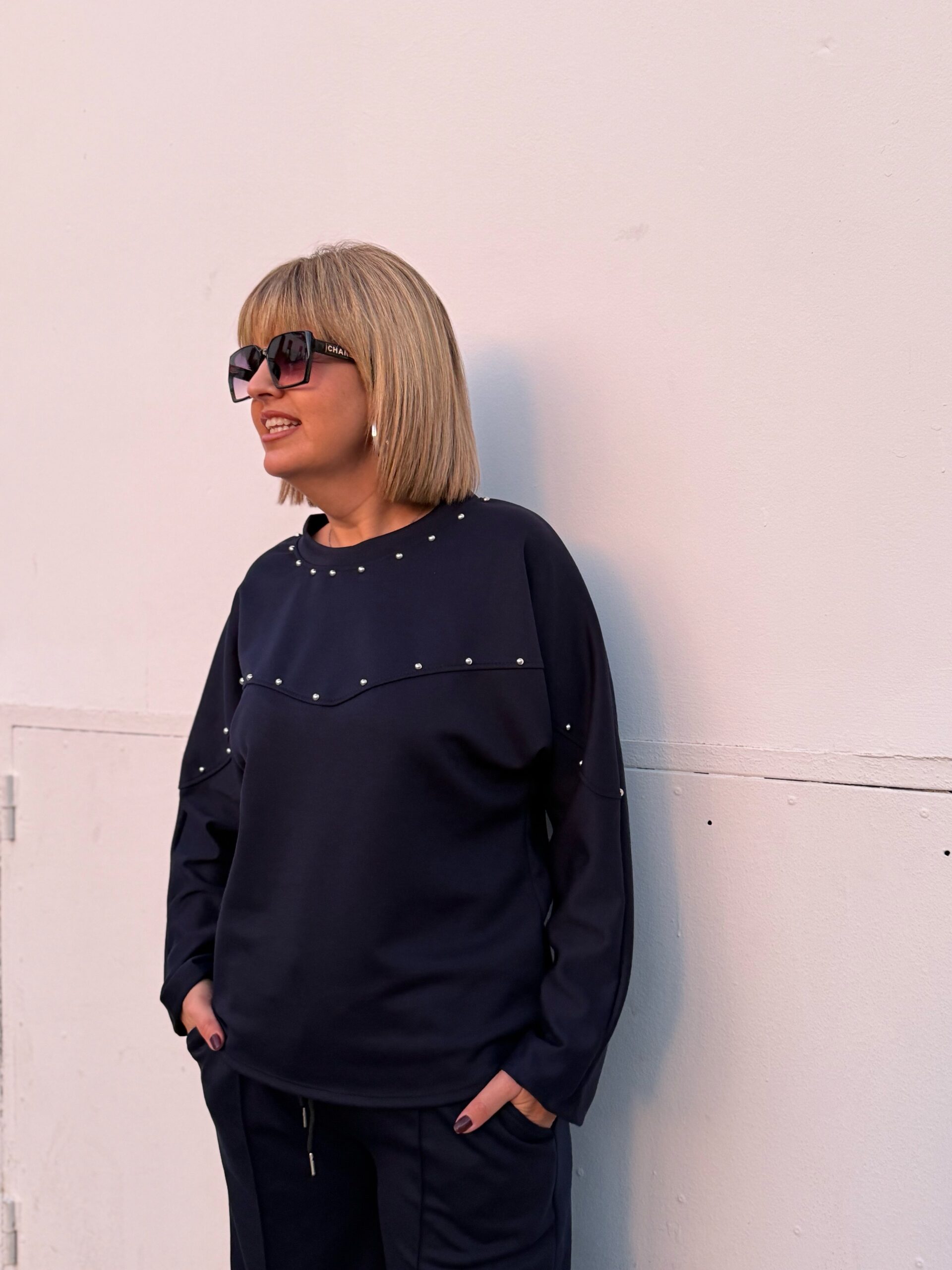 El detalle de las tachuelas en la sudadera le da un toque aún más especial y hace que sea más arreglado sin dejar de ser un outfit casual.