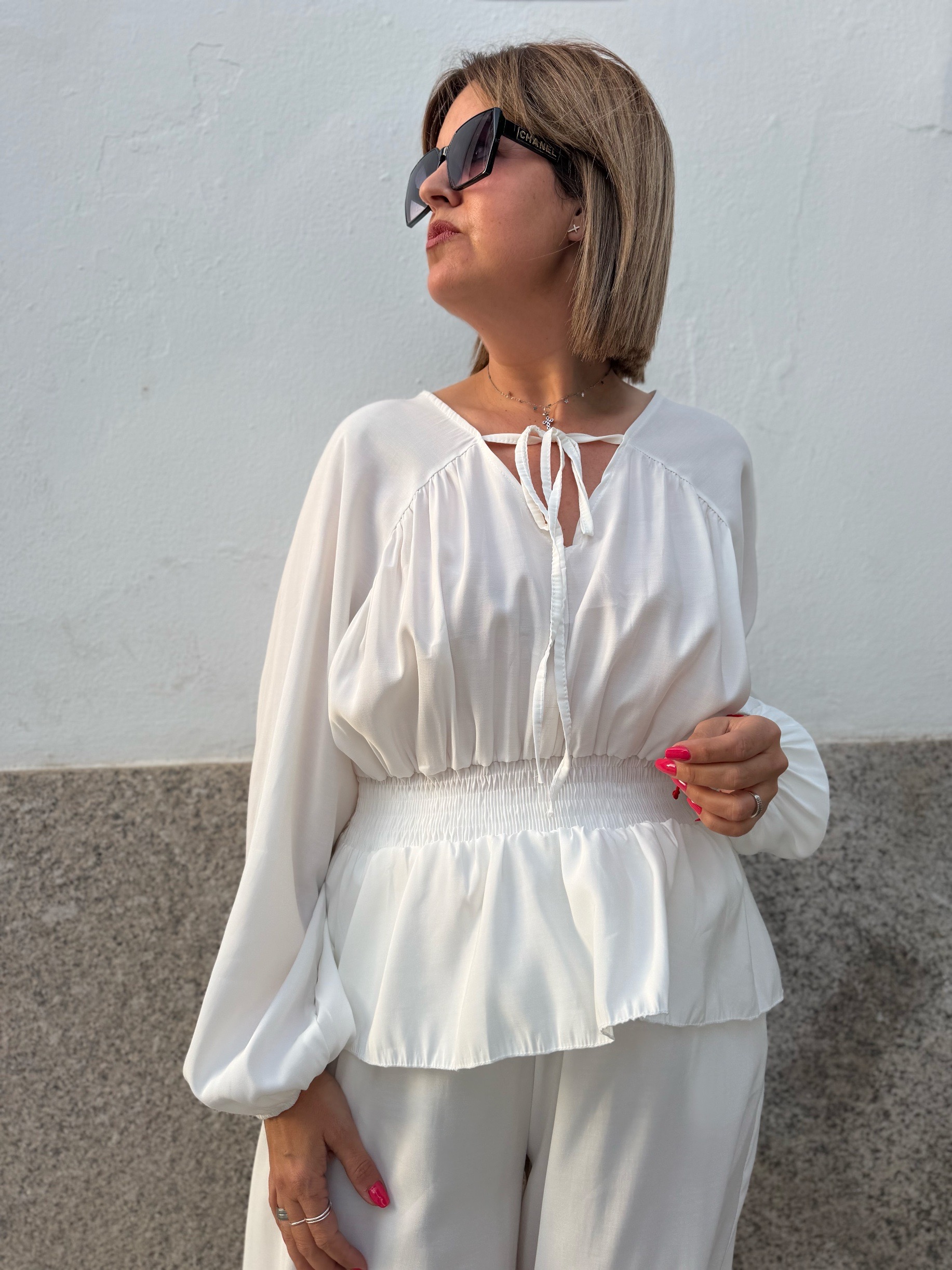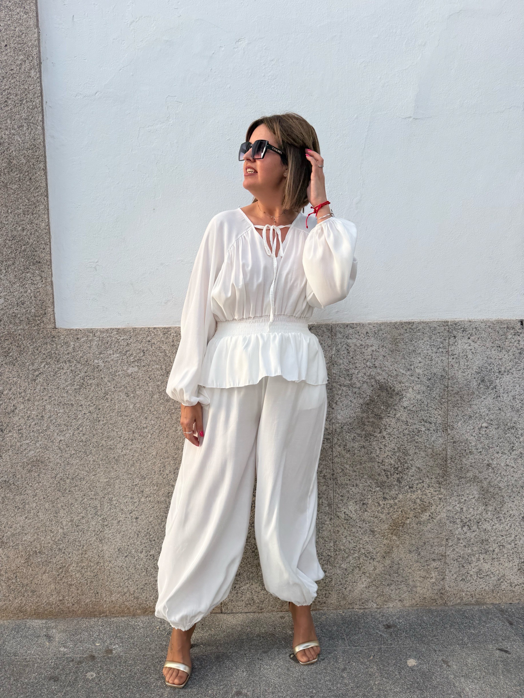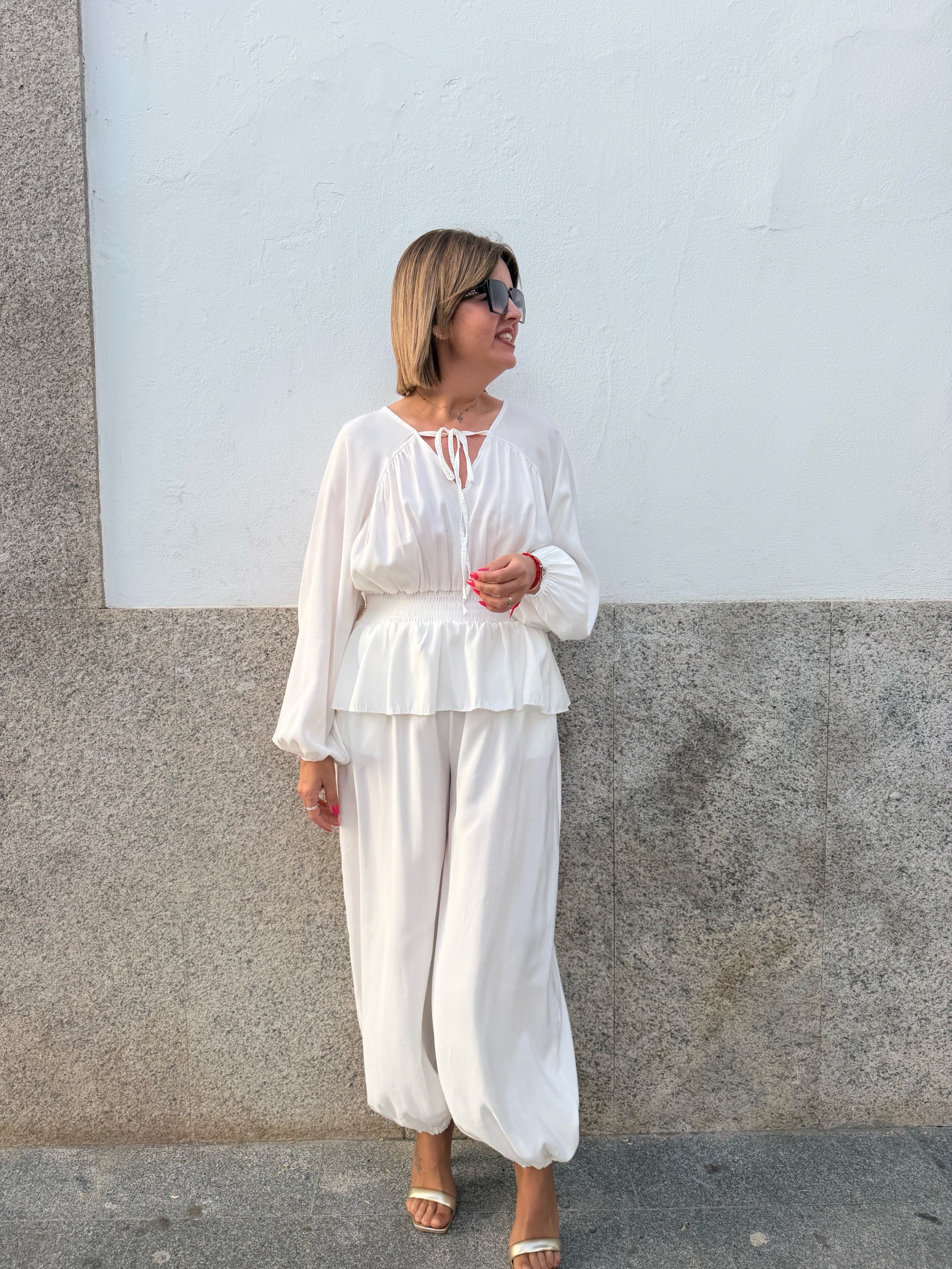 La parte superior, con un delicado escote y mangas con volumen, aporta ese toque sofisticado y femenino que marca la diferencia. El pantalón, de corte amplio y acabado en el tobillo, añade movimiento y un aire moderno que lo convierte en un look irresistible tanto para eventos como para ocasiones especiales.