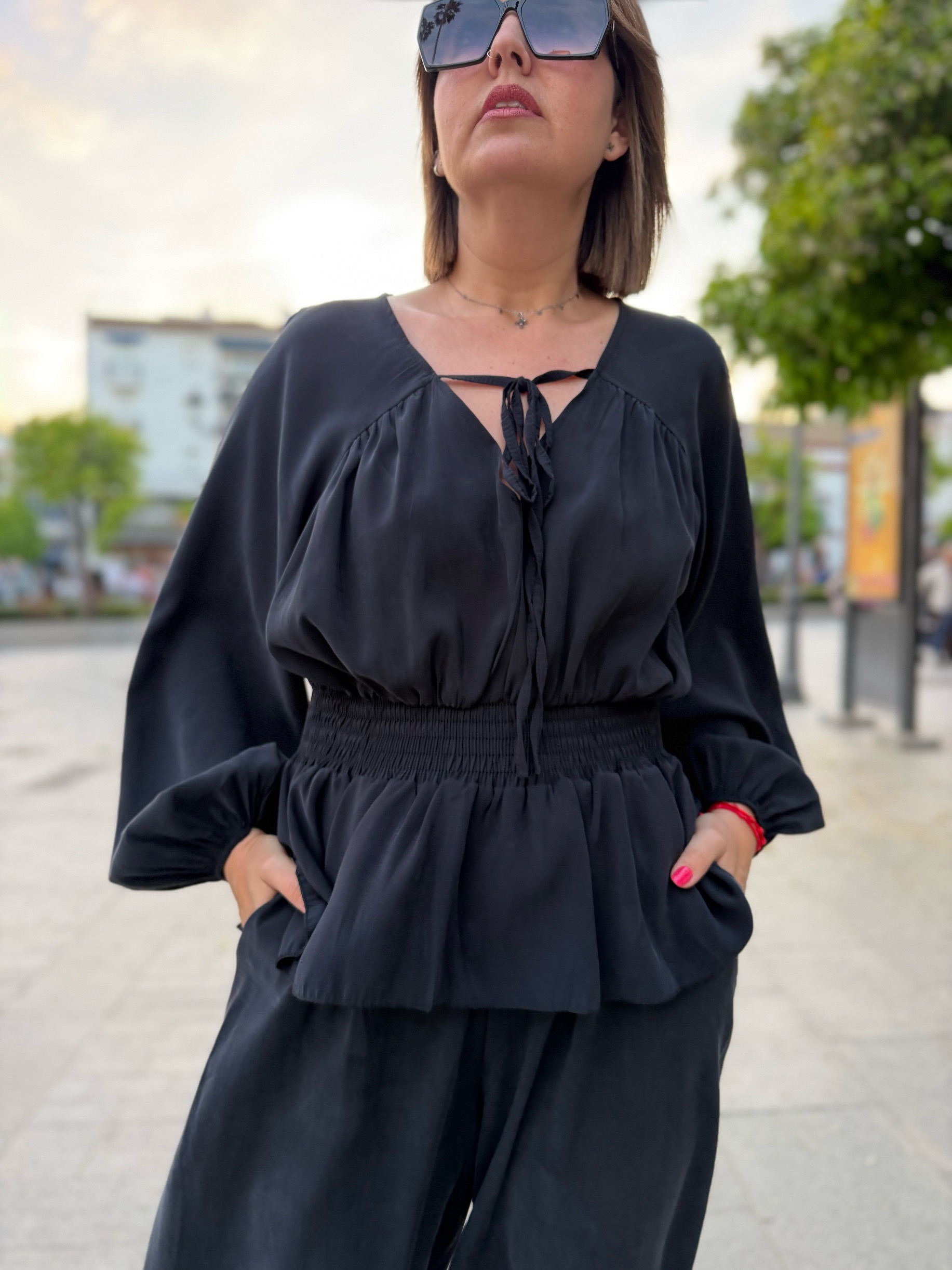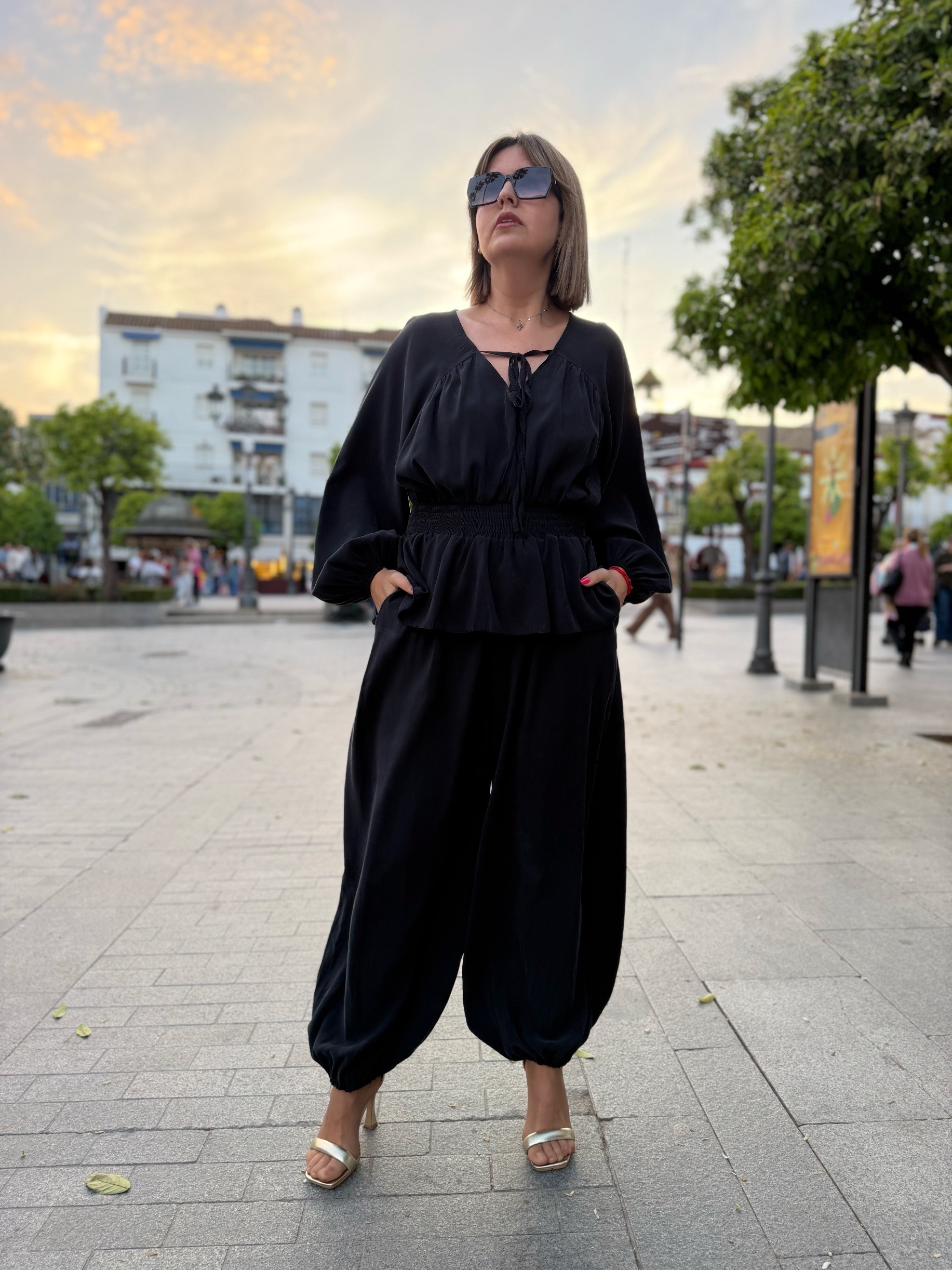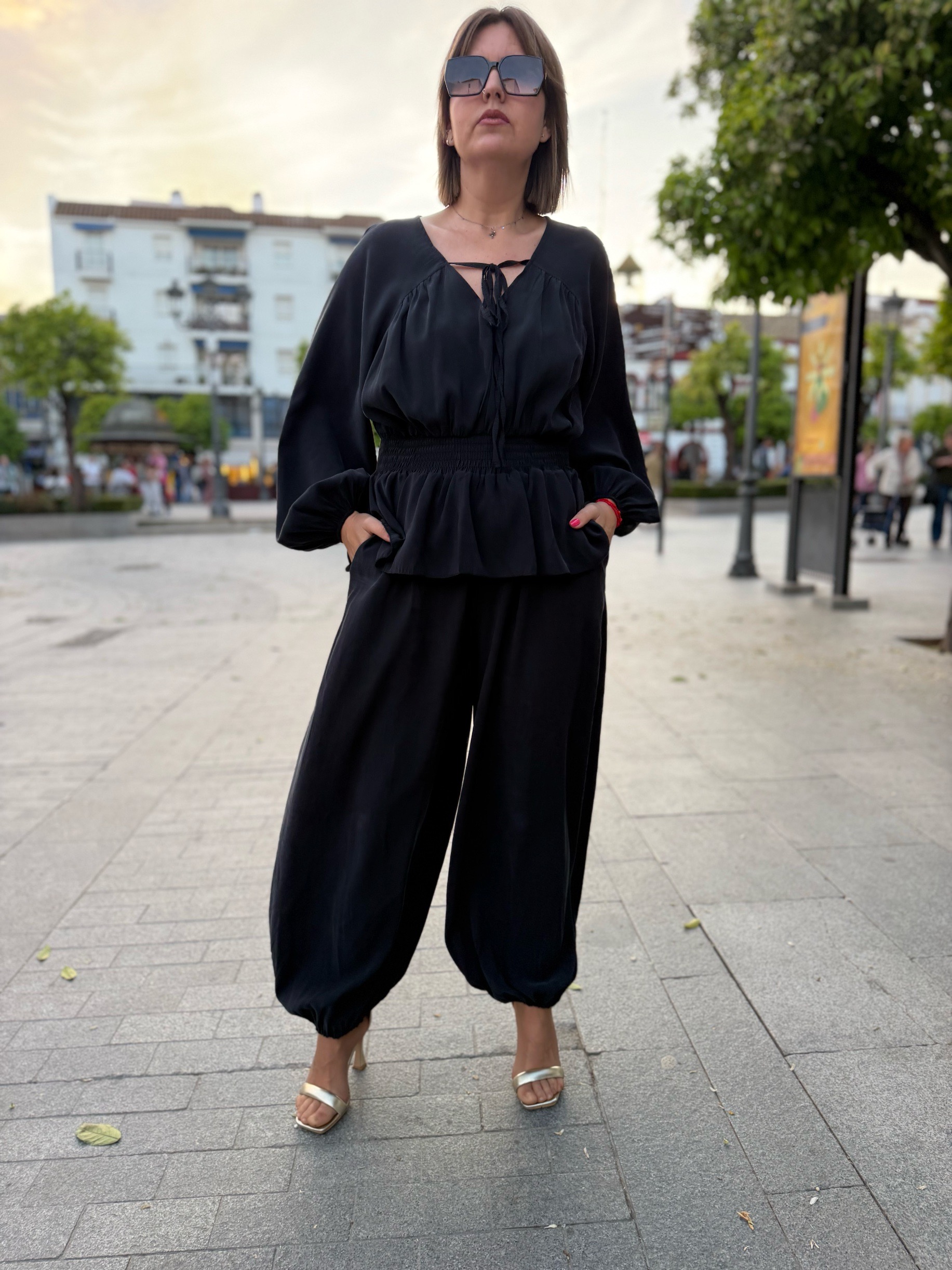 La parte superior, con un delicado escote y mangas con volumen, aporta ese toque sofisticado y femenino que marca la diferencia. El pantalón, de corte amplio y acabado en el tobillo, añade movimiento y un aire moderno que lo convierte en un look irresistible tanto para eventos como para ocasiones especiales.