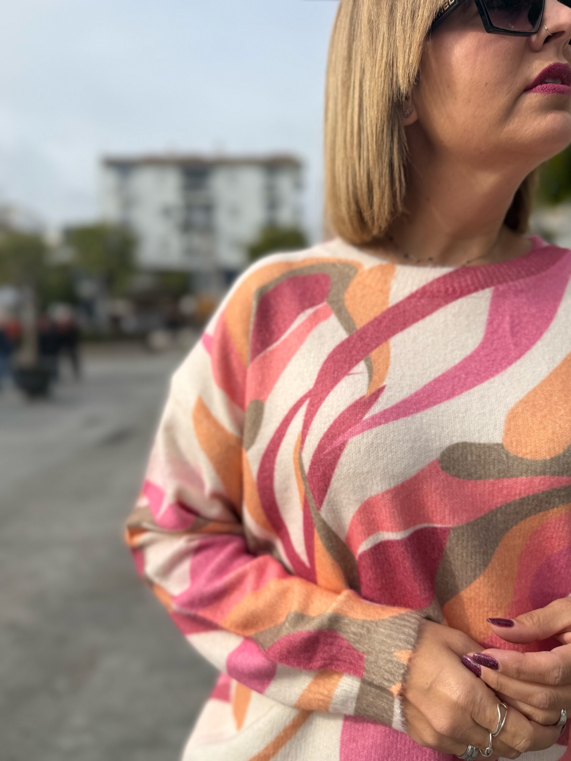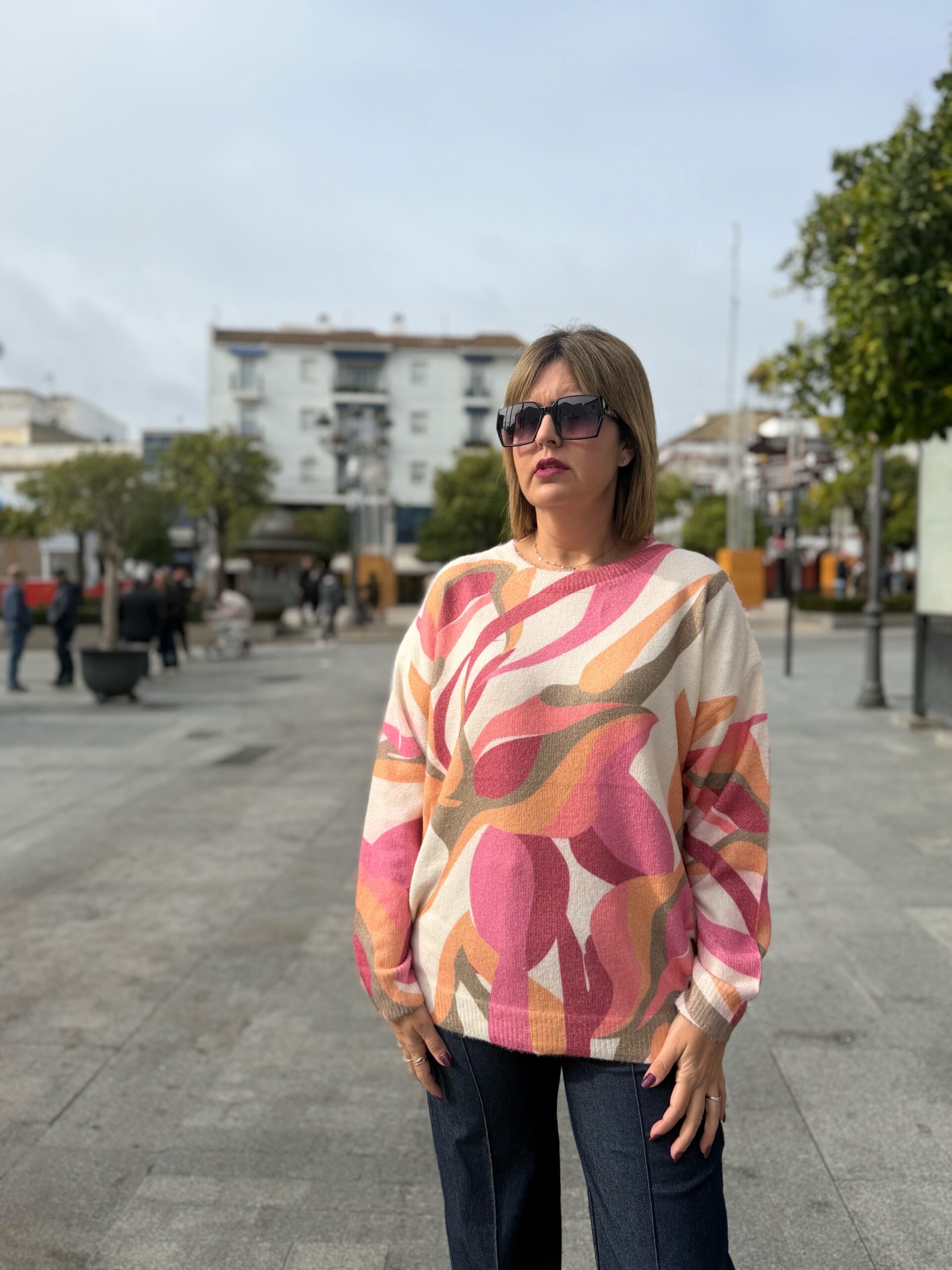 Jersey en tejido de lana suave y muy, muy cómodo además de confortable. Con estampado alegre de nueva temporada. En talla única pero anchito (120 ctms de contorno). Ideal para combinar con unos jeans y montarte un outfit súper alegre y original.