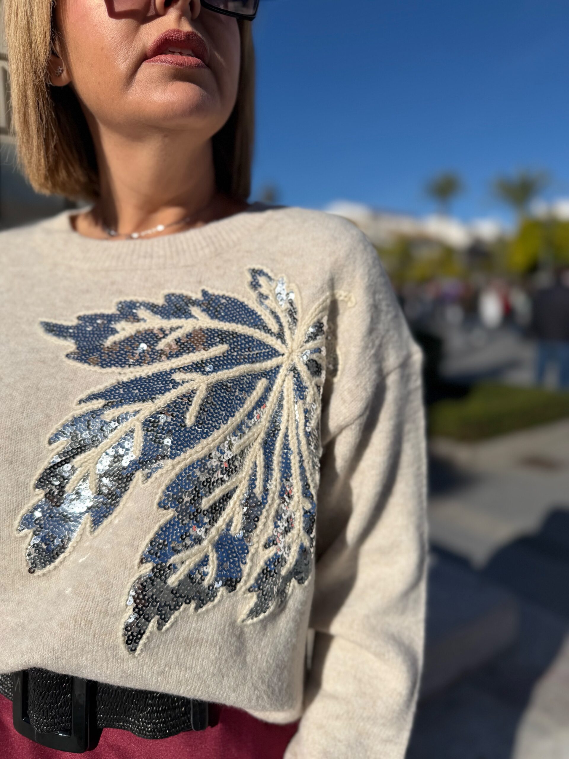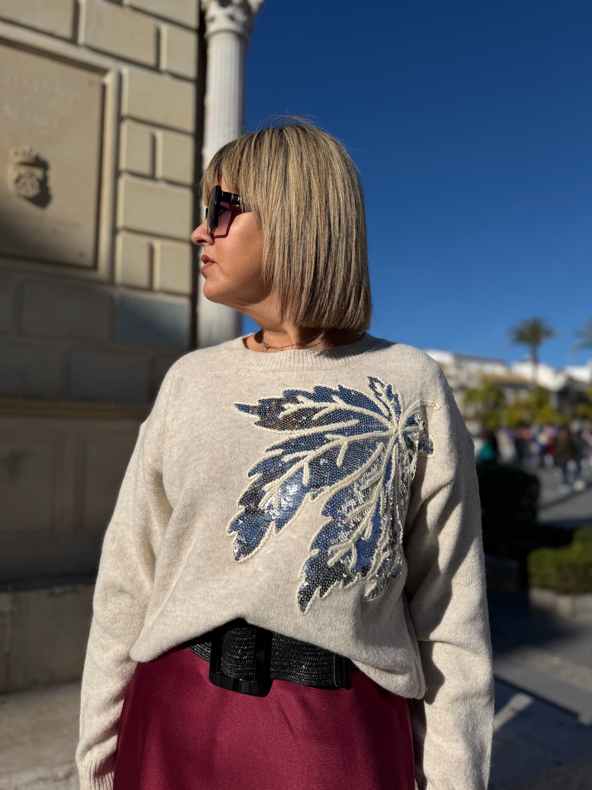 Jersey en tejido de lana de gran calidad, muy suave, confortable y con ese dibujo en lentejuelas que le da ese rollo aún más de vestir. Muy combinable con prácticamente todo e ideal para montarte un outfit arregladito para estos días de fiesta que ya están aquí, sin renunciar a ir abrigada jiji…