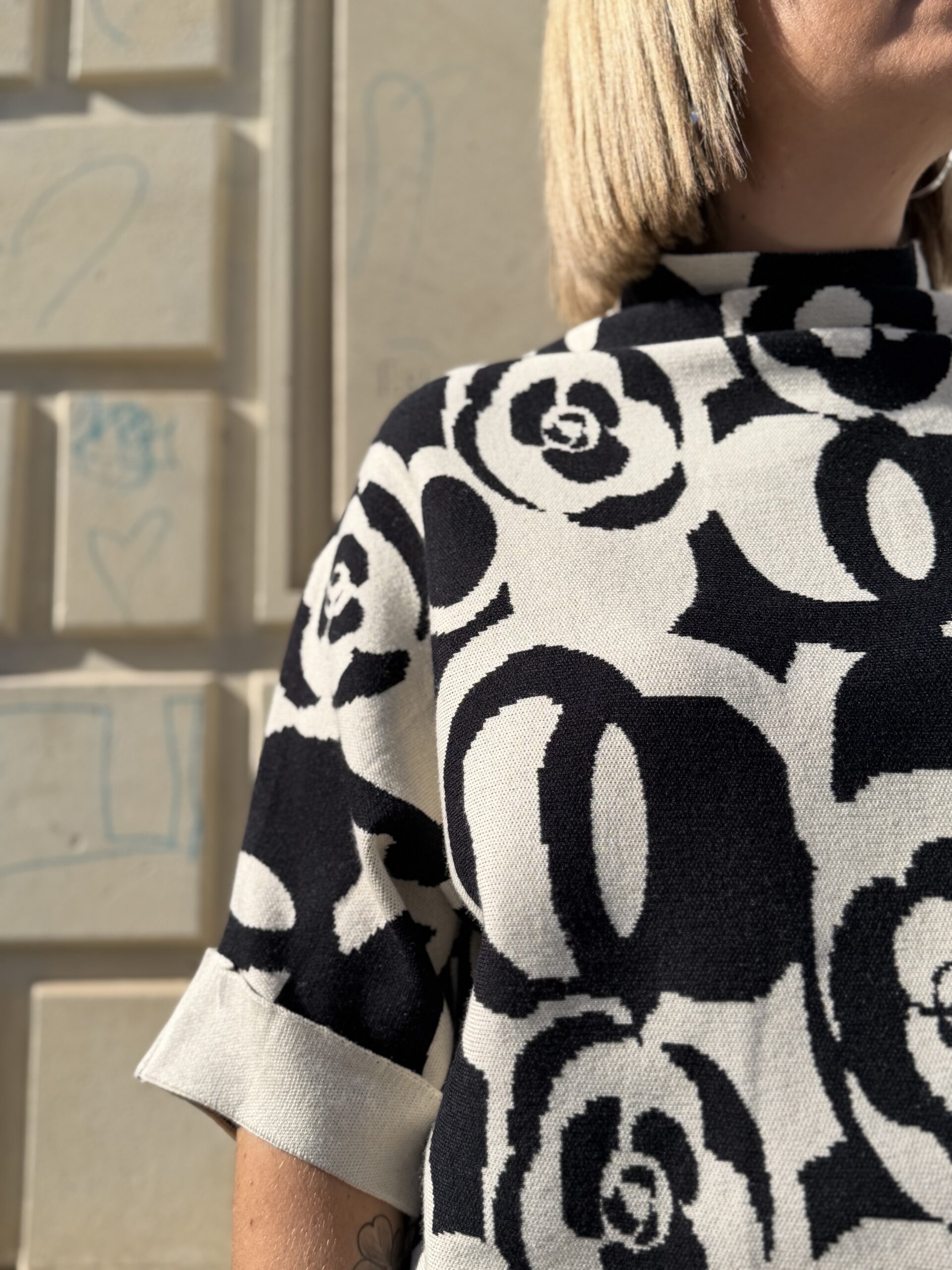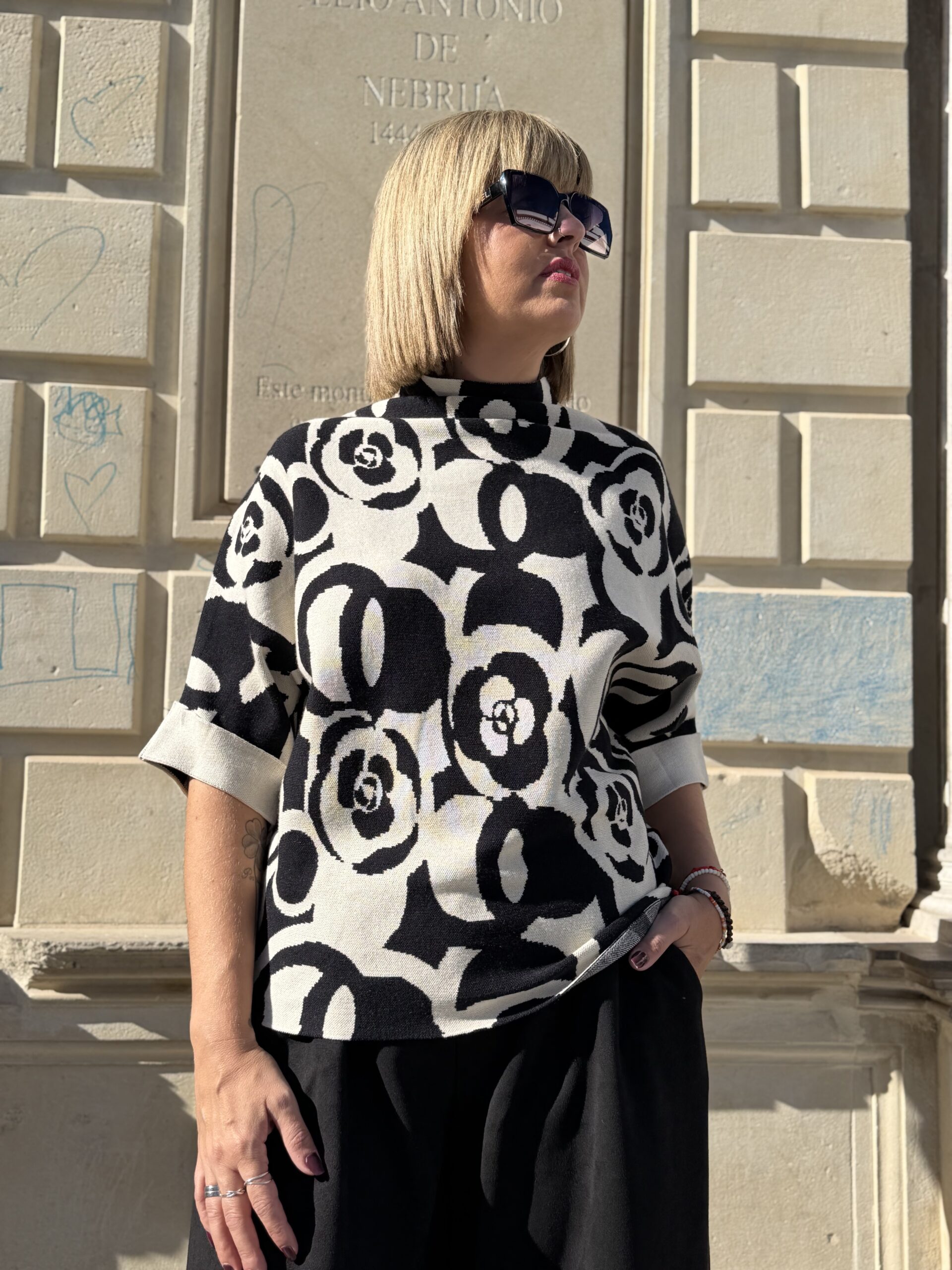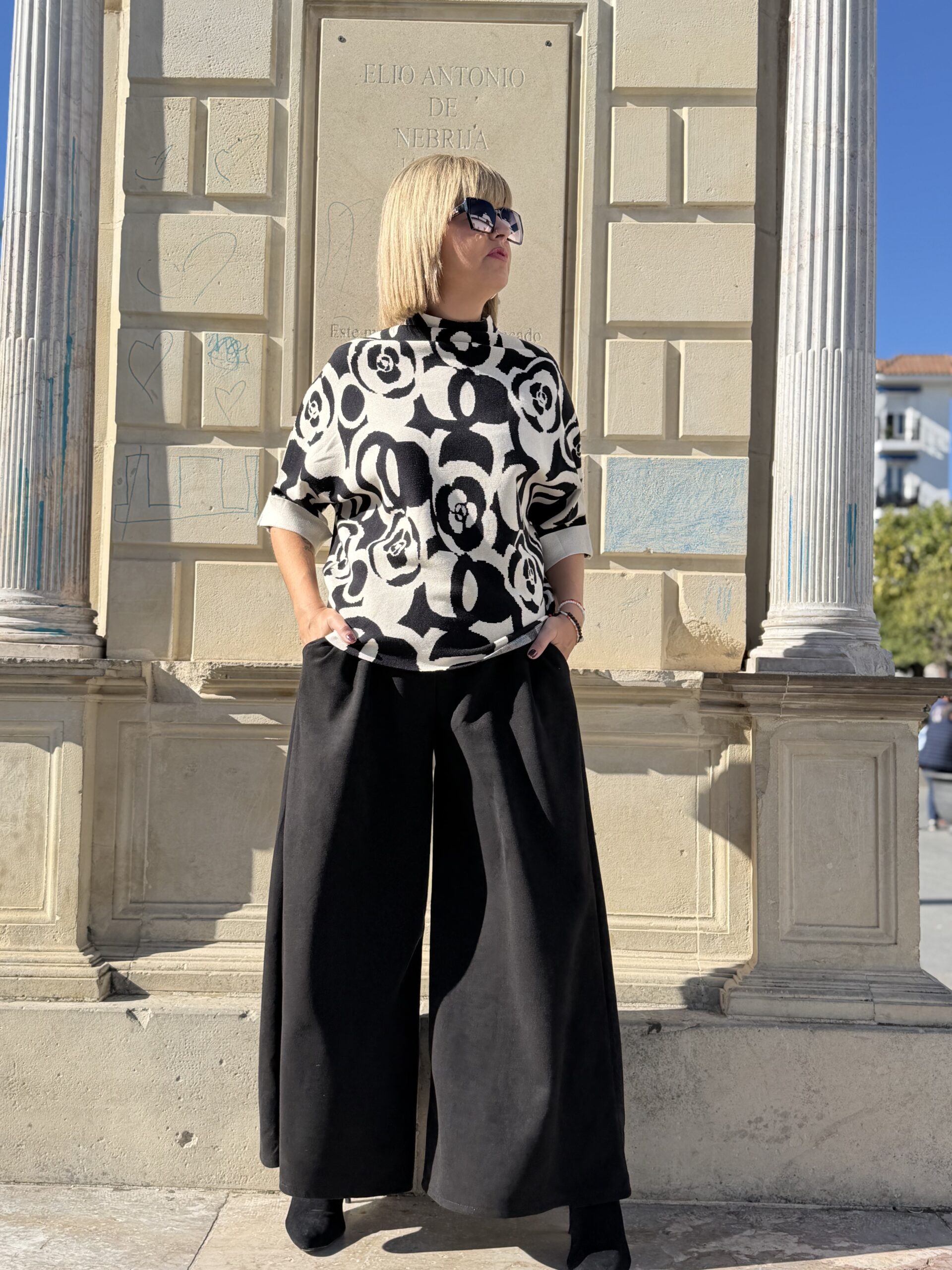 Jersey estampado en tejido de lana de gran calidad. Talla única pero adaptable a muchísimas tallas ya que tiene un contorno de 120 ctms y una caída espectacular que hace que quede bien a todas las figuras. Súper original y súper especial. Combinable prácticamente con todo pero me encanta con el negro y montarte un outfit ideal para una cena, almuerzo o simplemente ir a trabajar con estilo.