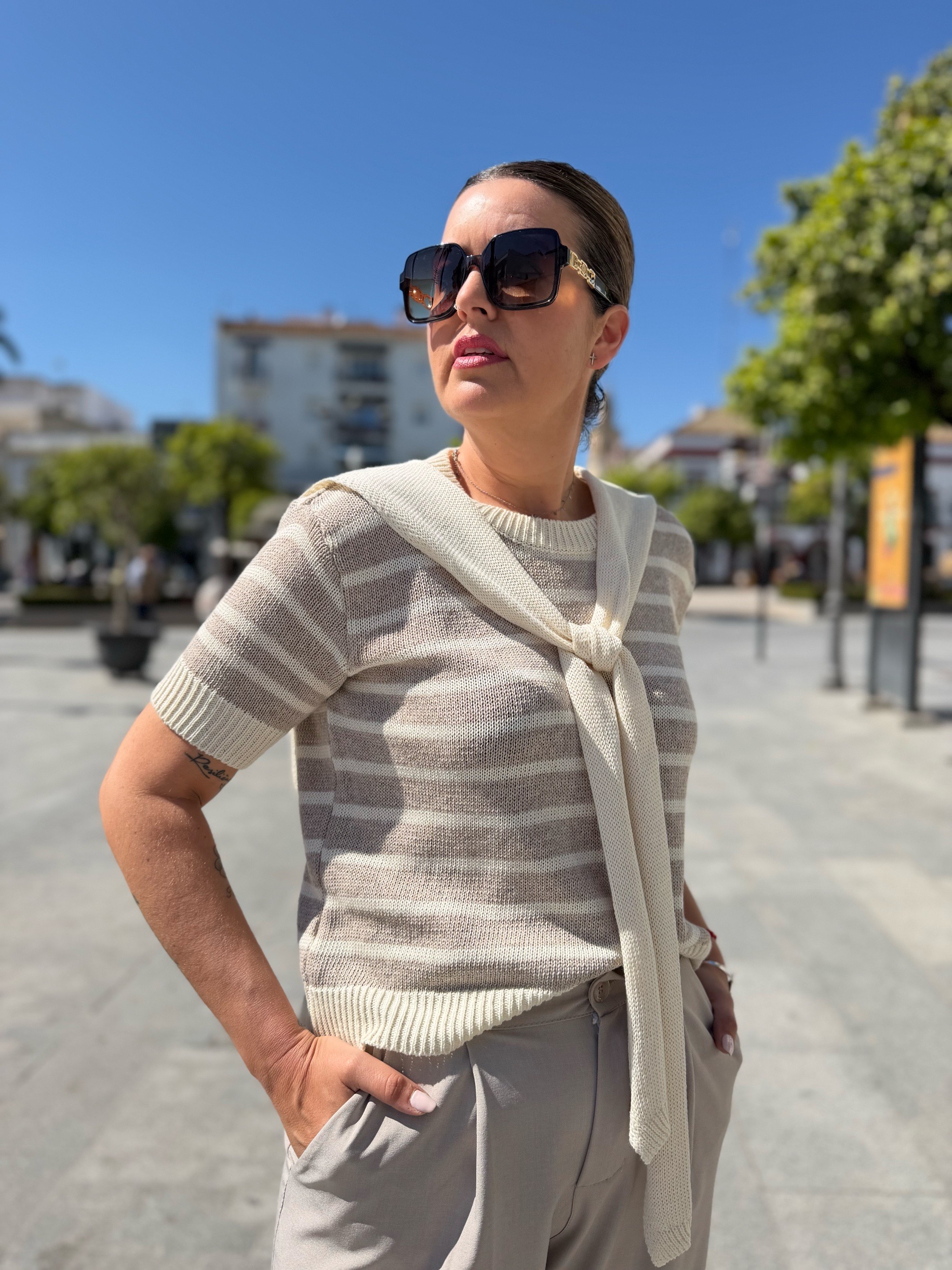 Jersey de hilo de gran calidad con detalle de falso jersey a juego anudado a los hombros. En talla única pero que se adapta a tallas de entre 36 a 42 (108 ctms de contorno). Con una rallita espectacular y ese toque del jersey al hombre tan chic. Súper combinable tanto con un pantalón de vestir como con unos jeans.