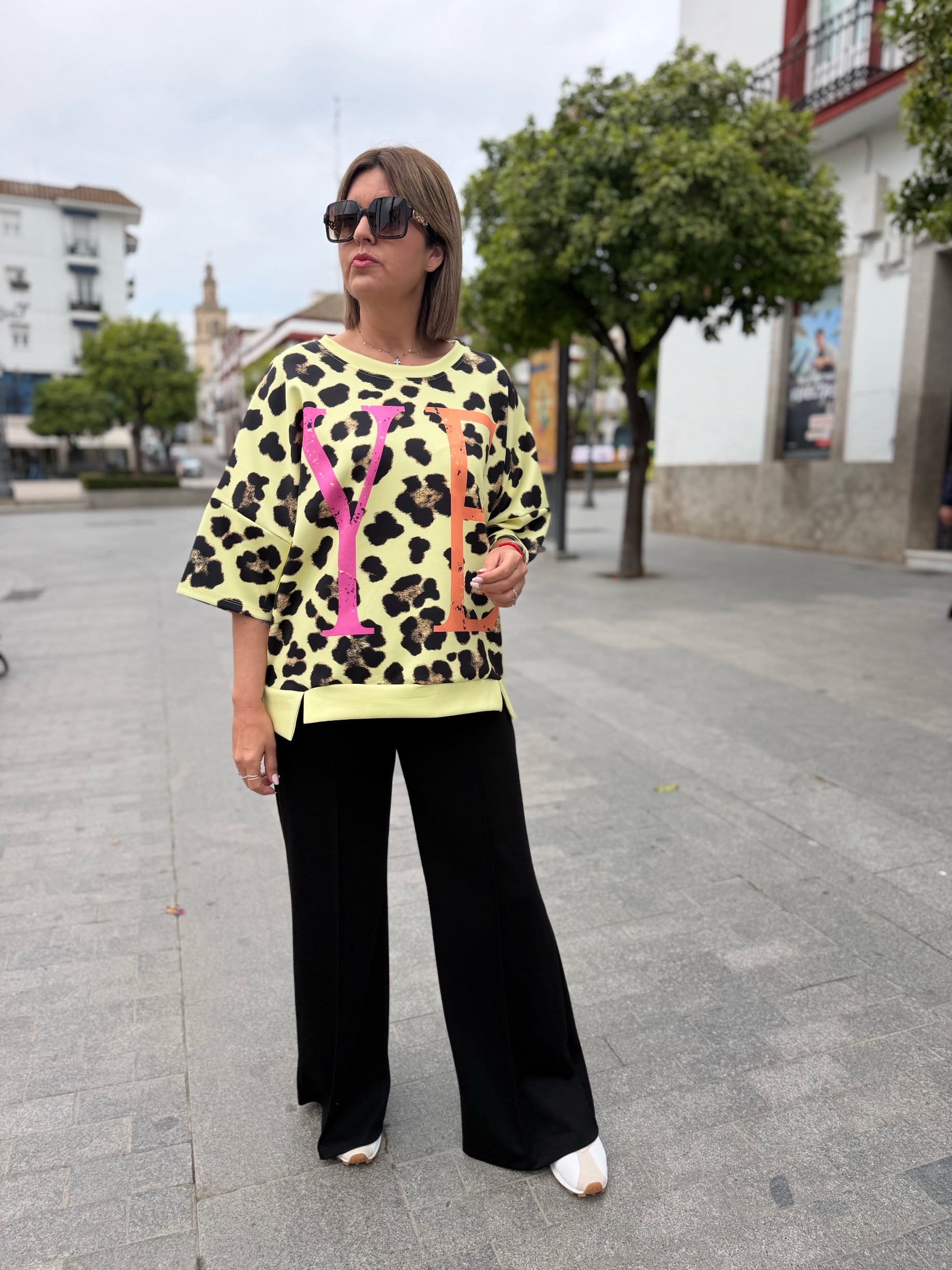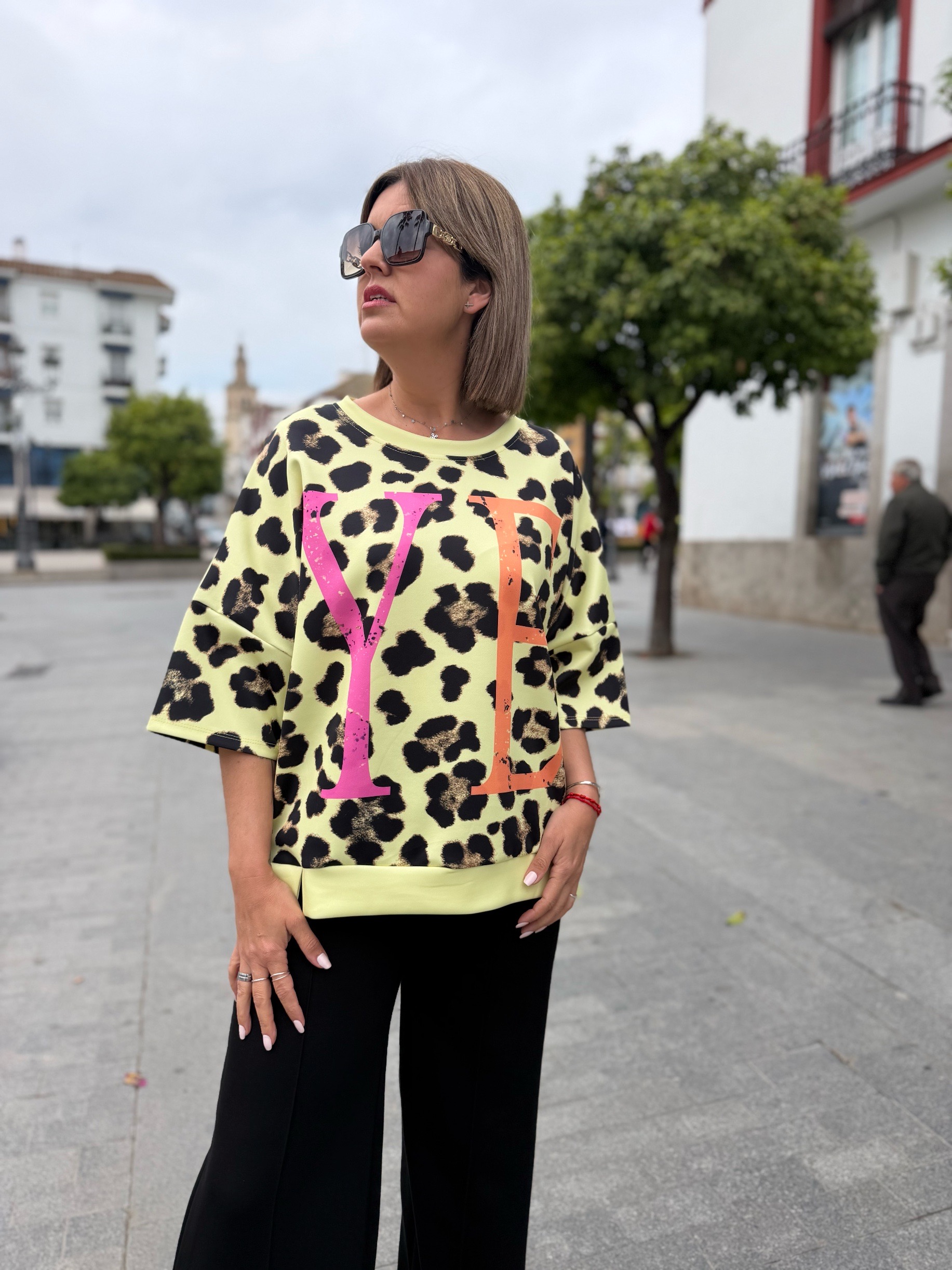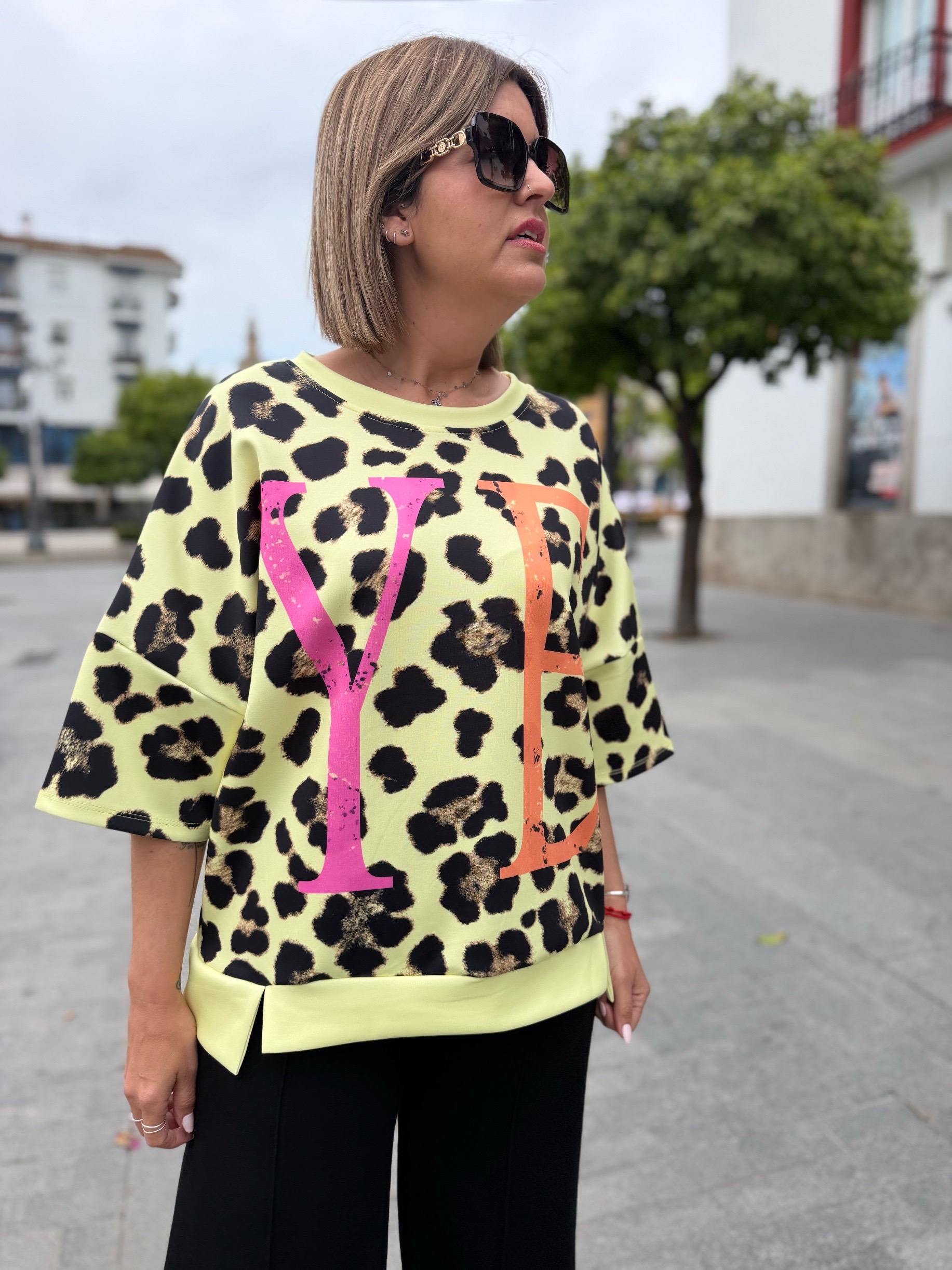 Es más una sudadera de manga corta que una camiseta jiji… ya que su tejido de capa de aire súper cómodo y súper fresco hace que sea la prenda perfecta para cualquier momento. En tallas únicas pero con ese rollo oversize que tan de moda está. Tienen un contorno de 130 ctms que hace que se adapte súper bien a casi todas las tallas porque mira que bien le queda a nuestra compi Sandra que usa una 38 pero puede valer a todassss!!!
