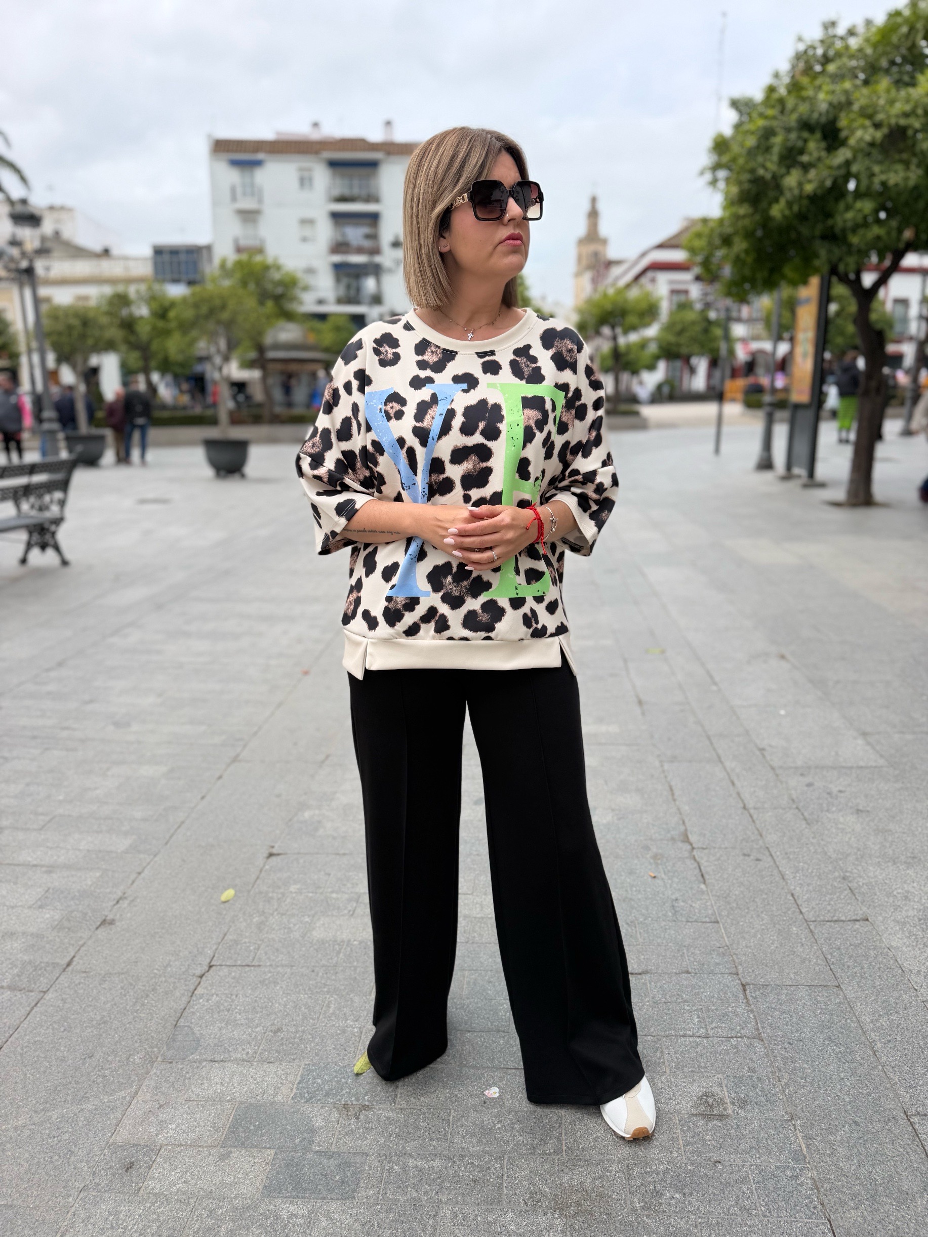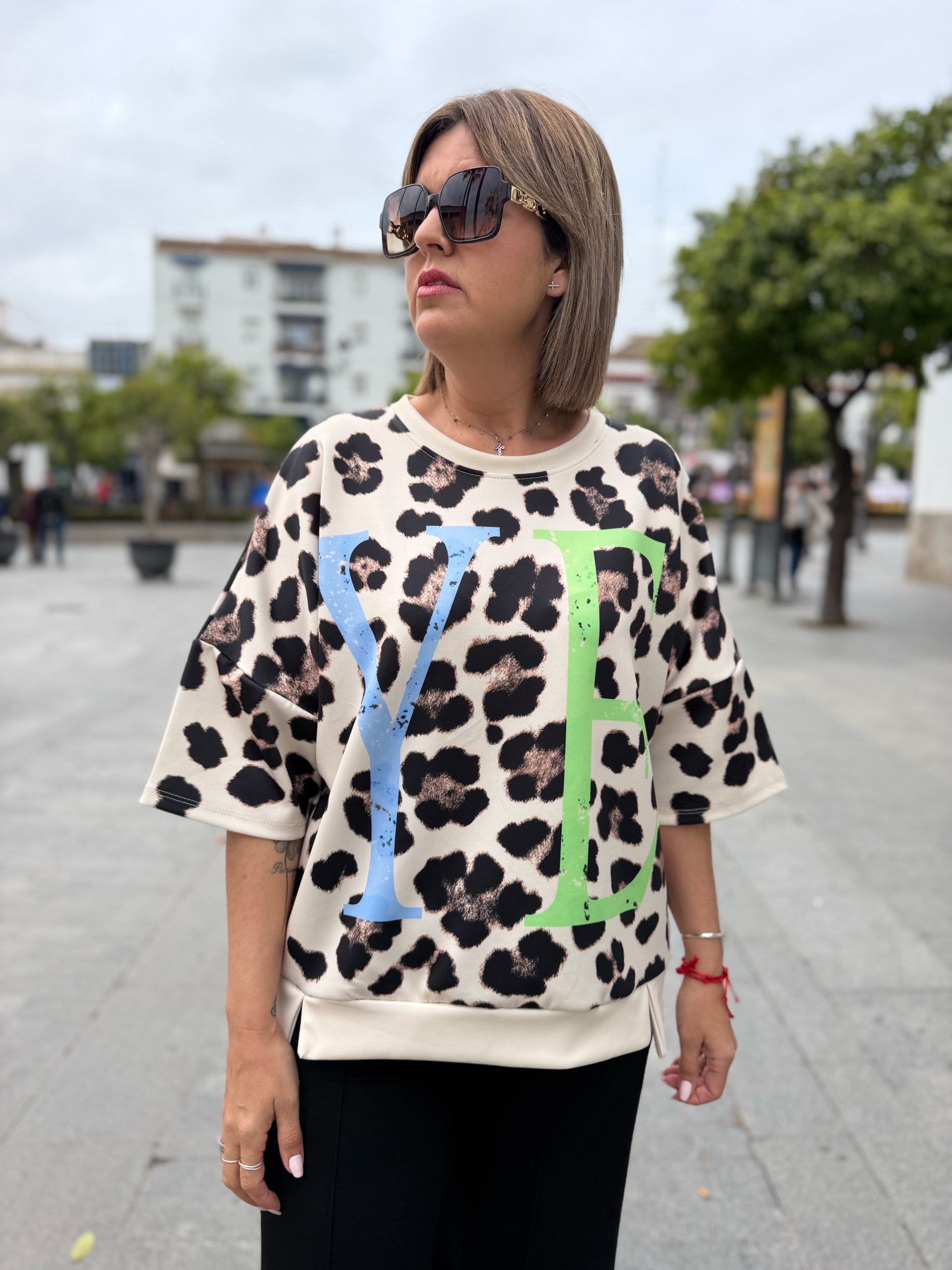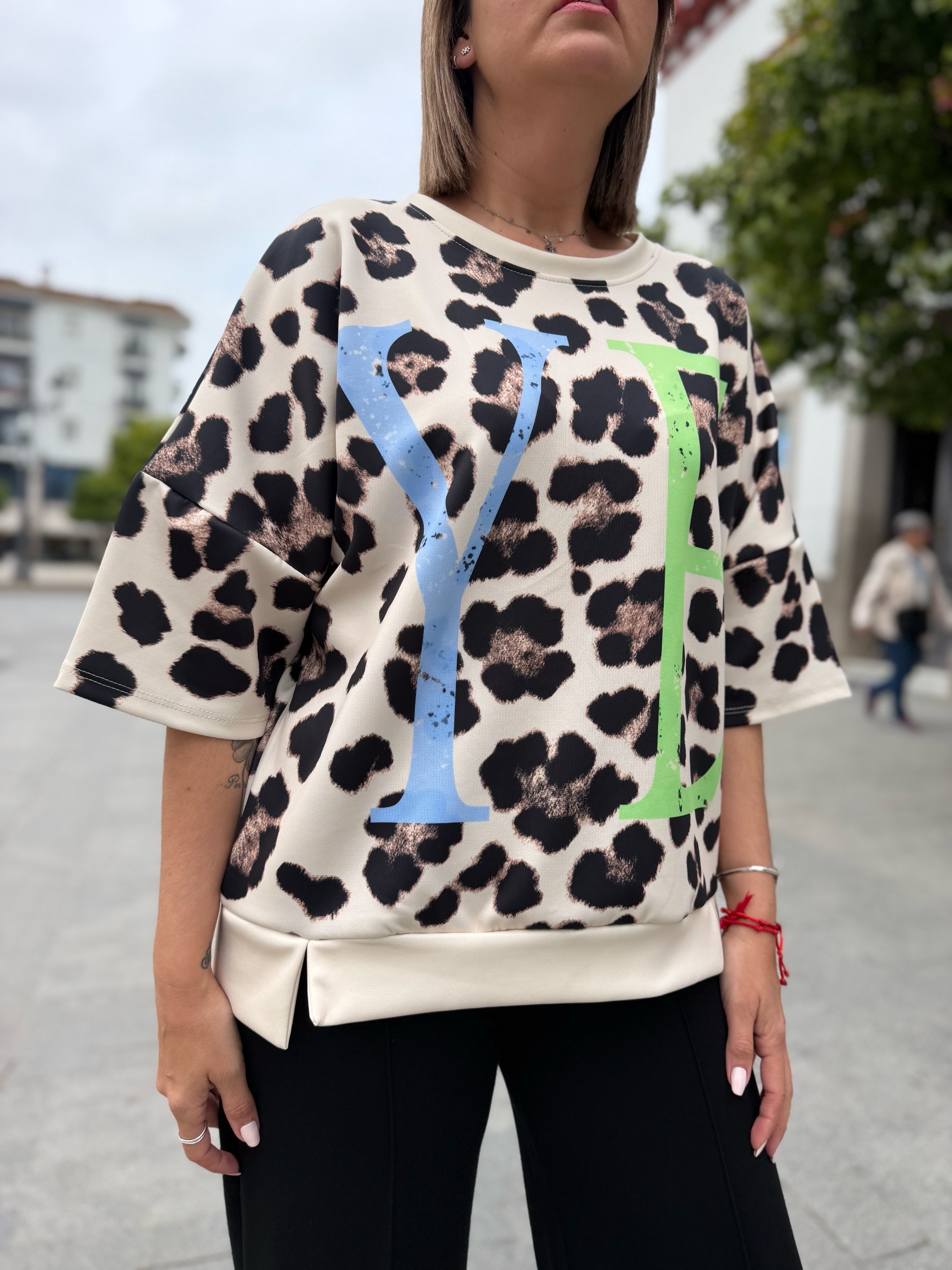 Es más una sudadera de manga corta que una camiseta jiji… ya que su tejido de capa de aire súper cómodo y súper fresco hace que sea la prenda perfecta para cualquier momento. En tallas únicas pero con ese rollo oversize que tan de moda está. Tienen un contorno de 130 ctms que hace que se adapte súper bien a casi todas las tallas porque mira que bien le queda a nuestra compi Sandra que usa una 38 pero puede valer a todassss!!!