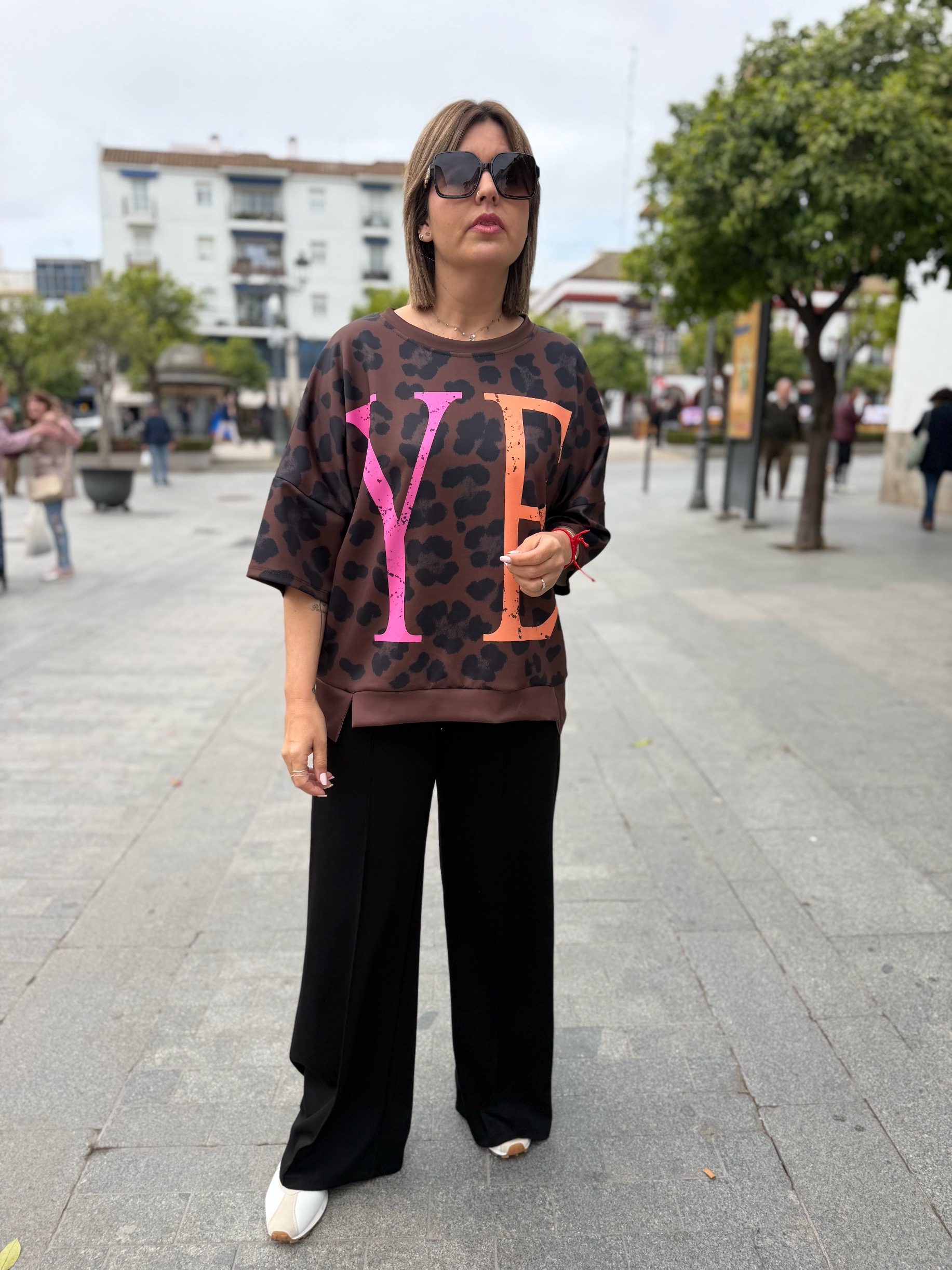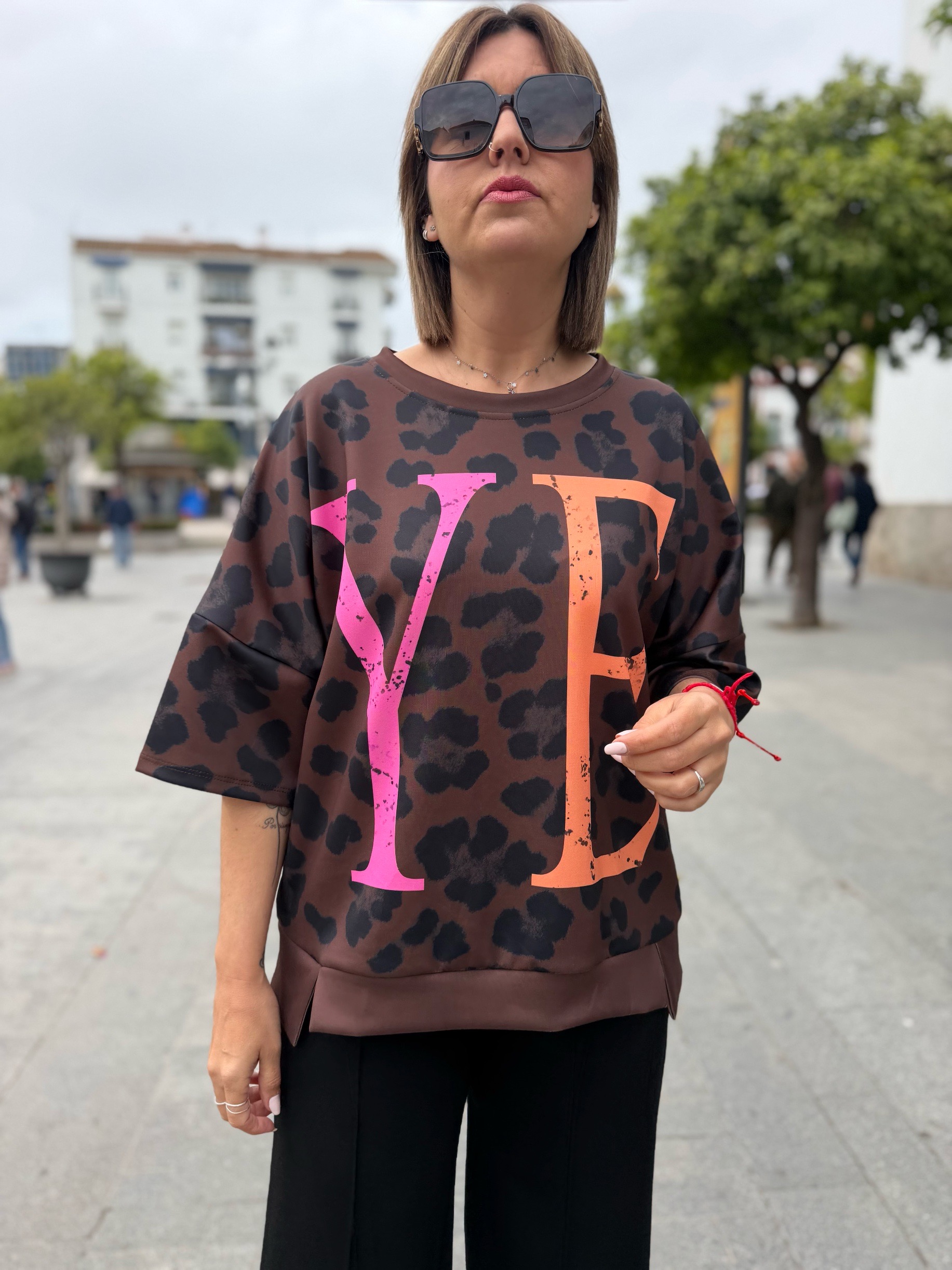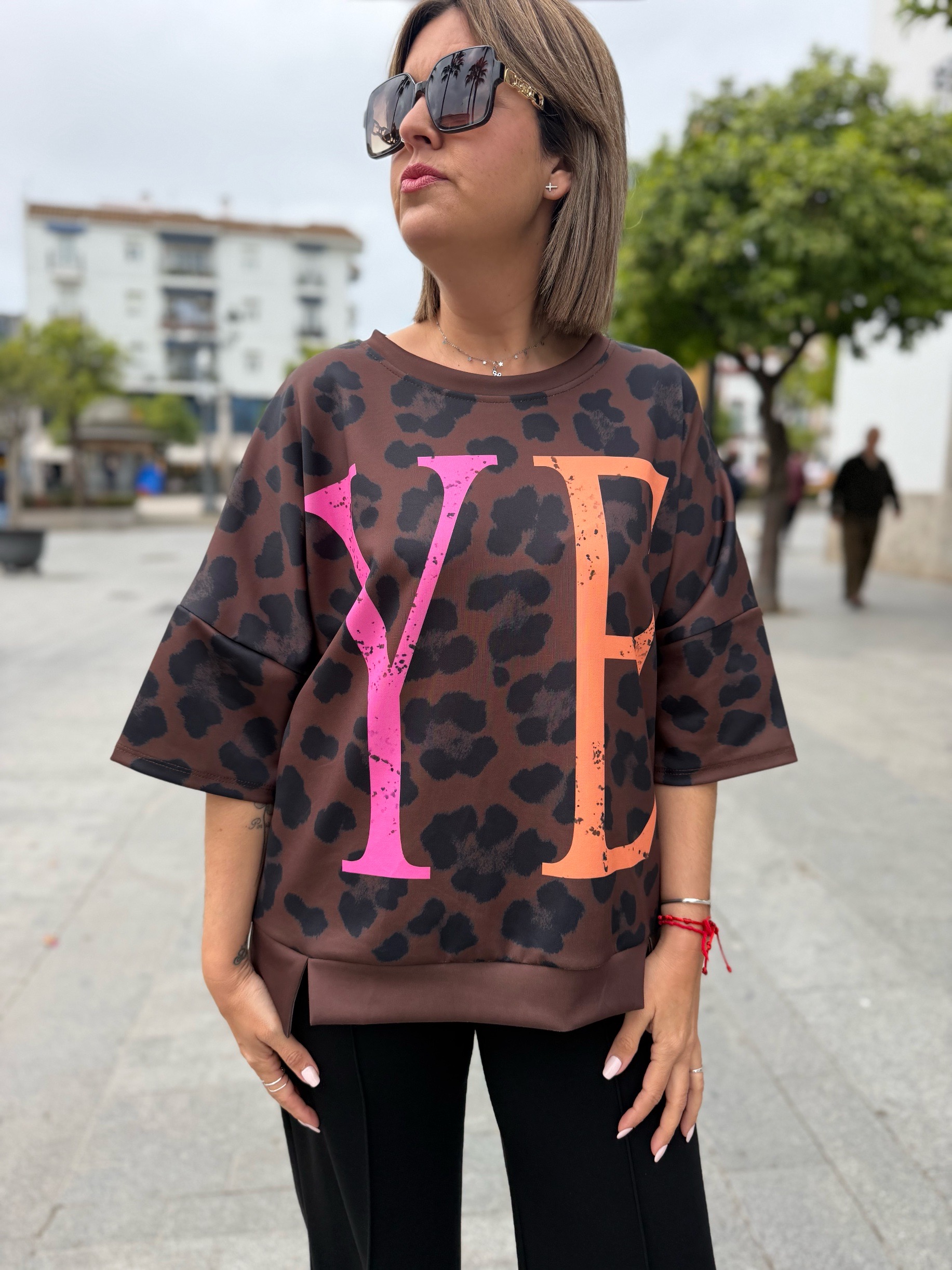 Es más una sudadera de manga corta que una camiseta jiji… ya que su tejido de capa de aire súper cómodo y súper fresco hace que sea la prenda perfecta para cualquier momento. En tallas únicas pero con ese rollo oversize que tan de moda está. Tienen un contorno de 130 ctms que hace que se adapte súper bien a casi todas las tallas porque mira que bien le queda a nuestra compi Sandra que usa una 38 pero puede valer a todassss!!!