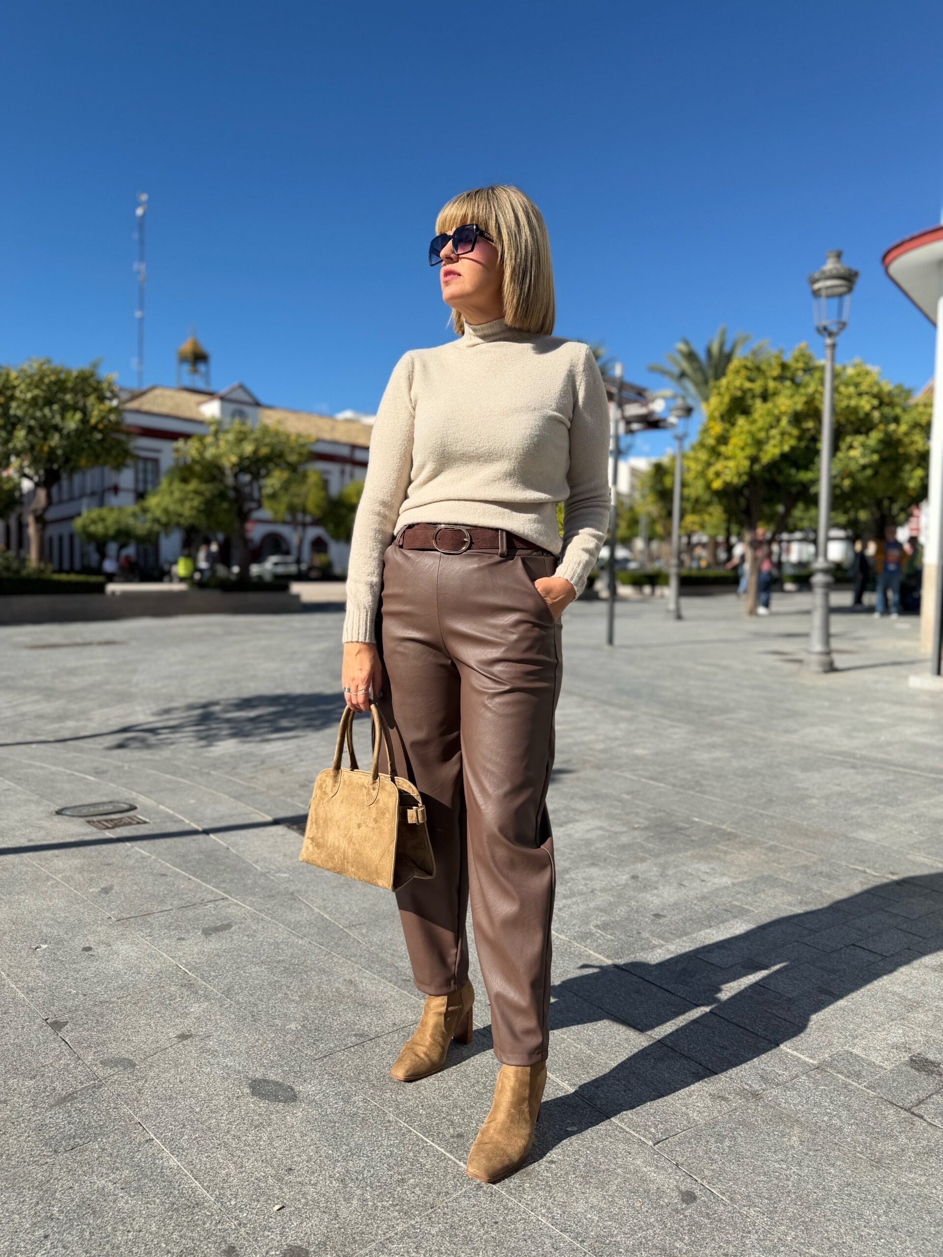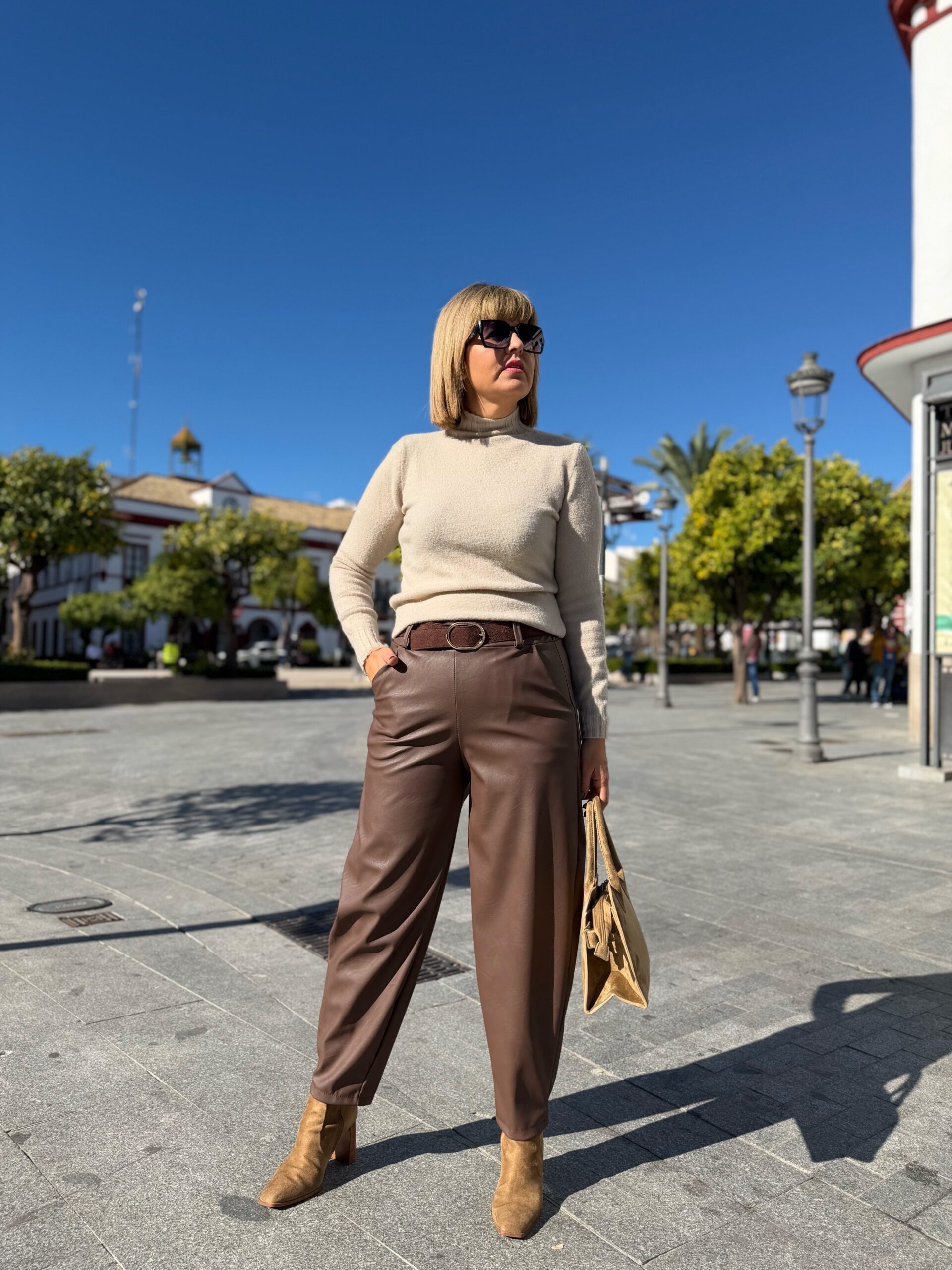 Pantalón con cinturón incluido en tejido de poli piel, con bolsillos y elástano que hace que aun siendo talla única (38-42) pero se adapte súper bien a todas las figuras. Con ese corte balón tan viral que le da un toque muy original y en tejido poli piel que hace que puedas montarte el outfit perfecto para estos días de fiesta que ya se acercan.