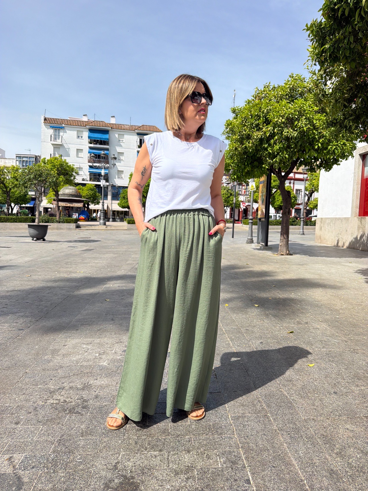 Pantalón de cinturilla elástica con bolsillos en tejido muy fluido, fresco y cómodo. En talla única pero que se adapta perfectamente a tallas de entre 38 a 46. Sin duda el pantalón perfecto del verano.