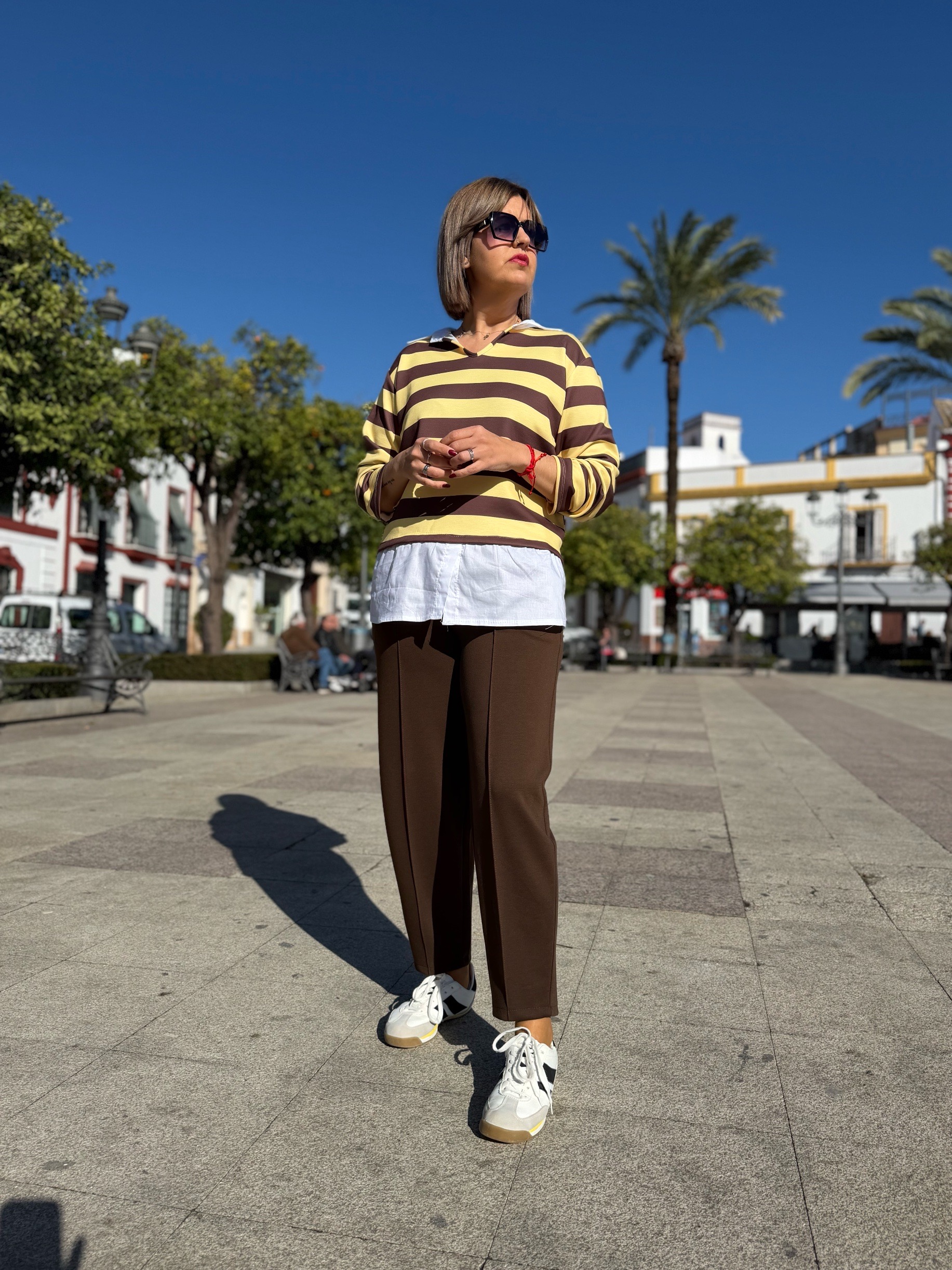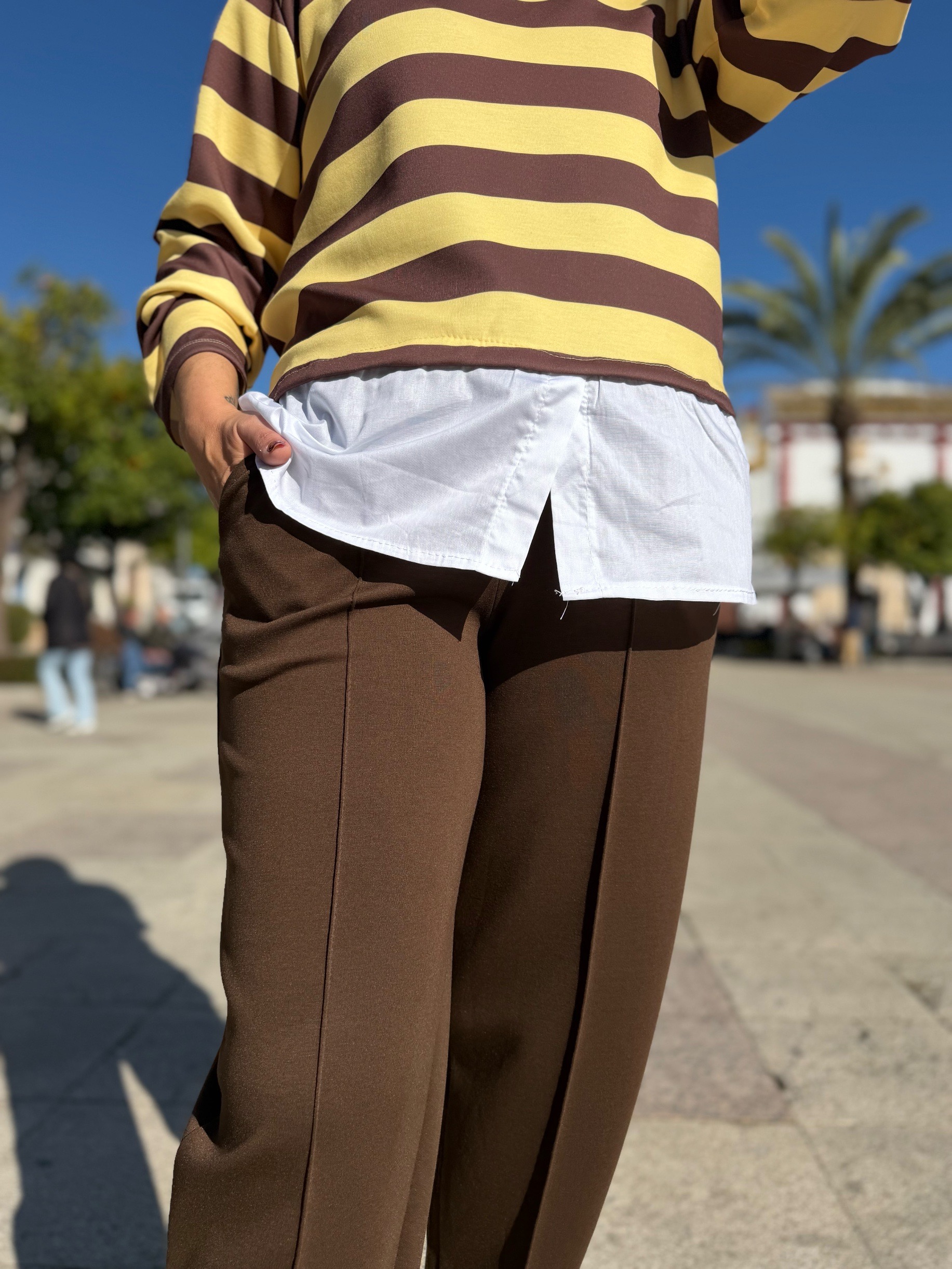 Pantalón en tejido de capa de aire que tan de moda está por su comodidad y sobre todo porque prácticamente no necesitas plancharlo jiji… con su costura vertical que estiliza tanto, cinturilla elástica con cordones ajustable y bolsillos y que aunque viene en talla única pero se adapta perfectamente a tallas entre 38 y 44.