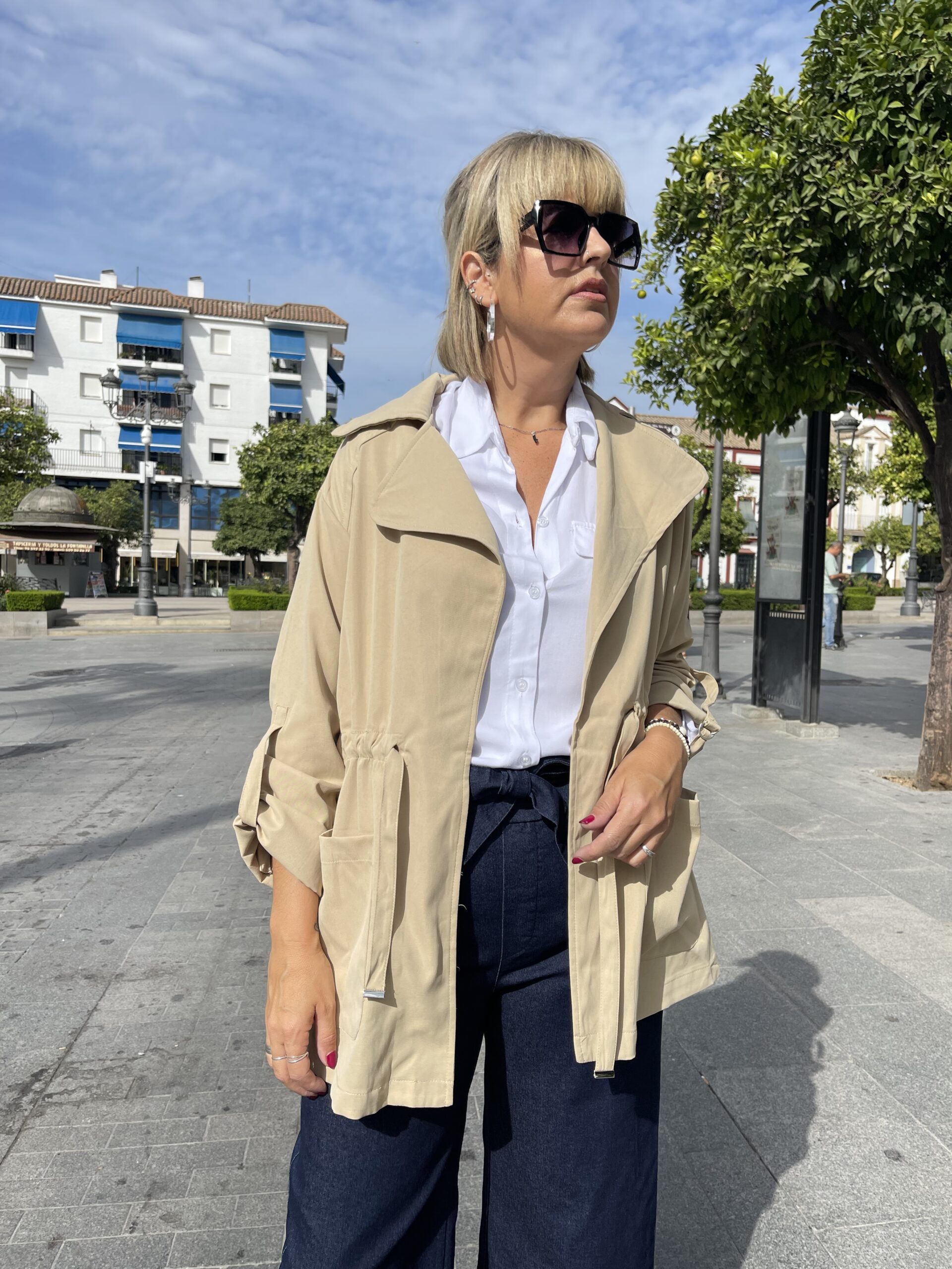 Parka tipo gabardina corta, abierta con cinturilla ajustable con cordones. Una chaqueta ligera que podrás combinar prácticamente con todo y te ayudará a completar un outfit con estilo propio. Es de esas chaquetas que te quedas mirando cuando alguien la lleva, por lo bien que queda y lo cómoda que es. En talla única que se adapta a tallas desde 38 a 46.