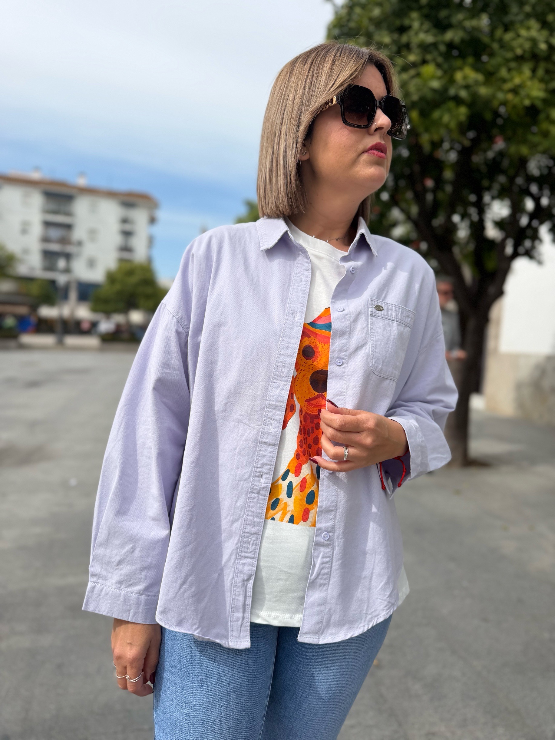 Sobre camisa en tejido simulando vaquera pero muy finito. Es la típica chaqueta de corte sobre cámisa finita e ideal para este tiempo que refresca por las mañanas pero luego el solito nos hace ponernos manguita corta, o esas tarde que sales con calor pero luego se escuende el sonido y te hace falta una chaquetitas. Pues esta es la ideal, cómoda y fácil de llevar por su ligereza. En talla única y corte oversize (130 ctms de contorno).