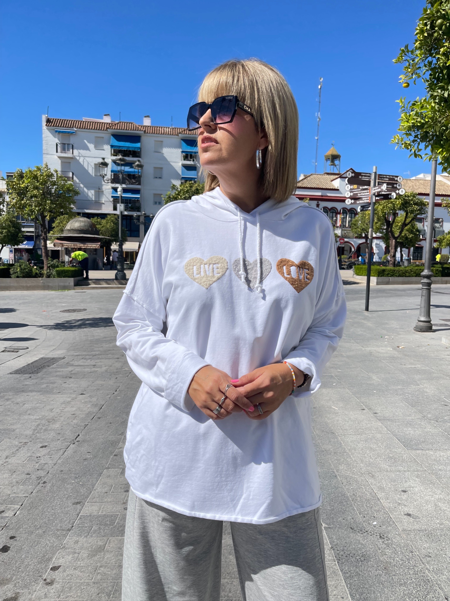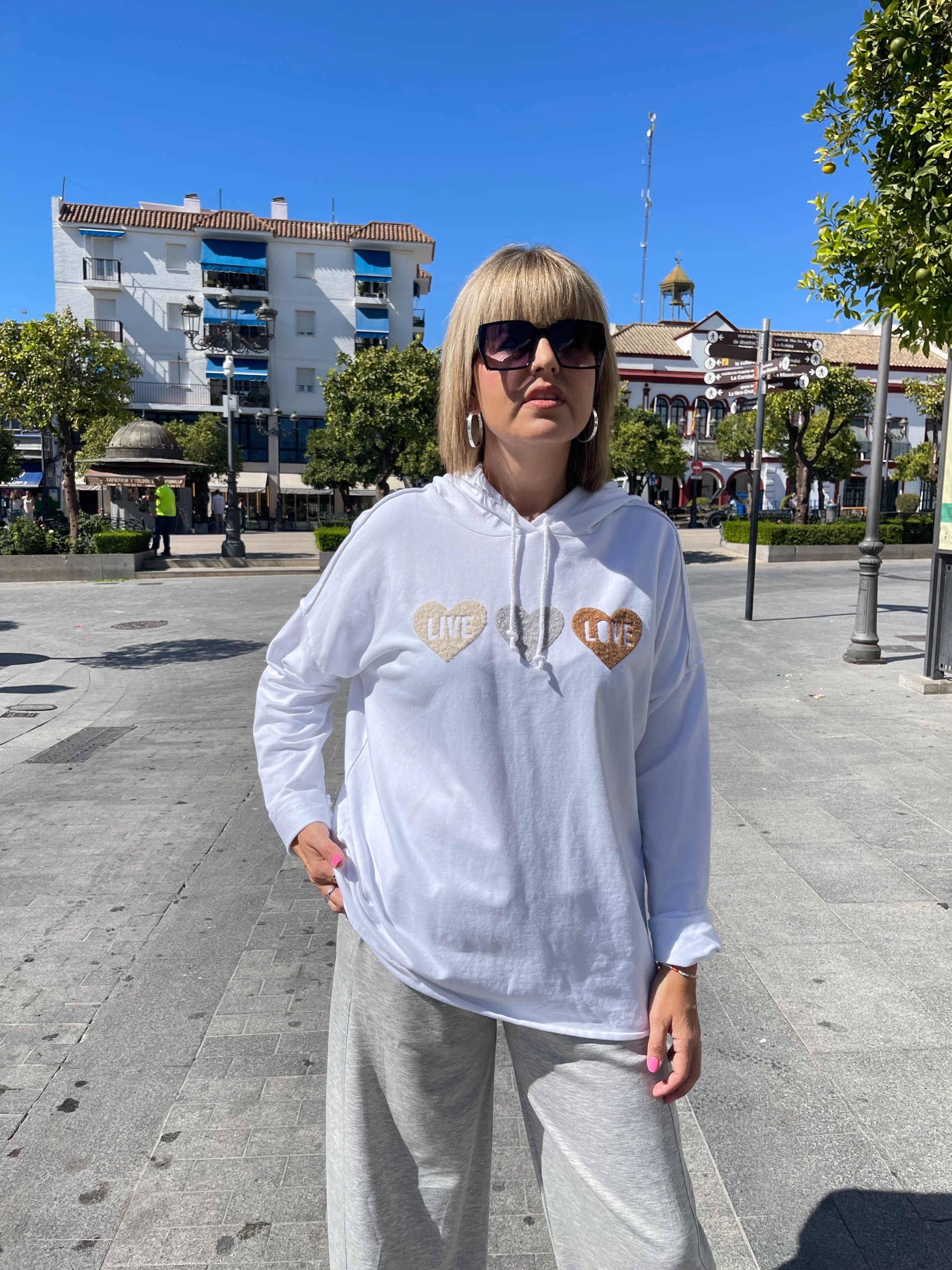 Sudadera en tejido de algodón, con capucha y detalle de tres corazones en relieve en el pecho. Combinable prácticamente con todo y un corte anchito y larga de las que tapan el culote jiji…