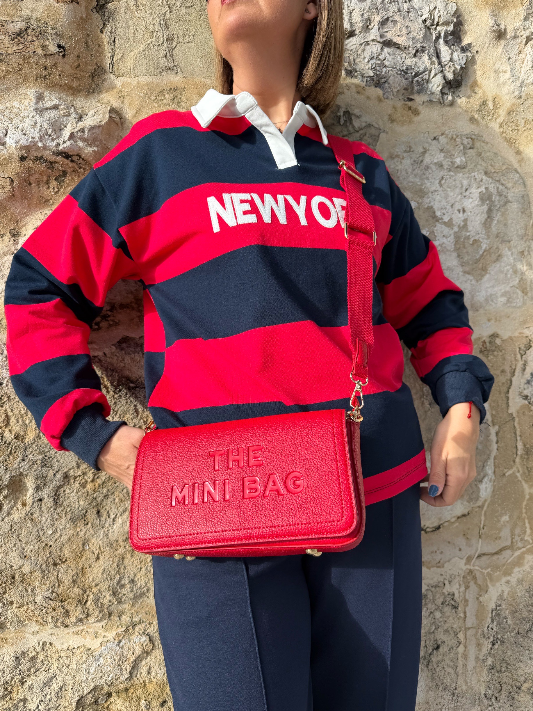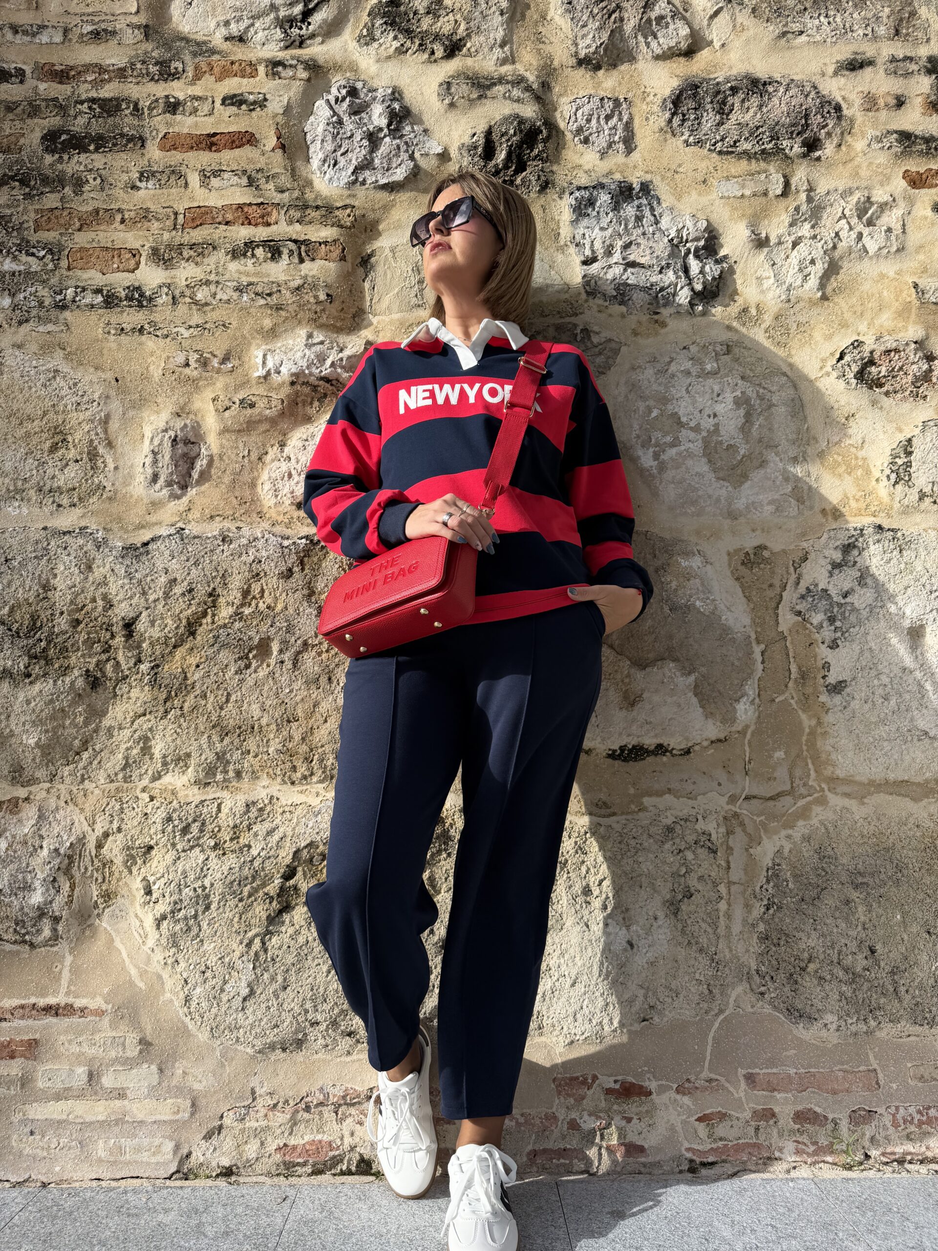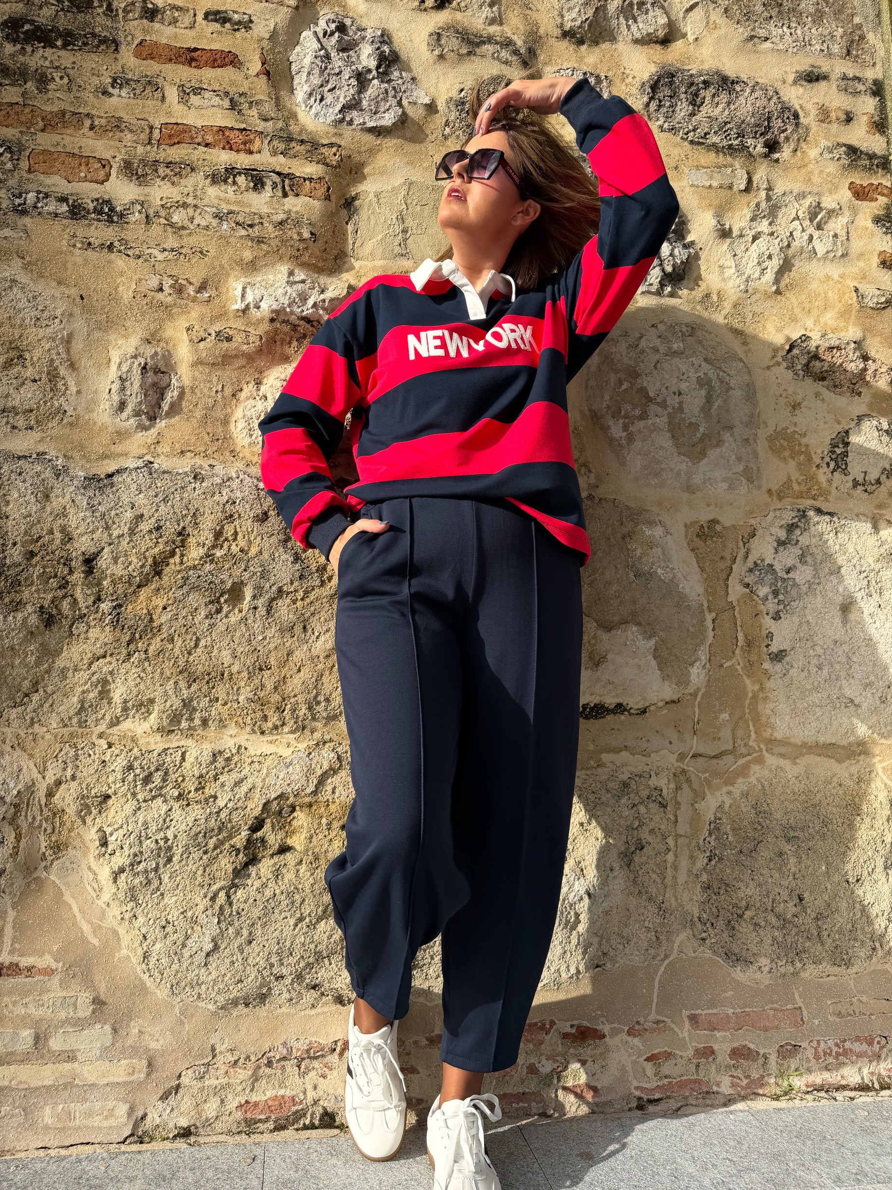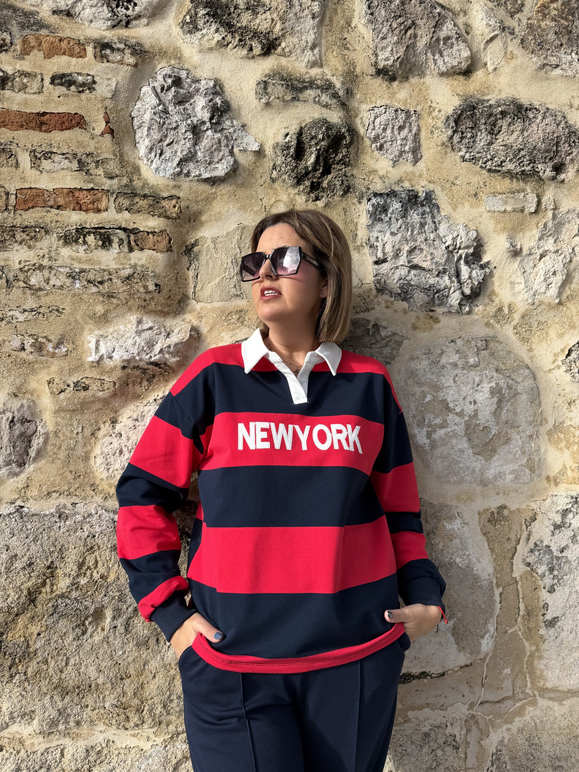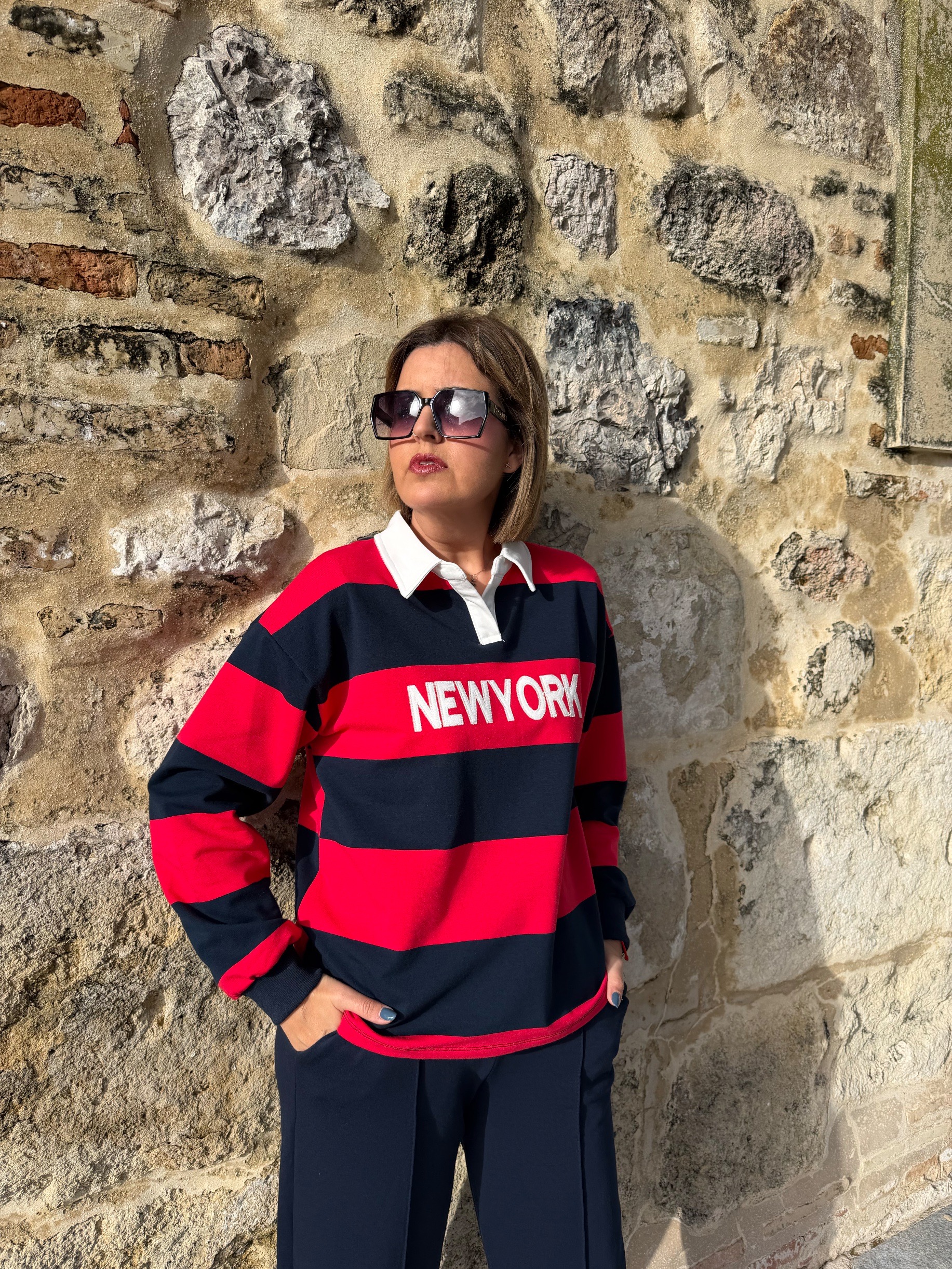 La sudadera New York llega para convertirse en el básico con estilo que no puede faltar esta temporada. Su diseño de inspiración sporty-chic, combinado con su favorecedor cuello tipo polo, la convierten en una prenda moderna, cómoda y súper versátil para el día a día.