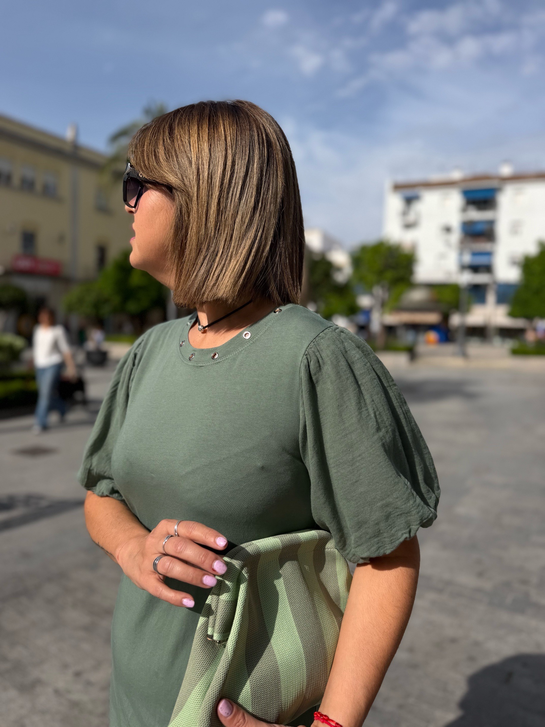 Confeccionado en algodón con alta elasticidad, se adapta suavemente al cuerpo realzando la silueta sin marcar, ofreciendo una sensación de confort durante todo el día. Sus mangas abullonadas en tejido de lino añaden ese aire especial y actual que eleva cualquier look, haciéndolo ideal tanto para el día a día como para ocasiones más especiales.