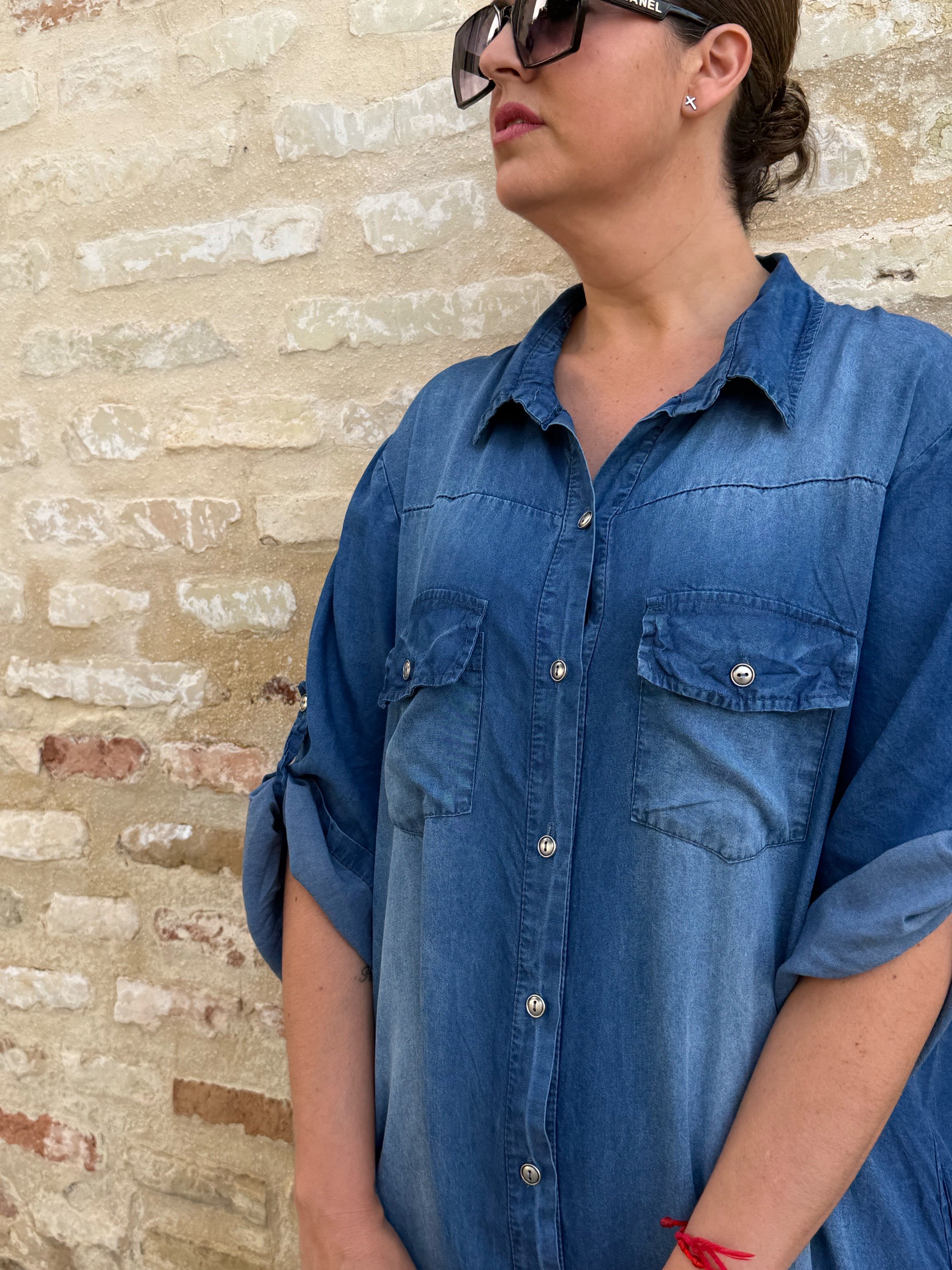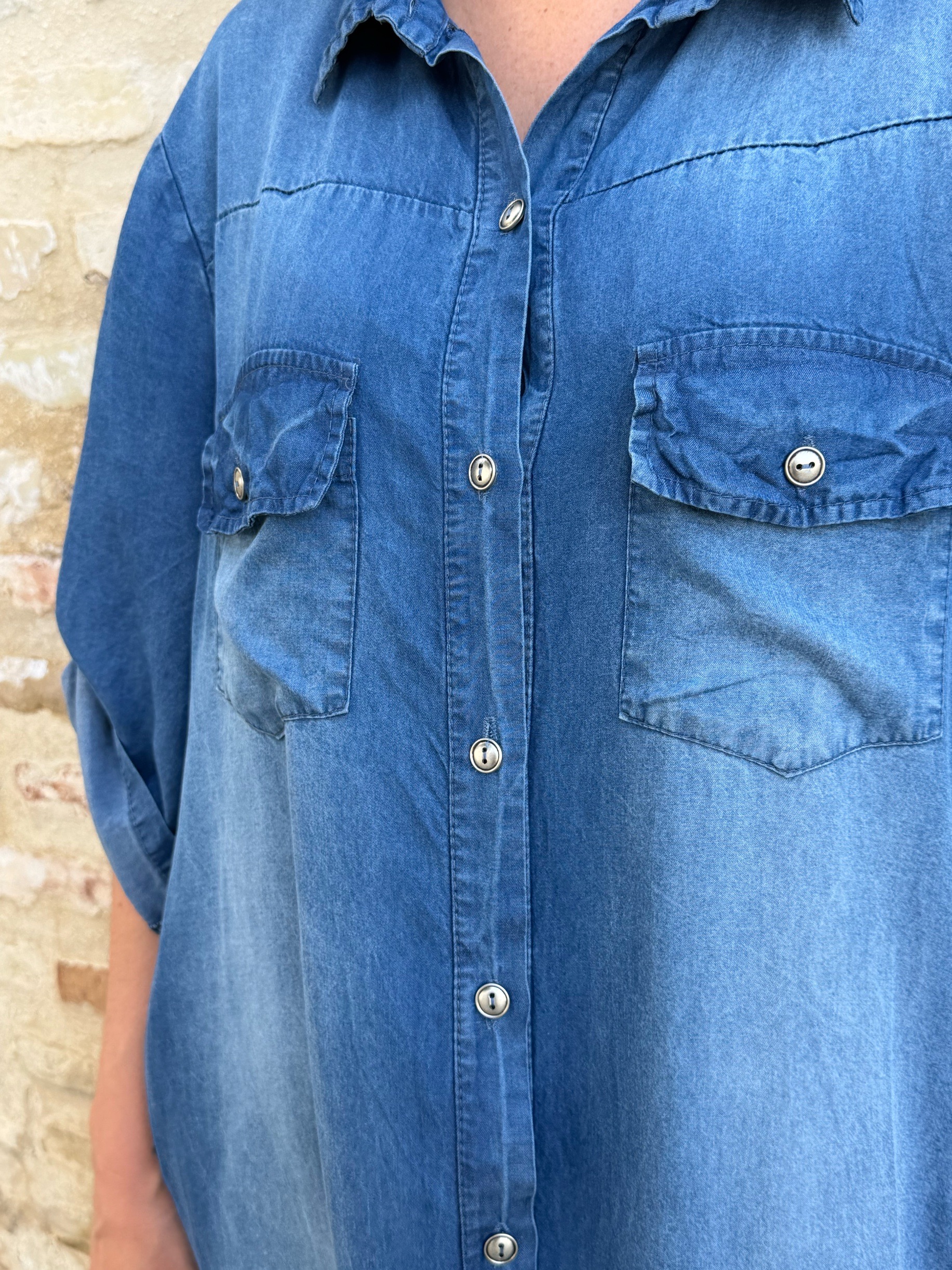 Su diseño camisero con botonadura frontal y bolsillos en el pecho aporta un aire casual y actual, mientras que su corte amplio y su caída suave hacen que siente bien en todo tipo de siluetas.