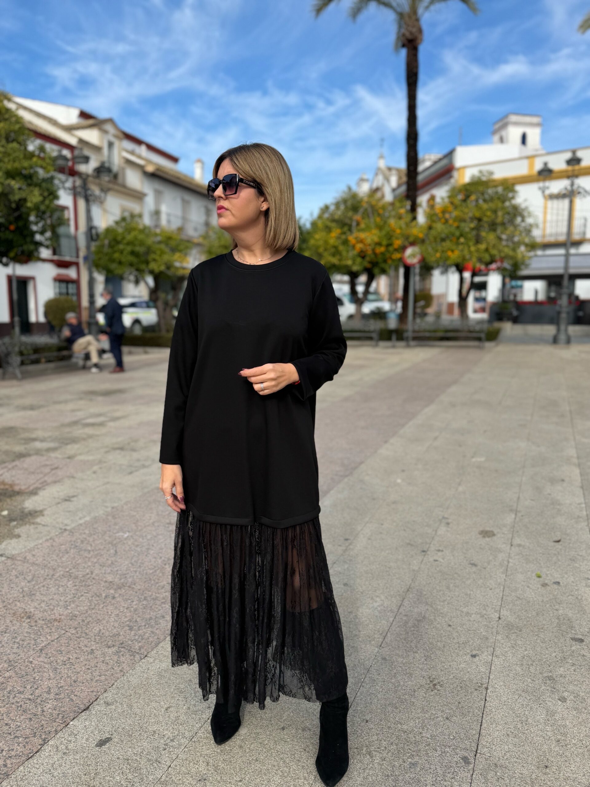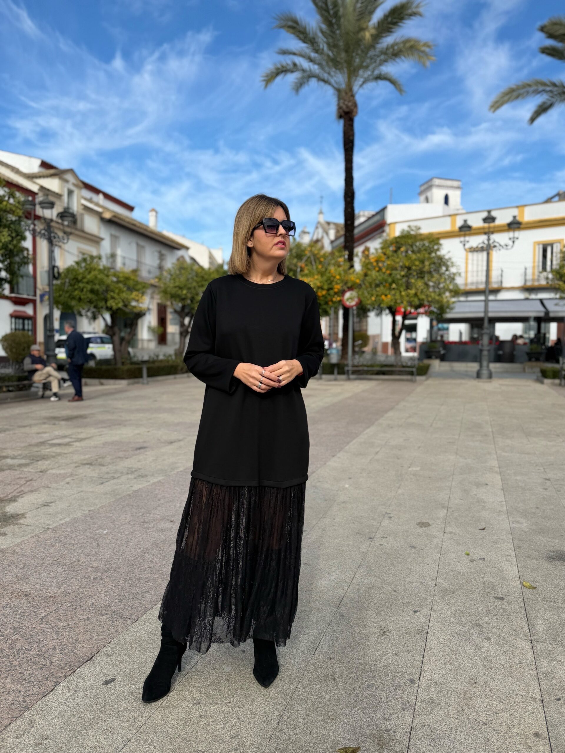 Vestido que combina el tejido de capa de aire tan comodísimo y confortable con su parte baja de encaje que le da un toque súper sofisticado. Ideal para ir cómoda y con estilo a cualquier sitio que te propongas jajaja….