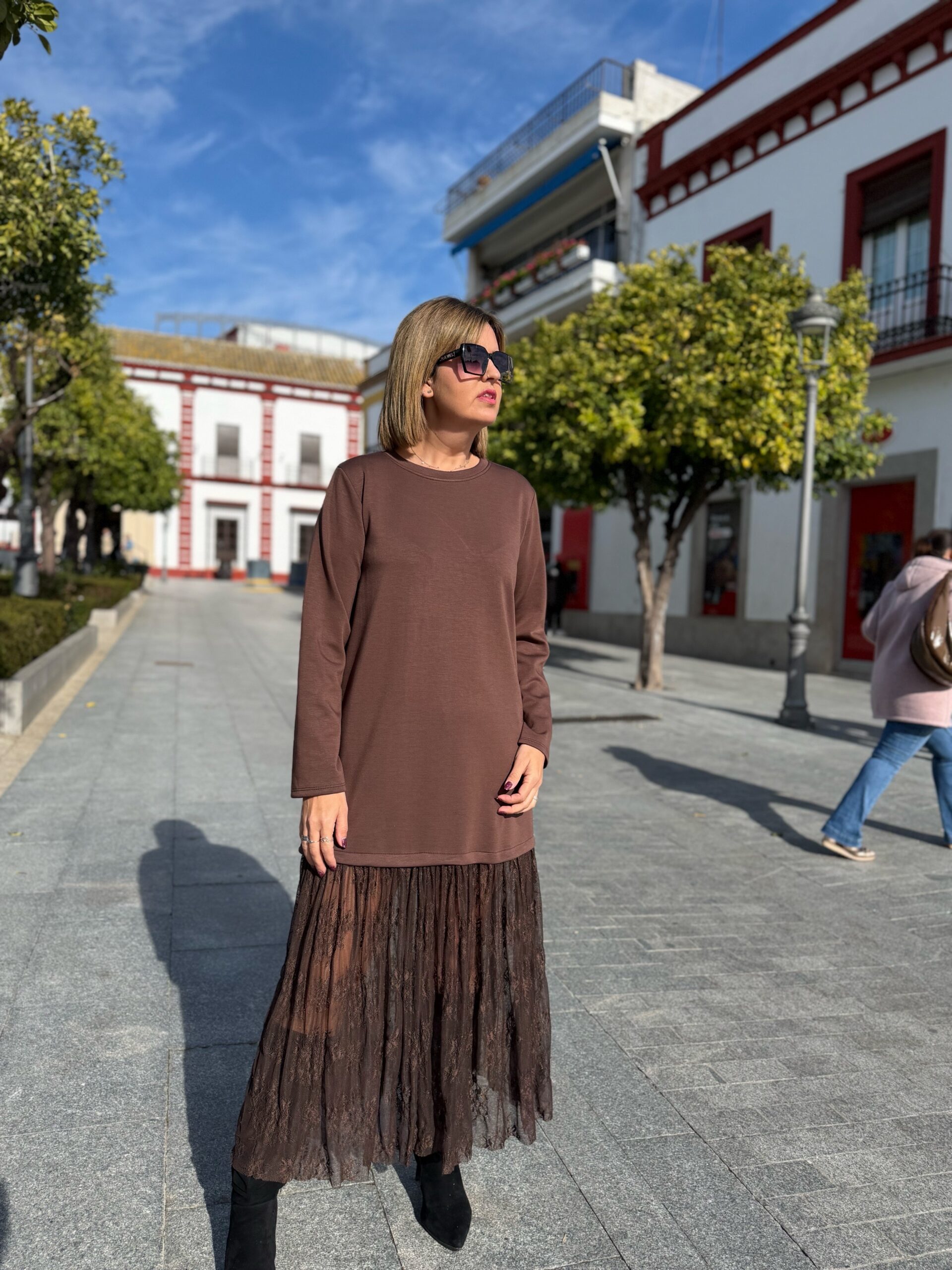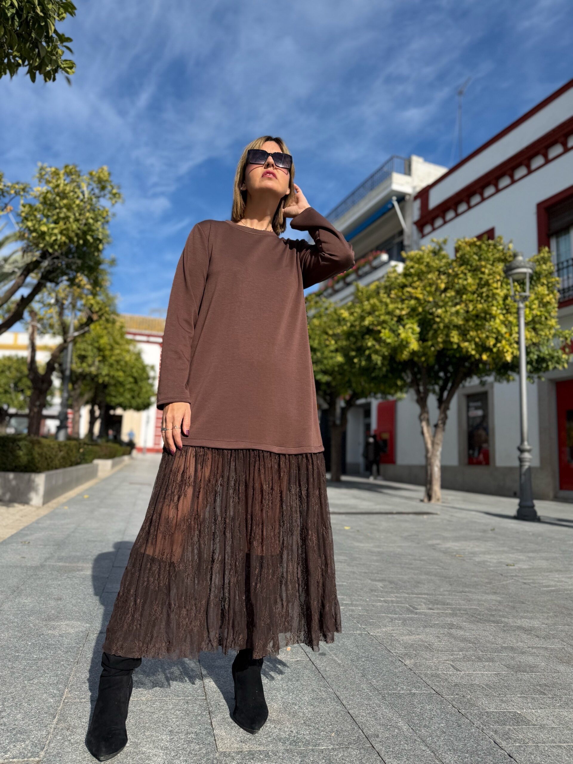 Vestido que combina el tejido de capa de aire tan comodísimo y confortable con su parte baja de encaje que le da un toque súper sofisticado. Ideal para ir cómoda y con estilo a cualquier sitio que te propongas jajaja….