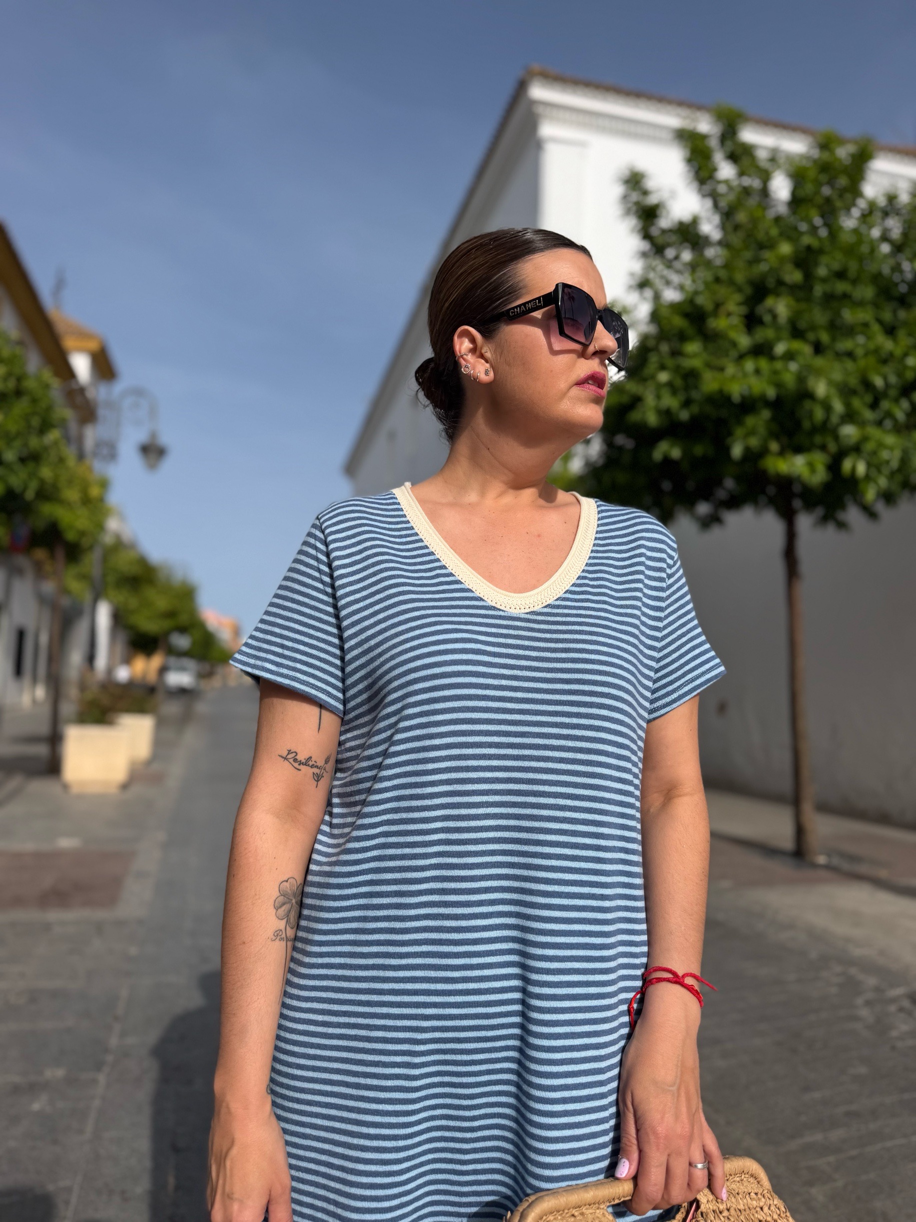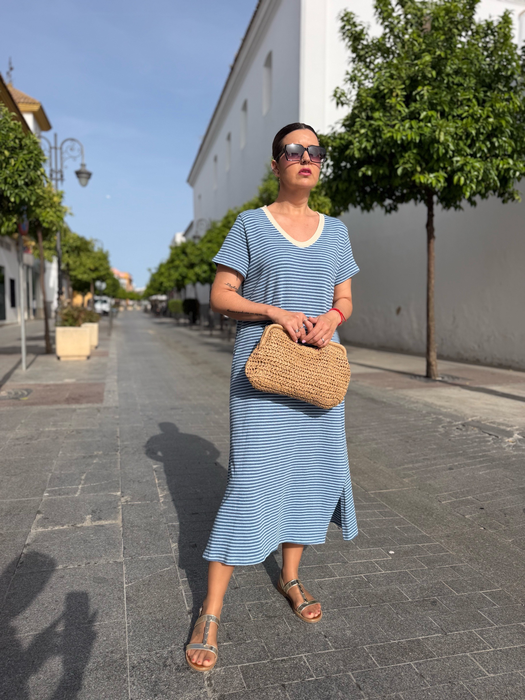 Vestido en tejido de punto fino, muy fresco y cómodo, que no señala nada y que con su ello de pico le da un toque aún más veraniego de lo que es. Ideal para prácticamente todo, el día a día, un tardeo, trabajar con estilo, incluso un día de playa o piscina. Todo para lo que quieras ir cómoda y con estilo. En talla única pero que abarca tallas desde 38 a 44 perfectamente.